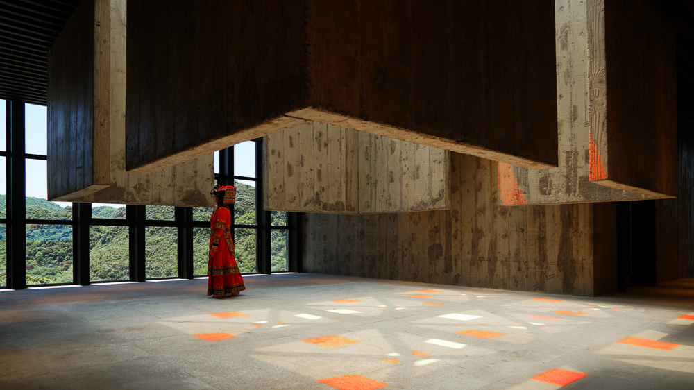 The construction system is based on concrete technology mixed with local sand. The sand mixture helps engrave the wooden texture given by the formworks, realized with recycled panels from declining Yi houses and local pine wood. The rough concrete interiors together with the black metal window frames and ceiling help frame the outdoor landscape, making it the protagonist of the interior atmosphere. The three floors are characterized by a free plan where two structural units combine all the main service functions; this spatial production mode derives from the so called ‘group technology,’ typical of Guizhou mountain villages. The indoor hanging courtyard, with its red and yellow skylights, creates a holy atmosphere and a sense of ritual space from the contrast between the colored lights and dark space below. The indoor atmosphere is kept dark on purpose so the outdoor bright scenery can stand out; visitors become silent wonderers of the wild grassland and are immersed in a suspended time as gazers of history. The spatial indoor layout combines the ritual mnemonic structure with a more contemporary functional system. Yi Cultural Center aims to become a wordless monument which stands alone resembling Yi culture through symbolism and in creating a ritual atmosphere.