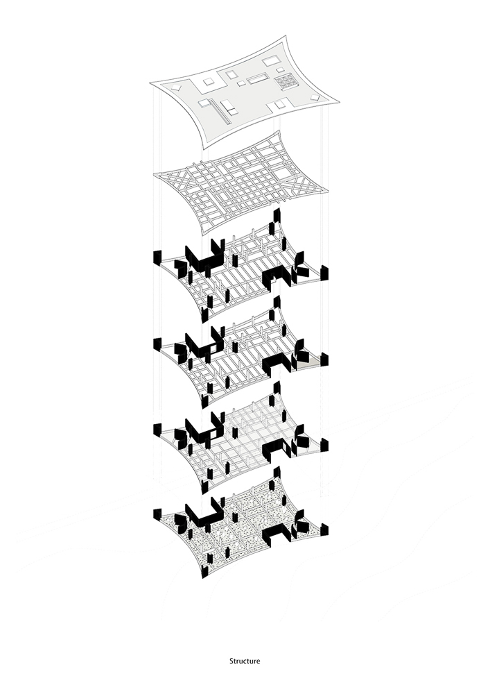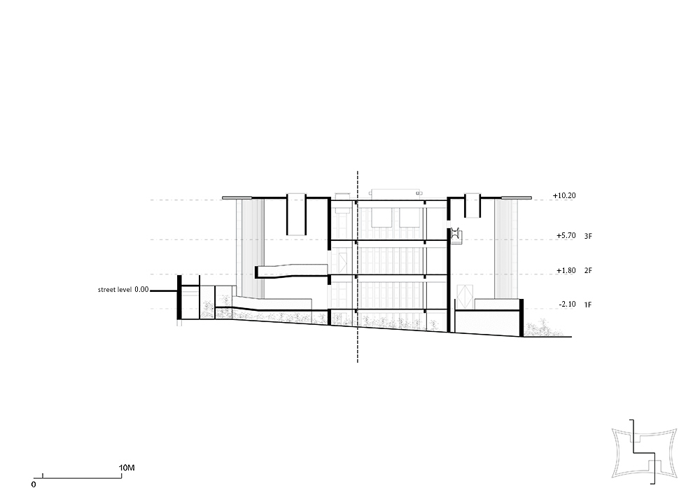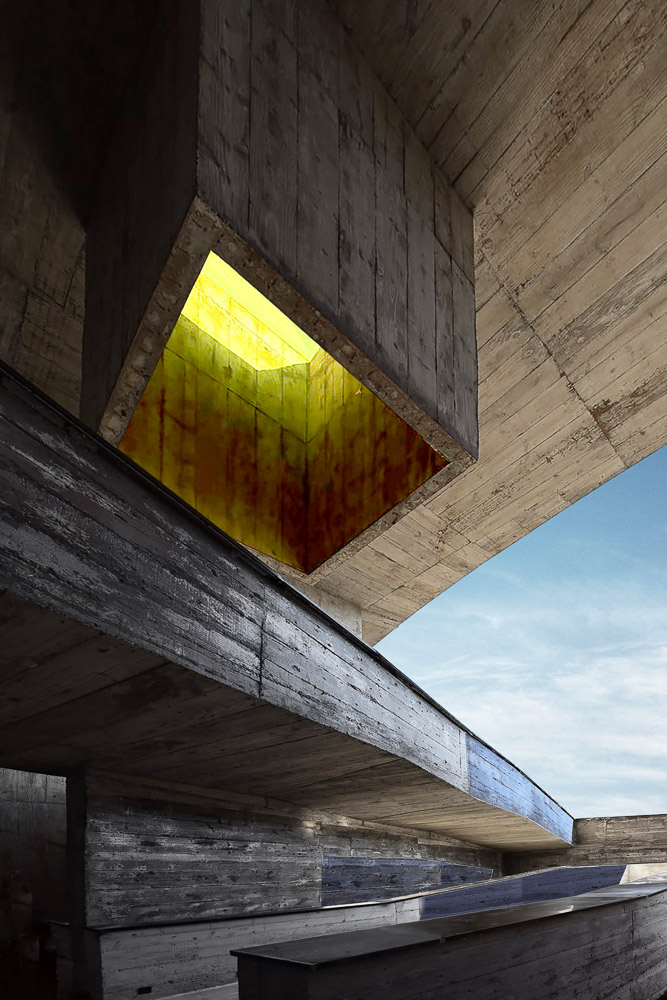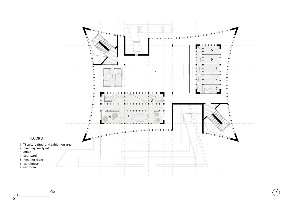 First of all the building mass resembles the traditional Yi sacrificial altar, where sacrifices refer to offers. The building, in its simple volume, is characterized by an iconic roof consisting of a concave arc. This architectural gesture aims to show a response to the tension of nature, and again refers to Yi sacrificial symbols. The roof establishes a dialogue with the sky through the skylight system and the concave shape works as a rain water collector. Via the gutter system the water vertically flows through the outdoor courtyards, creating a vertical connection of light and rain throughout the building, while solving the internal lighting and ventilation.