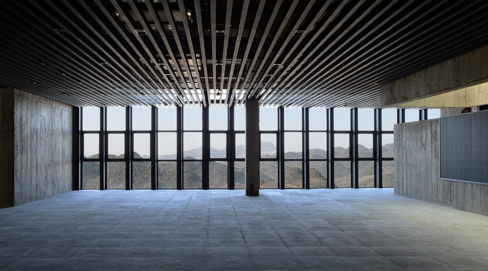 건설 시스템은 현지 모래를 혼합한 콘크리트 기술을 기반으로 한다. 거친 느낌의 콘크리트 인테리어, 검은색 금속 창틀, 천장이 야외 풍경의 틀을 잡아주어 실내 분위기를 만든다. 3개 층의 특징은 2개의 구조적 단위가 모든 주요 서비스 기능을 결합하는 자유로운 평면이다. 이 공간적 생산 방식은 귀주 산촌의 전형인 ‘집단 기술’에서 파생되었다. 붉은색과 노란색의 채광 창이 있는 실내의 마당은 아래의 색색 조명과 어두운 공간의 대비를 통해 신성한 분위기와 의례적인 공간감을