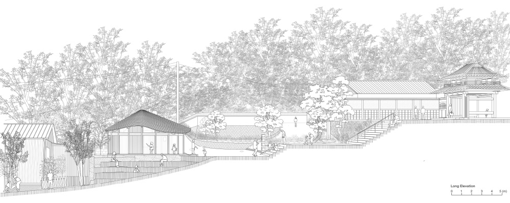 The roof, undulating in harmony with the surrounding natural environment, uses the elegantly curved roof of shrines and temples as a metaphor. The form of the roof is defined by the context of the site. Its outline follows the edge of the gentle slope, and the open frontage, when looked from down the slope, provides a sequential experience with the temple. When seen from the top of the slope, the conical form mimics the surrounding mountains, completing the landscape as a foreground. Thus, the curved lines are drawn not only by my intention but also in accordance with the history and the landscape. A line drawn in such a way can be beautiful.