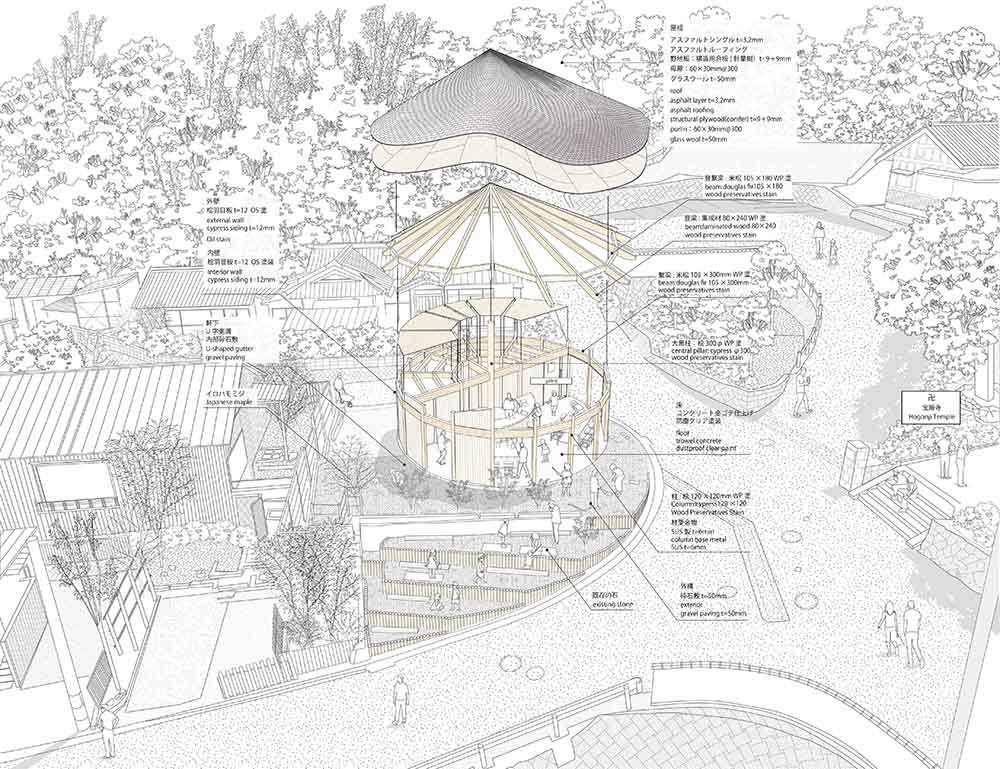 What brings them together as architecture is the structural system centered around the main column. The column is decentered on a circular plan with a diameter of 7,800mm. The climbing beams, which rest on the peripheral columns of different heights, meet at the main column to form the three-dimensional surface of the timber roof floating in the air. The deviated center generates a mountain-shaped design with deep eaves and maximizes the space for activities as doma (earthen floor)/ gallery while downsizing the semicircular interior space. When seen from inside, the undulating eaves gently frame the surrounding landscape, opening up the space of less than 20 tsubo.