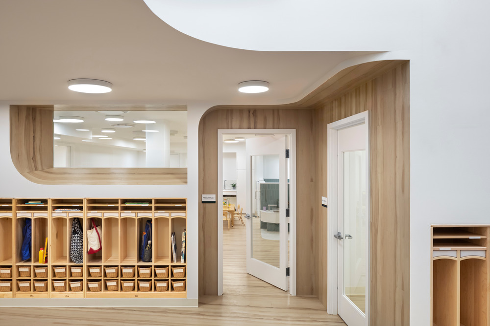 City Kids is a new childhood education center located in Williamsburg, Brooklyn. Six preschool classrooms open onto a central double height courtyard gathering space lit by a large storefront window. The courtyard features a thickened wall that incorporates the reception desk and storage cubbies and provides a central gathering space for the classrooms. Windows of varying shapes and sizes in the interior façade allow borrowed light to enter the surrounding spaces on both levels and provide visual access for children and teachers. The classrooms are interconnected through double doors and through shared spaces such as bathrooms and play sinks, with half height walls that allow for visual privacy for the kids and monitoring capability for the teachers.