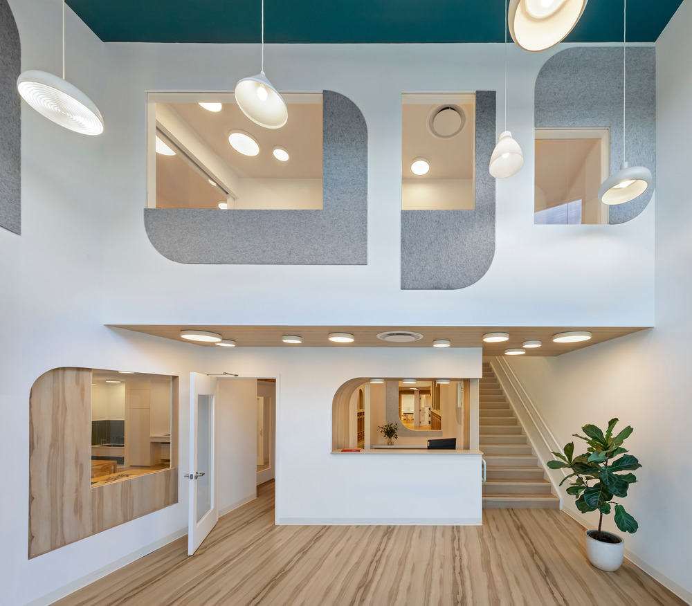 The after school program for elementary school students is accessed up the stairs at the reception area. Apertures bring light and views to the courtyard and the street. Lockers wrap the courtyard volume, in the form of a city skyline. Specialized classrooms for cooking, theater, STEM, and movement are accessed off of the upper hallway. A lounge with bleacher seats provides a place for informal gathering. Light fixtures of different types and sizes are suspended to provide an animated ceiling plane. Plank flooring is also used to wrap the entries to the classrooms and windows. Acoustical felt panels cut into graphic shapes provide visual interest. The pandemic prompted some ventilation improvements in the form of electronic and ultraviolet light HVAC filters, touchless security and check in points, as well as the addition of operable windows to bring light and air to all classrooms.