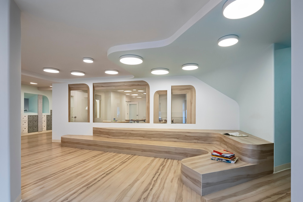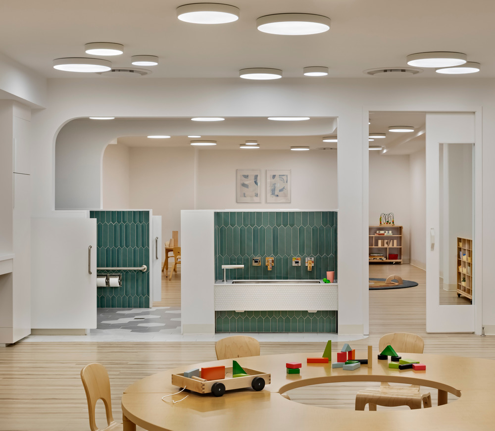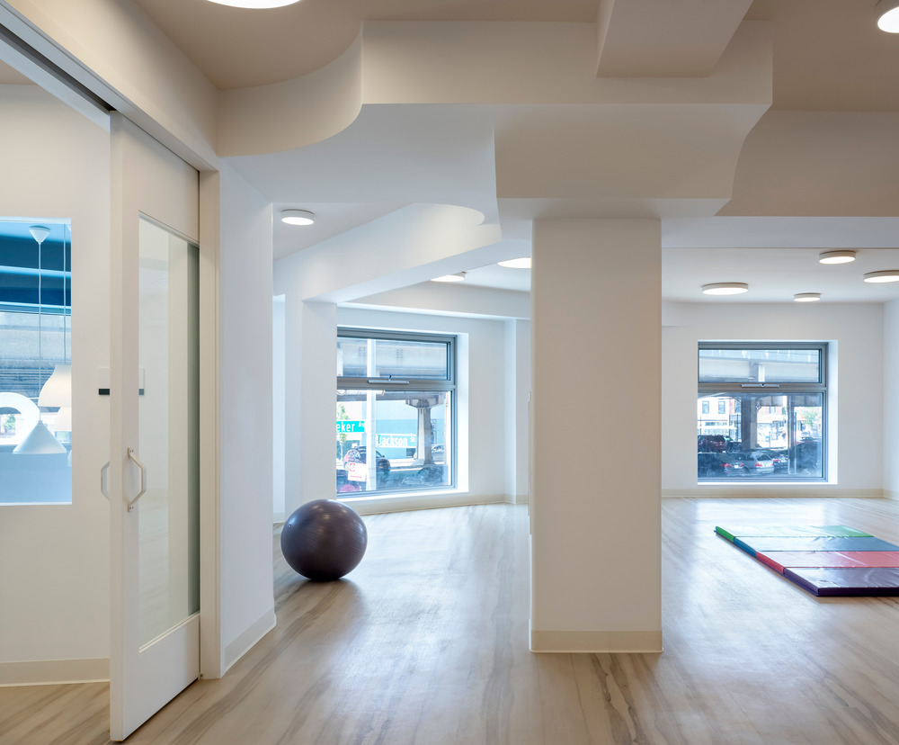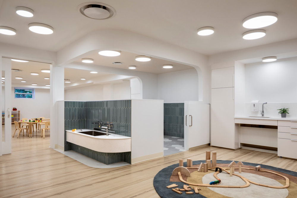 City Kids is a new childhood education center located in Williamsburg, Brooklyn. Six preschool classrooms open onto a central double height courtyard gathering space lit by a large storefront window. The courtyard features a thickened wall that incorporates the reception desk and storage cubbies and provides a central gathering space for the classrooms. Windows of varying shapes and sizes in the interior façade allow borrowed light to enter the surrounding spaces on both levels and provide visual access for children and teachers. The classrooms are interconnected through double doors and through shared spaces such as bathrooms and play sinks, with half height walls that allow for visual privacy for the kids and monitoring capability for the teachers.