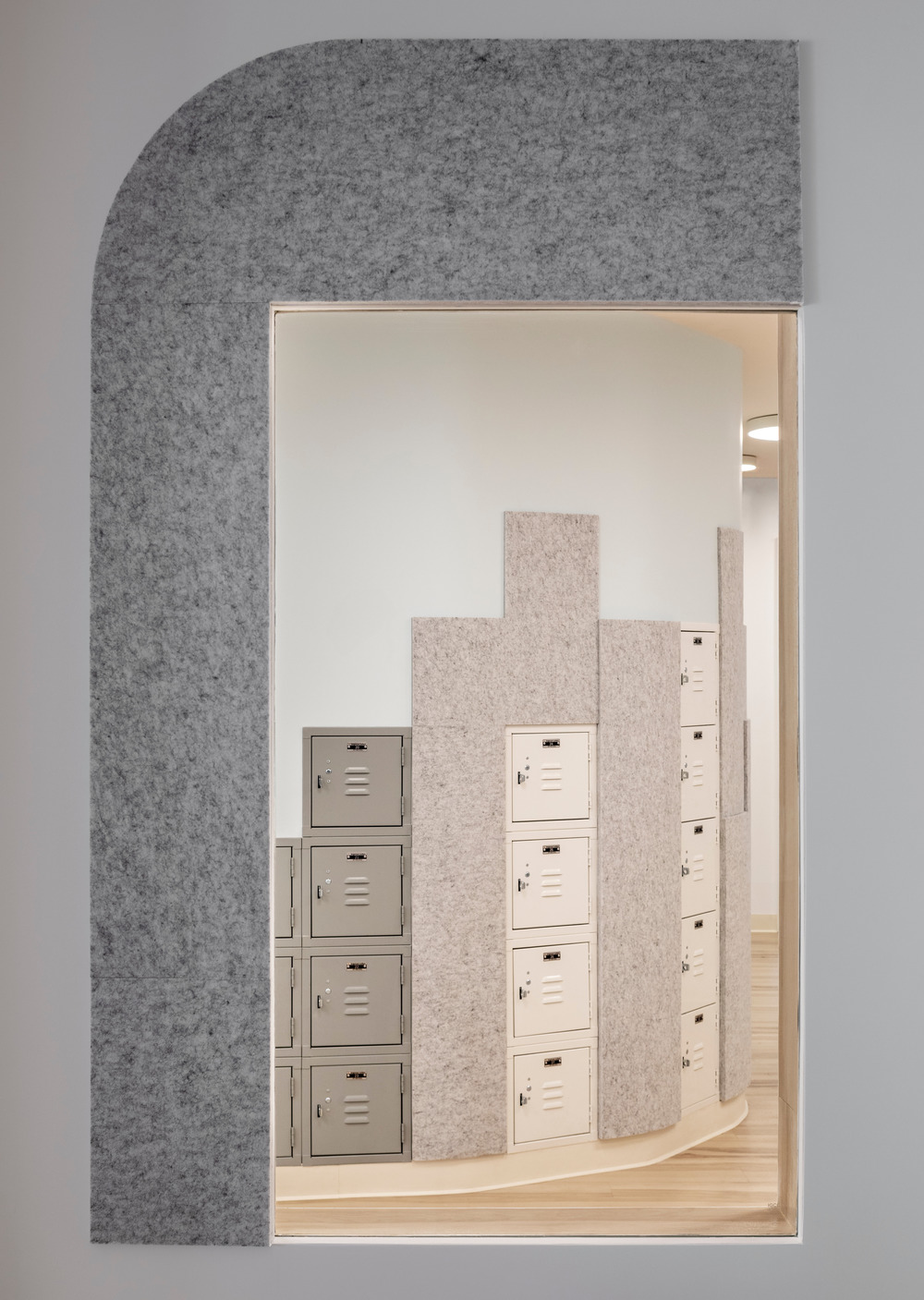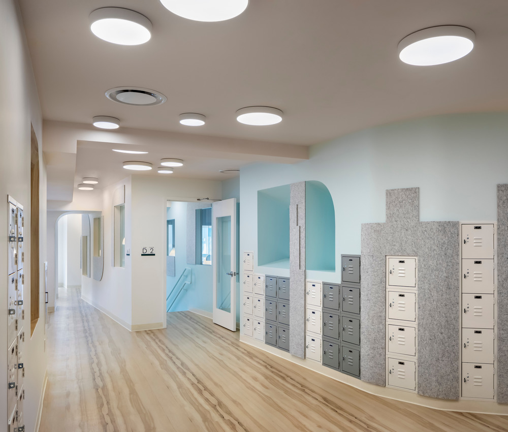 The after school program for elementary school students is accessed up the stairs at the reception area. Apertures bring light and views to the courtyard and the street. Lockers wrap the courtyard volume, in the form of a city skyline. Specialized classrooms for cooking, theater, STEM, and movement are accessed off of the upper hallway. A lounge with bleacher seats provides a place for informal gathering. Light fixtures of different types and sizes are suspended to provide an animated ceiling plane. Plank flooring is also used to wrap the entries to the classrooms and windows. Acoustical felt panels cut into graphic shapes provide visual interest. The pandemic prompted some ventilation improvements in the form of electronic and ultraviolet light HVAC filters, touchless security and check in points, as well as the addition of operable windows to bring light and air to all classrooms.