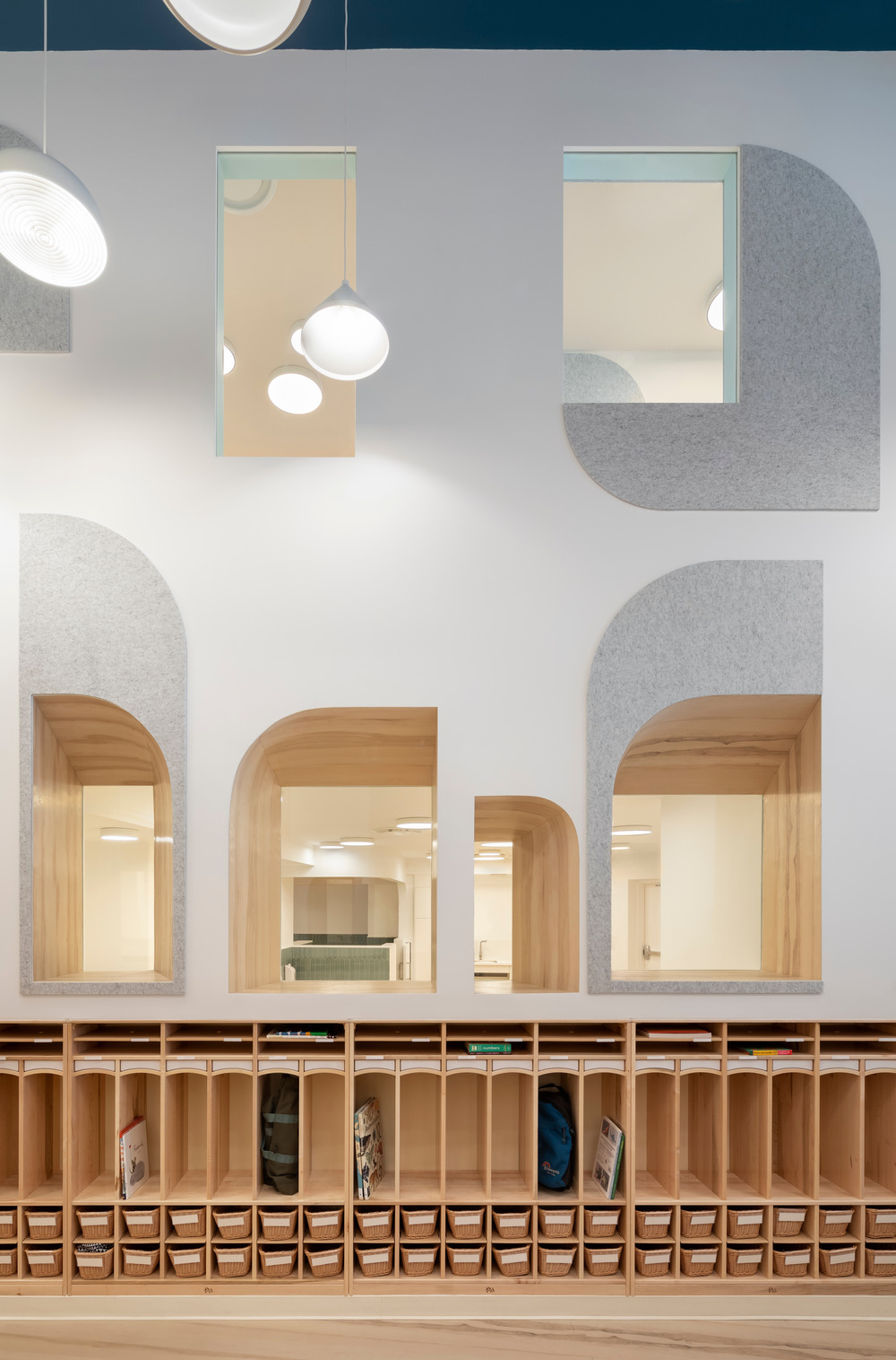 리셉션 구역의 계단을 올라가면 초등학생 방과 후 프로그램 공간이 있다. 창들은 뜰과 복도에 빛과 전망을 가져다 준다. 사물함이 도시 스카이라인 형태로 안뜰을 둘러싸고 있다. 요리, 연극, STEM 및 운동을 위한 특수교실은 위 복도에서 접근할 수 있다. 관람석이 있는 라운지는 비공식적 모임을 위한 장소를 제공한다. 다양한 유형과 크기의 조명 설비가 매달려 애니메이션 천장 평면을 제공한다. 판자 바닥재는 또한 교실과 창문에 사용된다. 그래픽 형태로 절단된 음향 펠트 패널은 시각적 흥미를 제공한다.
