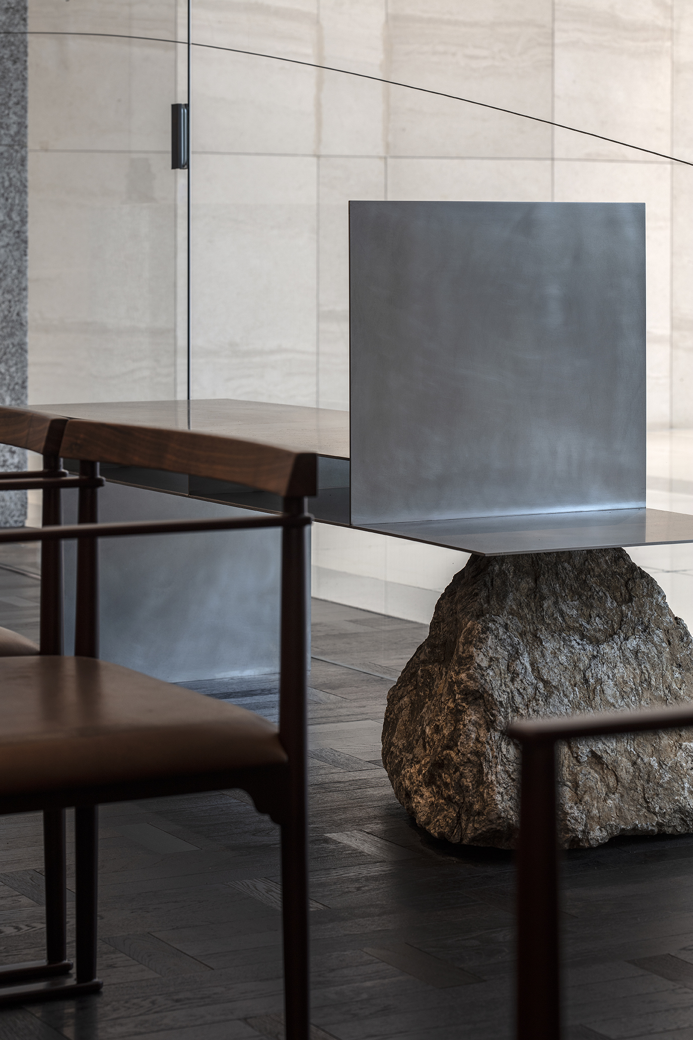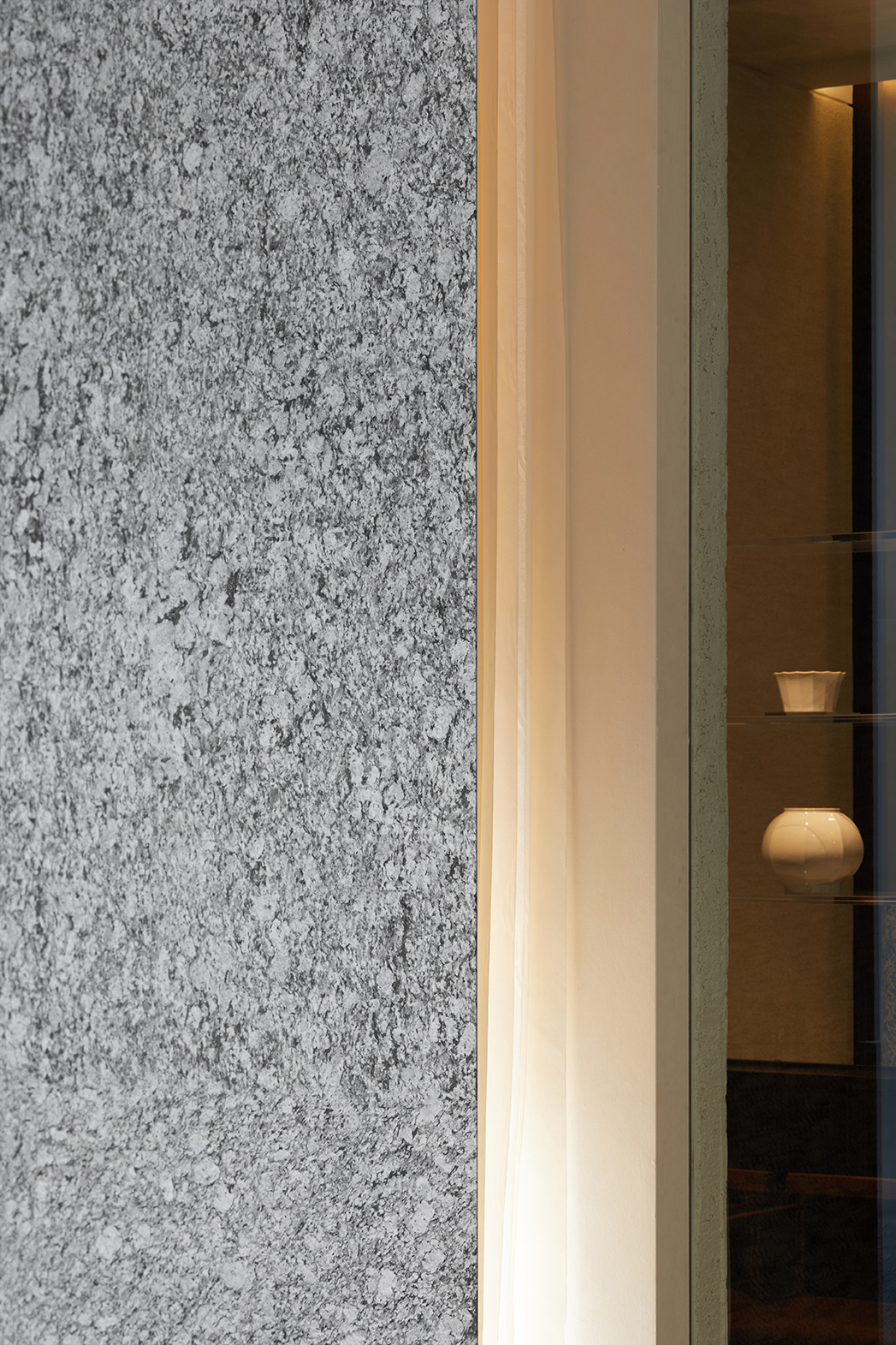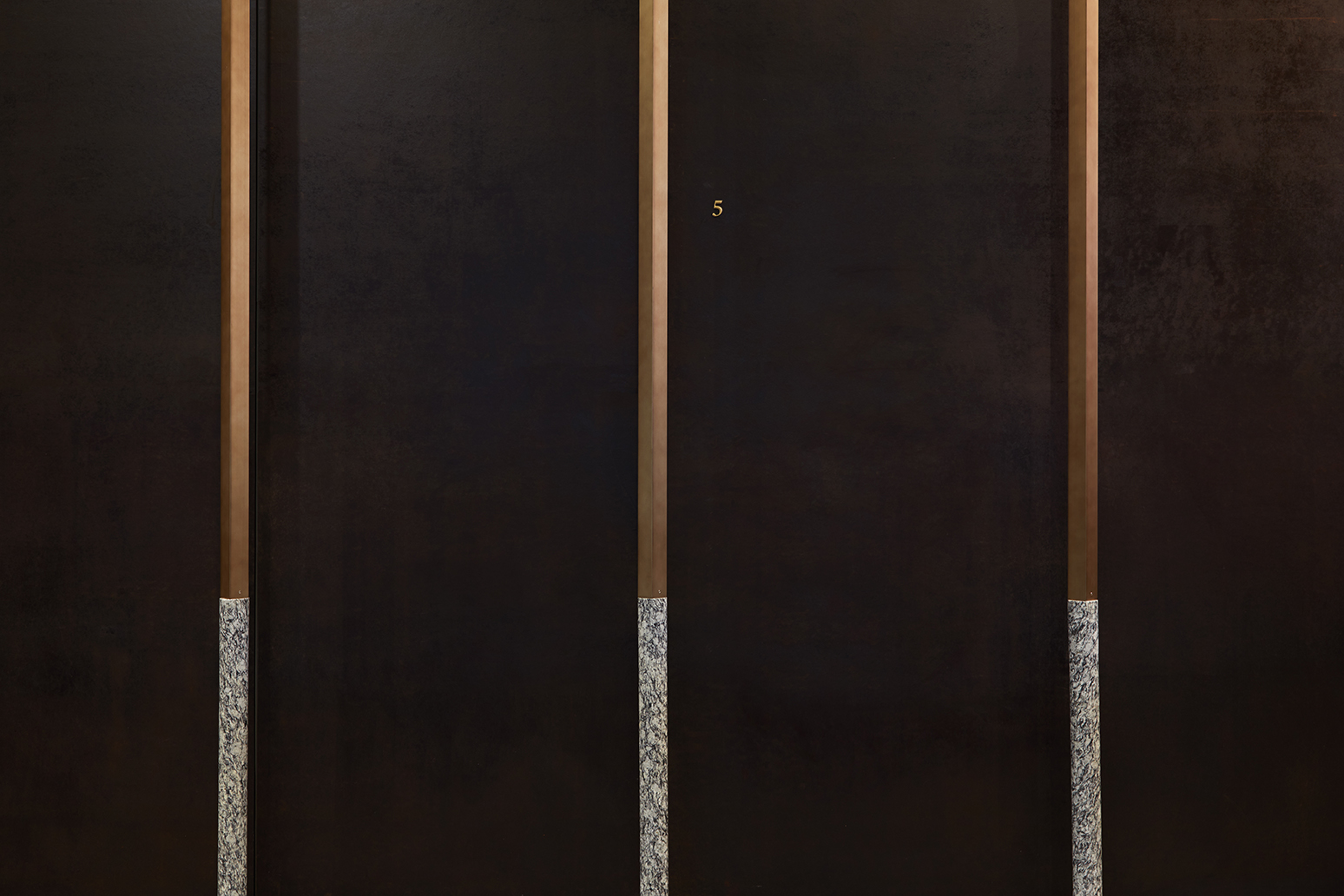 열주의 뒤에 배치된 5개의 룸은 셰프의 요리를 마주하는 공간으로 룸의 문을 여는 그 순간부터 시간성을 느낄 수 있도록 하기 위해 우리의 전통 기법인 옻칠 한지를 마감재로 선정했다. 고서의 표면과 같이 강한 물성을 가진 이 소재를 통해 우리는 기록을 열고 들어가는 감각을 선사하고자 했다.