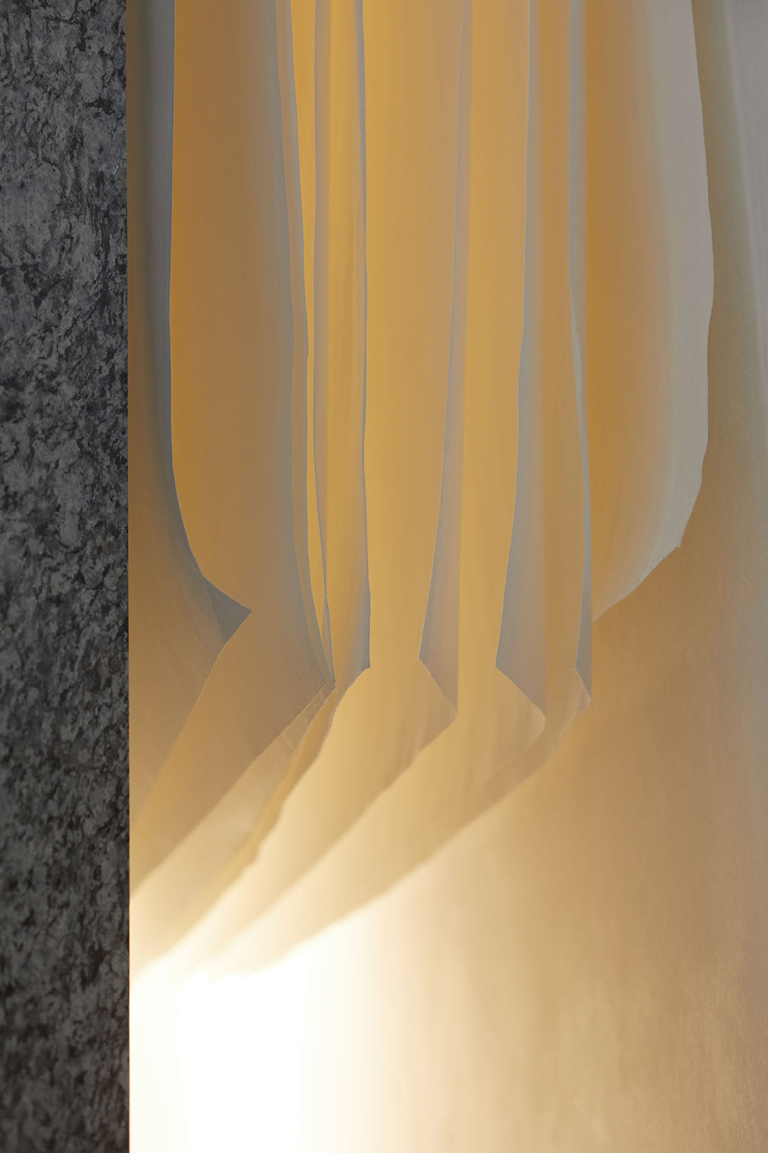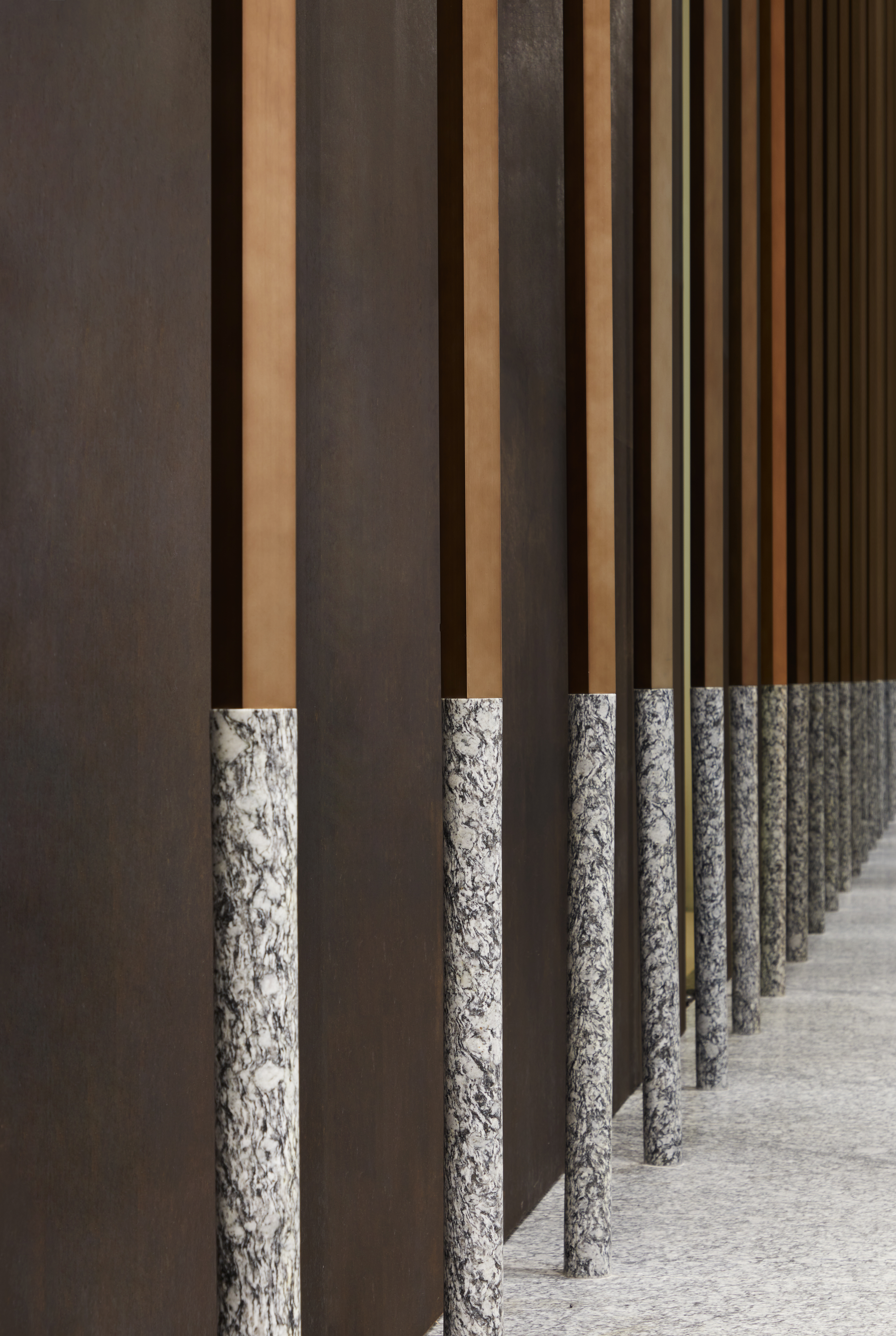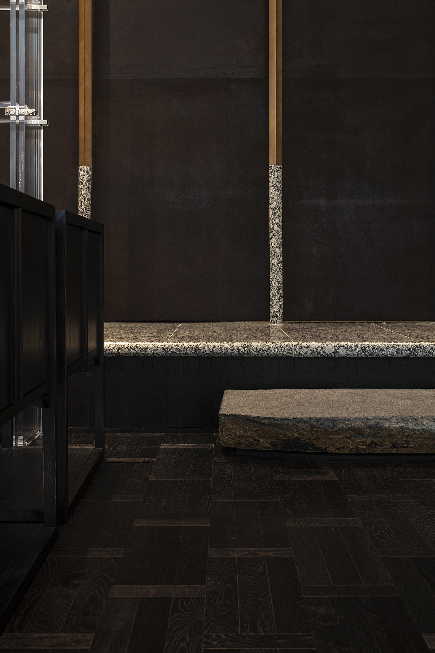 열주의 뒤에 배치된 5개의 룸은 셰프의 요리를 마주하는 공간으로 룸의 문을 여는 그 순간부터 시간성을 느낄 수 있도록 하기 위해 우리의 전통 기법인 옻칠 한지를 마감재로 선정했다. 고서의 표면과 같이 강한 물성을 가진 이 소재를 통해 우리는 기록을 열고 들어가는 감각을 선사하고자 했다.