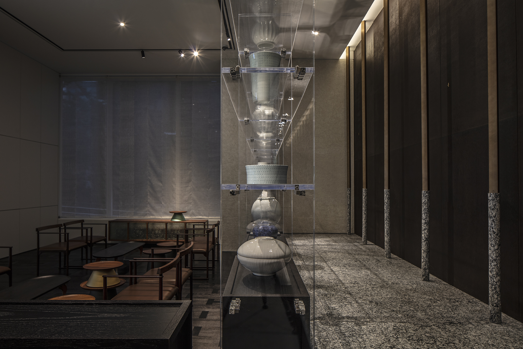 Stepping up the stone platform, the hallway adopted horizontal form of traditional architects by placing colonnades. This horizontal form also represents chef’s faith to fully adopt traditional recipe without arrogance and helps customers to naturally flow into different time.