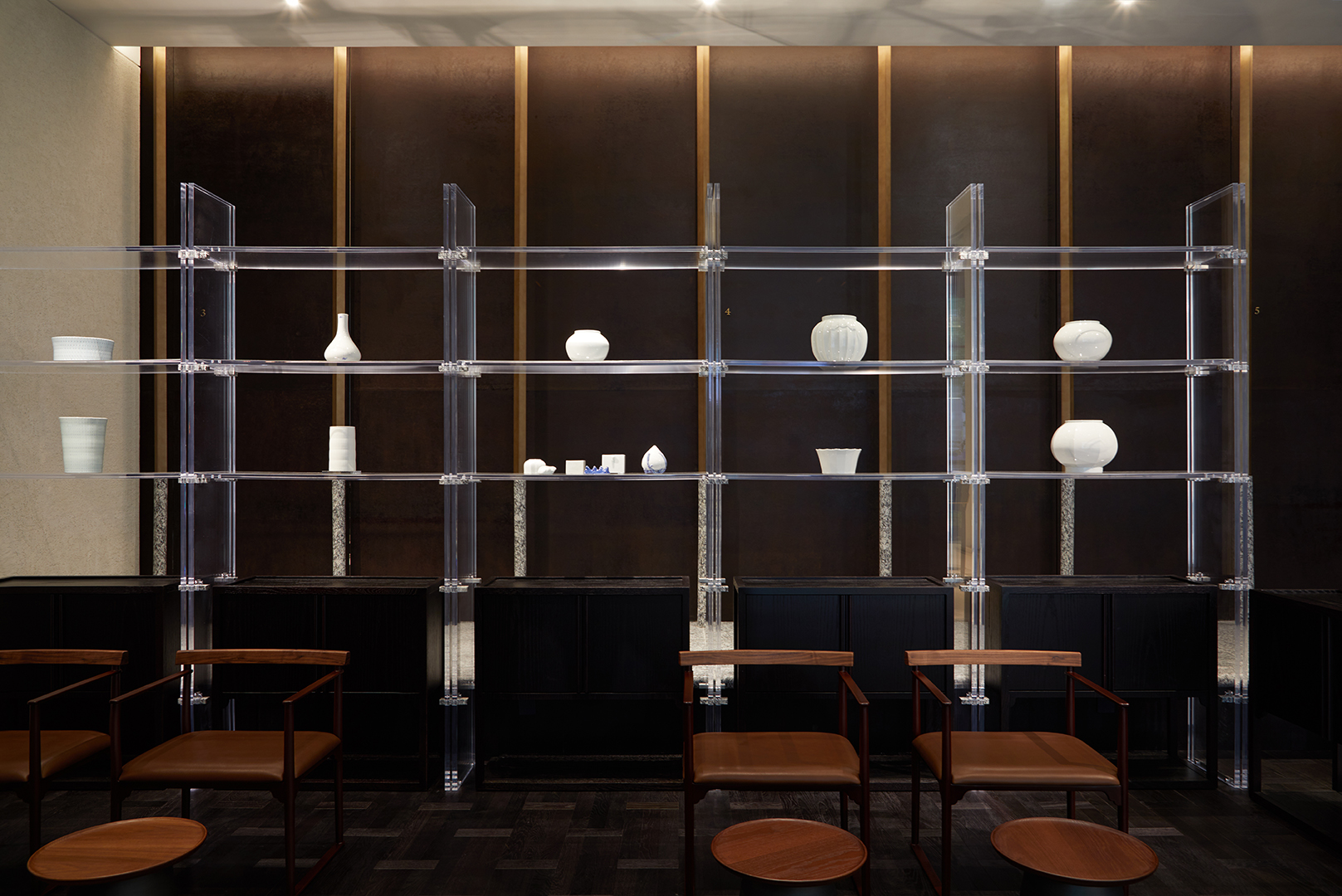 Behind the colonnade, five dining rooms are the space where customers encounter with chef’s cuisine and start journey of time. Lacquered Hanji was specifically chosen as a finishing material for the door; the rough texture reminds people of the ancient manuscript. This helps customers to immerse in the experience of traveling back in time.