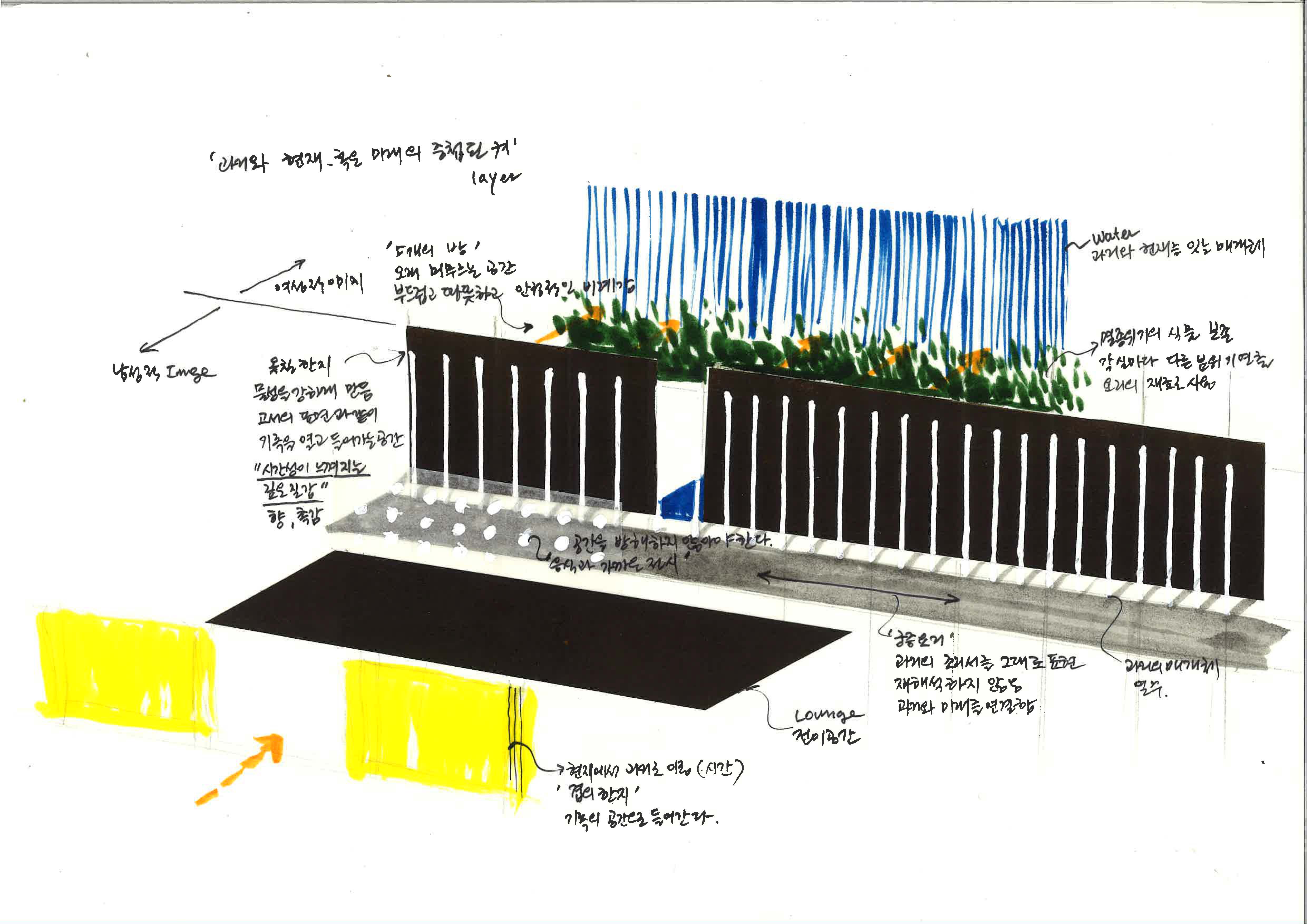 공간에서 처음 맞이하게 되는 메인 출입구는 겹의 한지를 통해 현재에서 과거로 이동하는 기록의 공간으로 들어간다는 의미를 담고 있다. 출입구를 지나 홀에 들어서면 전이 공간으로 이루어진 라운지가 있다. 이 공간은 셰프가 웰컴 푸드를 제공하여 요리를 통해 과거의 시간을 느낄 수 있는 방으로 들어서기 전, 잠시 멈추어 갈 수 있는 곳이 된다.