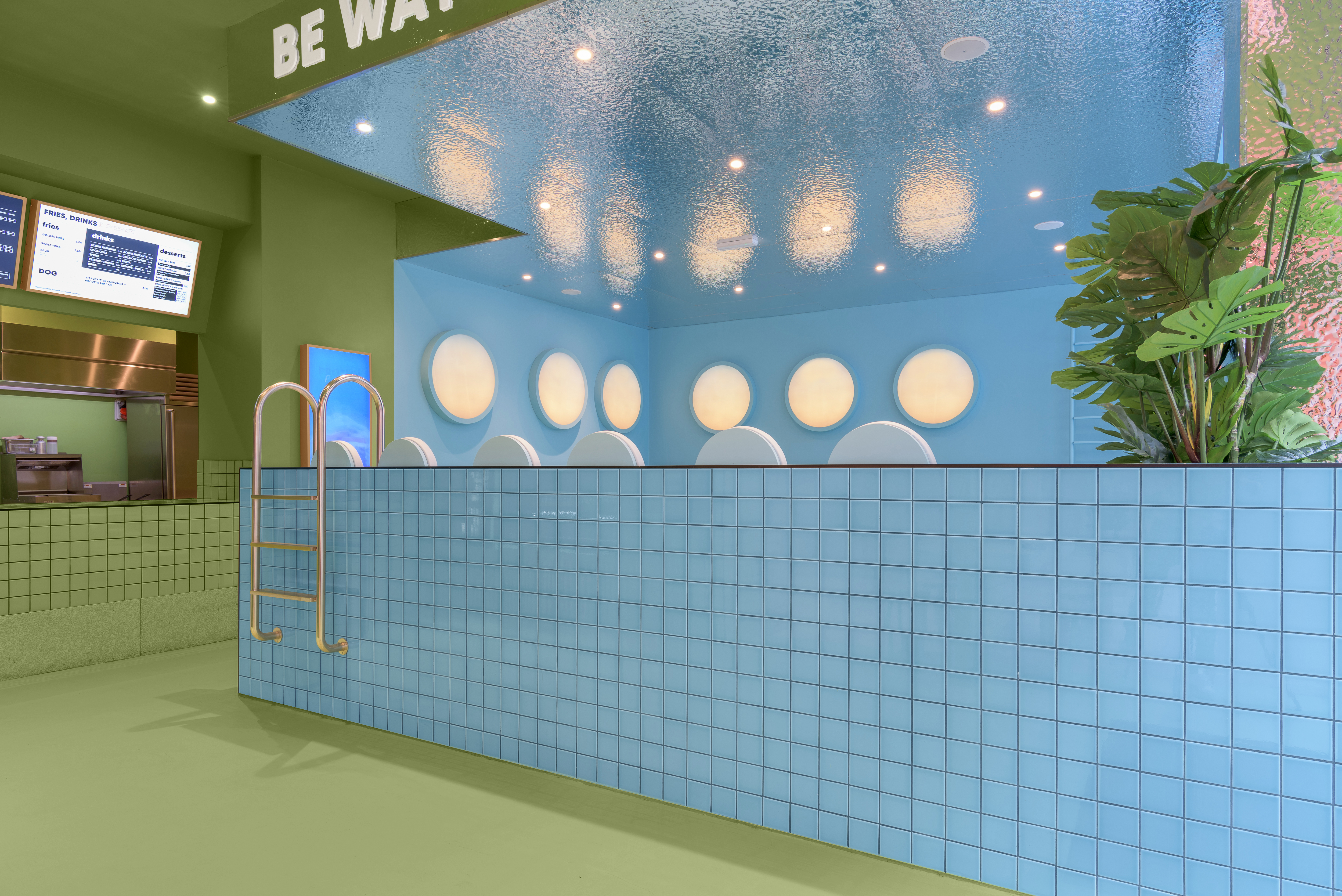 Bun의 아이코닉한 초록색 공간은 주문을 하는 공간, 분홍색과 파란색 색상은 서로 완전히 다른 2개의 좌석 공간으로 안내한다. 분홍색 공간은 공유 테이블과 아크 콘셉트를 이어가는 단이 설치되어 있다. 파란색 공간은 재미를 더하고 방문객들이 물에 떠 있는 듯한 느낌을 주는 거대한 수영장을 연상케 하는 공간으로 디자인됐다.