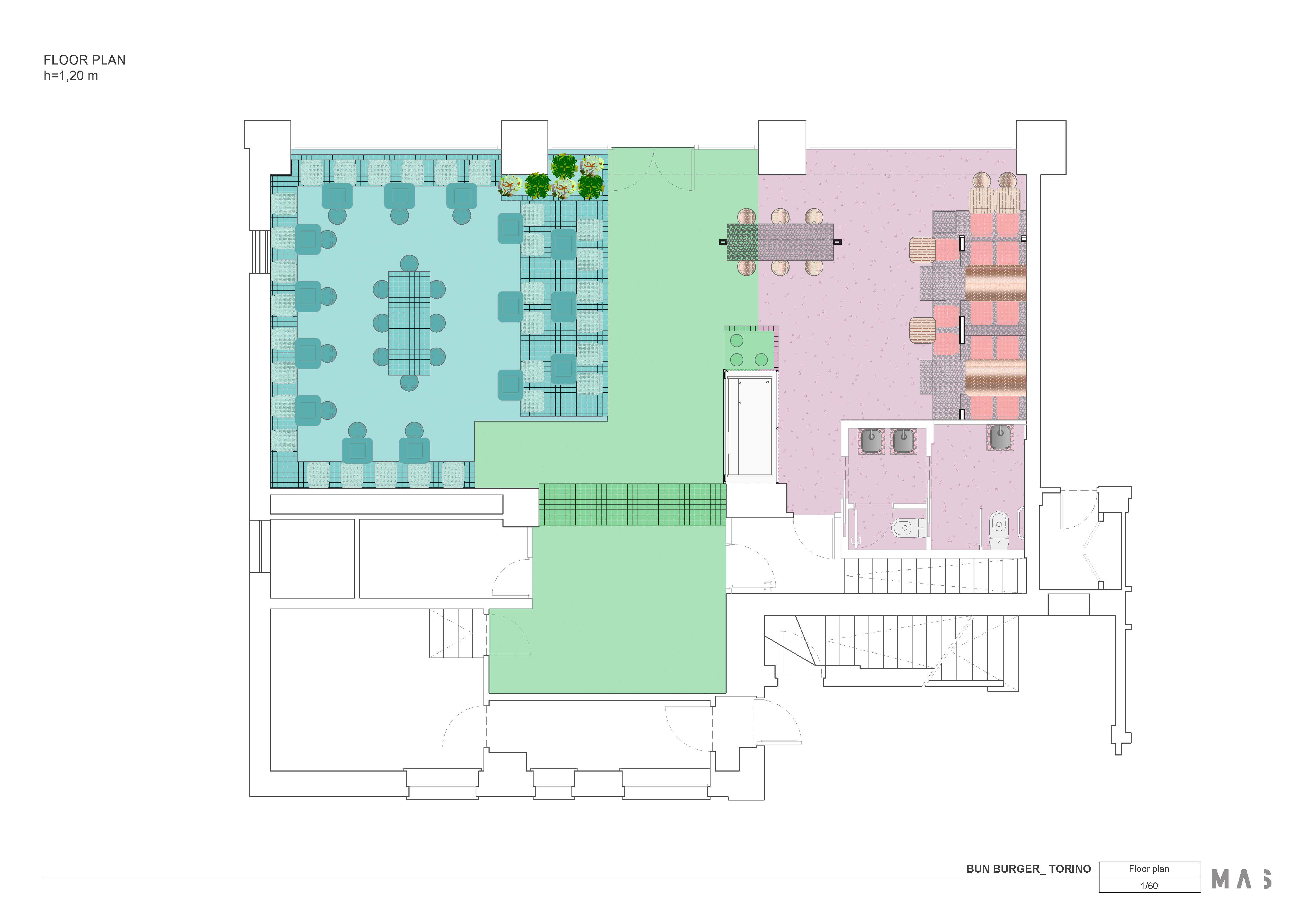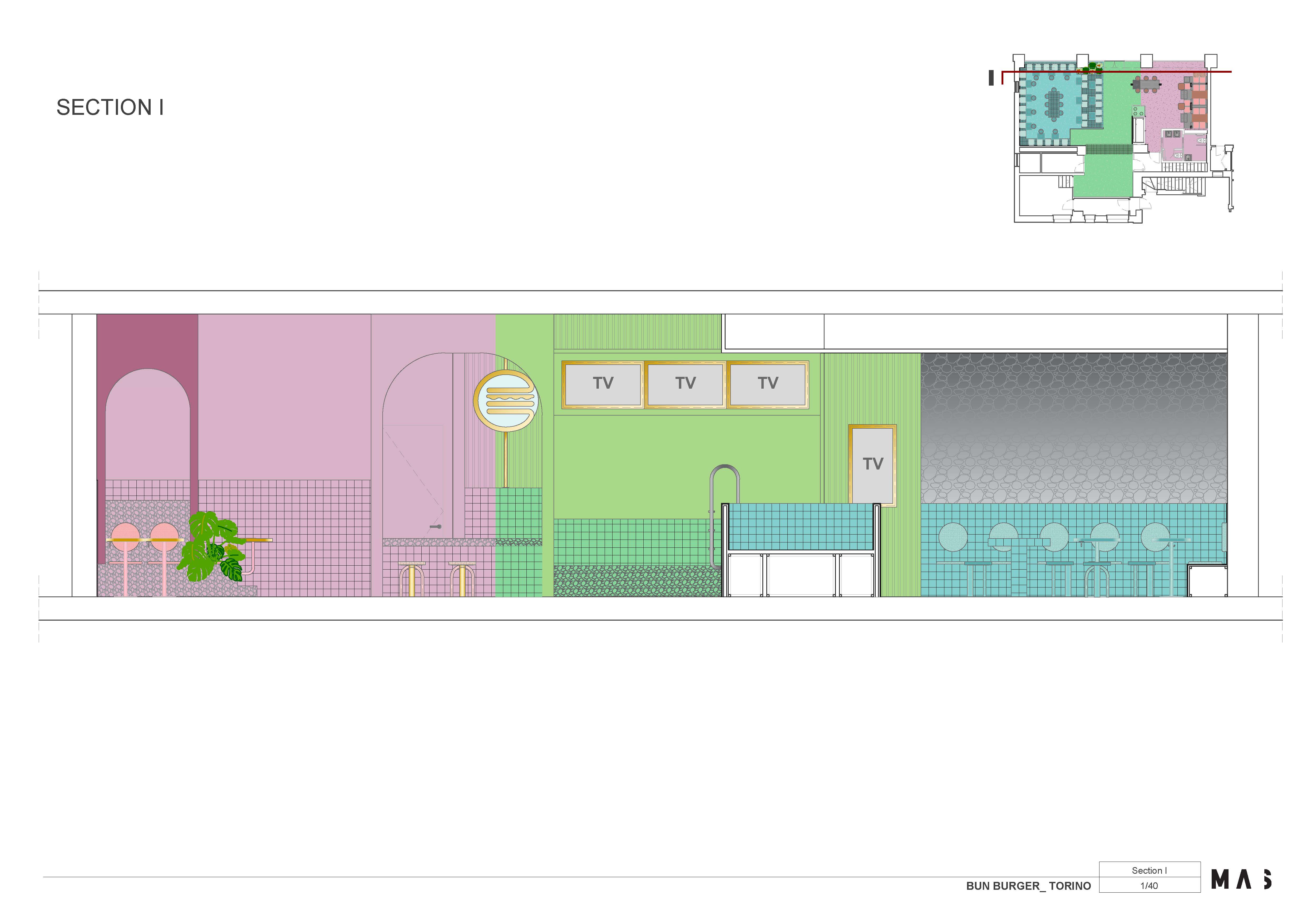 Milan의 Bun Burgers Bligny에서 구현된 아이덴티티는 Bun Burgers Turin에서도 이어졌다. 이번 프로젝트의 접근 방식은 공간의 역사적인 요소로 시작되지 않았지만 공간에 자연 채광을 제공하는 3개의 창을 통해 외부에서 내부를 직접 볼 수 있다.