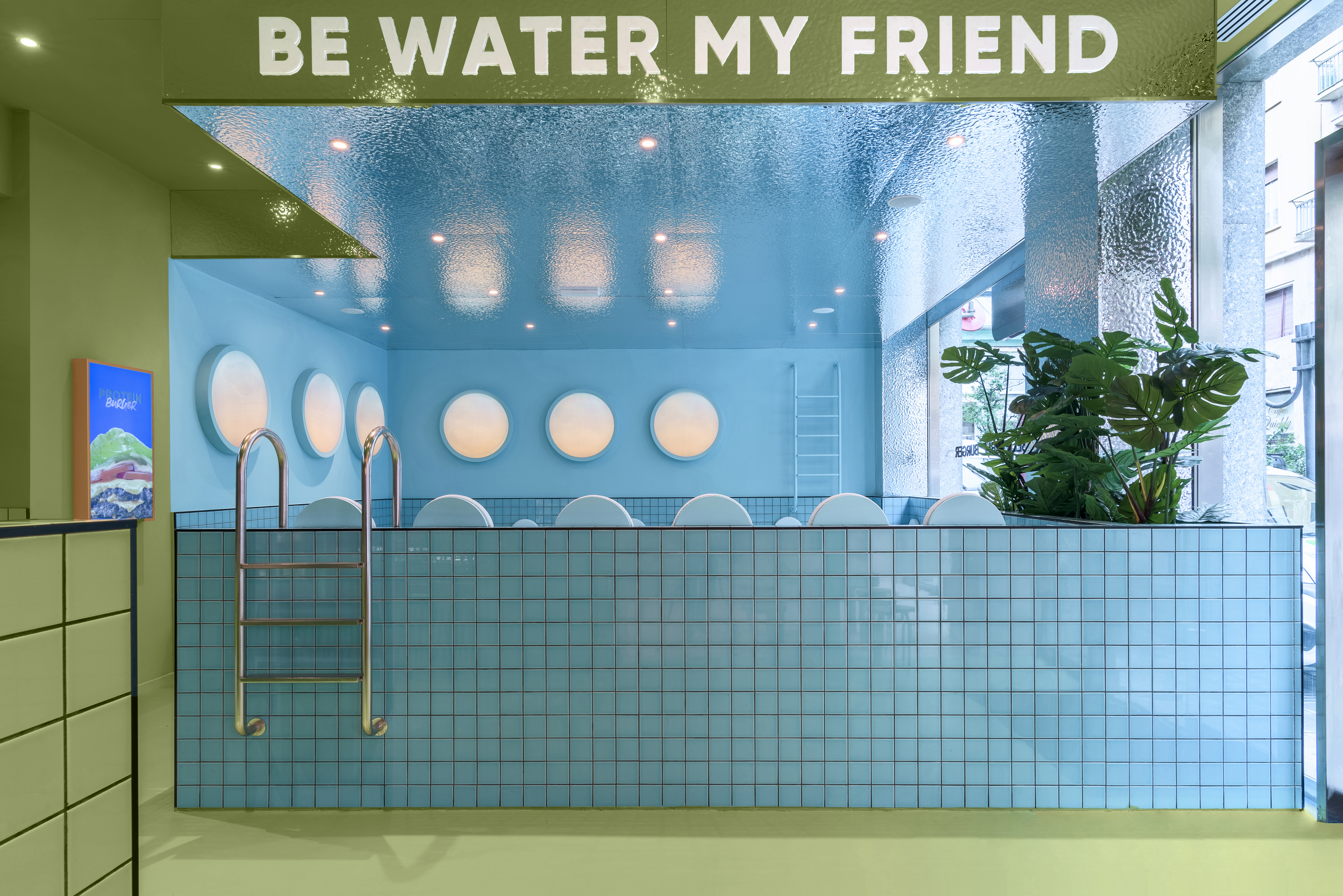 The already iconic green color from Bun is the one that takes you immediately to the order bar, while the pink and blue colors take you to 2 seating spaces that differ completely from each other. In the pink space you can see how next to a sharing table, a tribune that continues with the arc concept is set-up to give the diners the possibility to sit at different levels. The blue zone on the other hand adds a touch of fun and gives the visitors the chance to enjoy the delicious Bun burgers in a space that simulates a huge swimming pool that would make them feel like floating in the water.