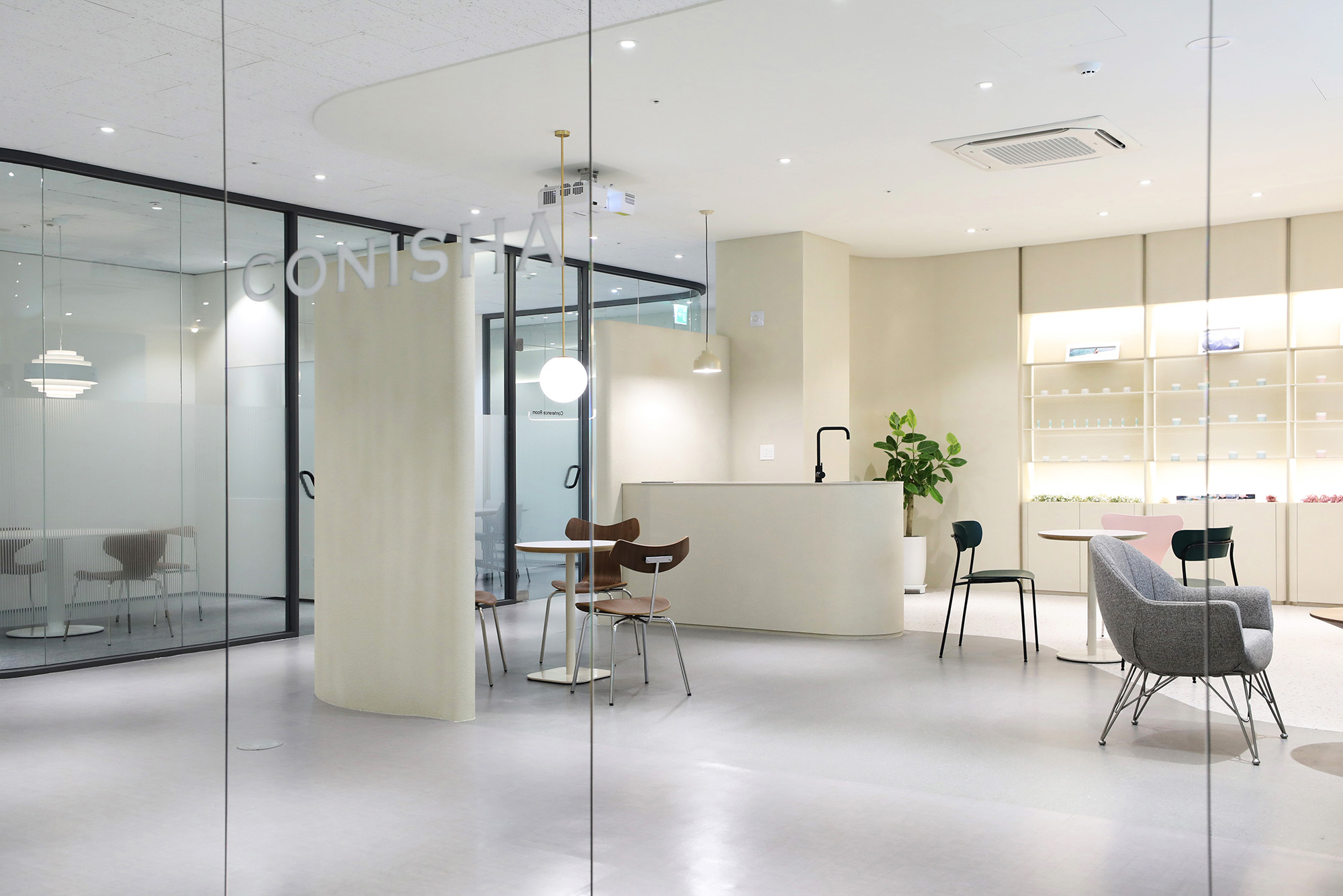 코니샤 오피스는 360㎡의 공간 중에 99㎡의 면적에 쇼룸과 미팅공간을 구성하고 있다. 코니샤를 방문하는 바이어들이나, 직원들의 영역에서 화장품 분야에 전문적이고, 트랜디한 감성을 보여줄 수 있는 브랜드가 지닌 감성을 보여주고자 했다. 재료를 중요시하는 기초화장품 전문 브랜드인만큼, 인테리어 디자인에서도 마감재가 갖고 있는 분위기와 질감을 최대한 자연스럽게 보여주고자 했다. 또한, 코로나 시대에 활용도가 높아진 화상회의를 염두에 둔 쇼룸 구성은 세계 바이어들과의 마케팅 회의에서도 브랜드의 이미지를 최대한 부각시켜줄 수 있도록 했다.