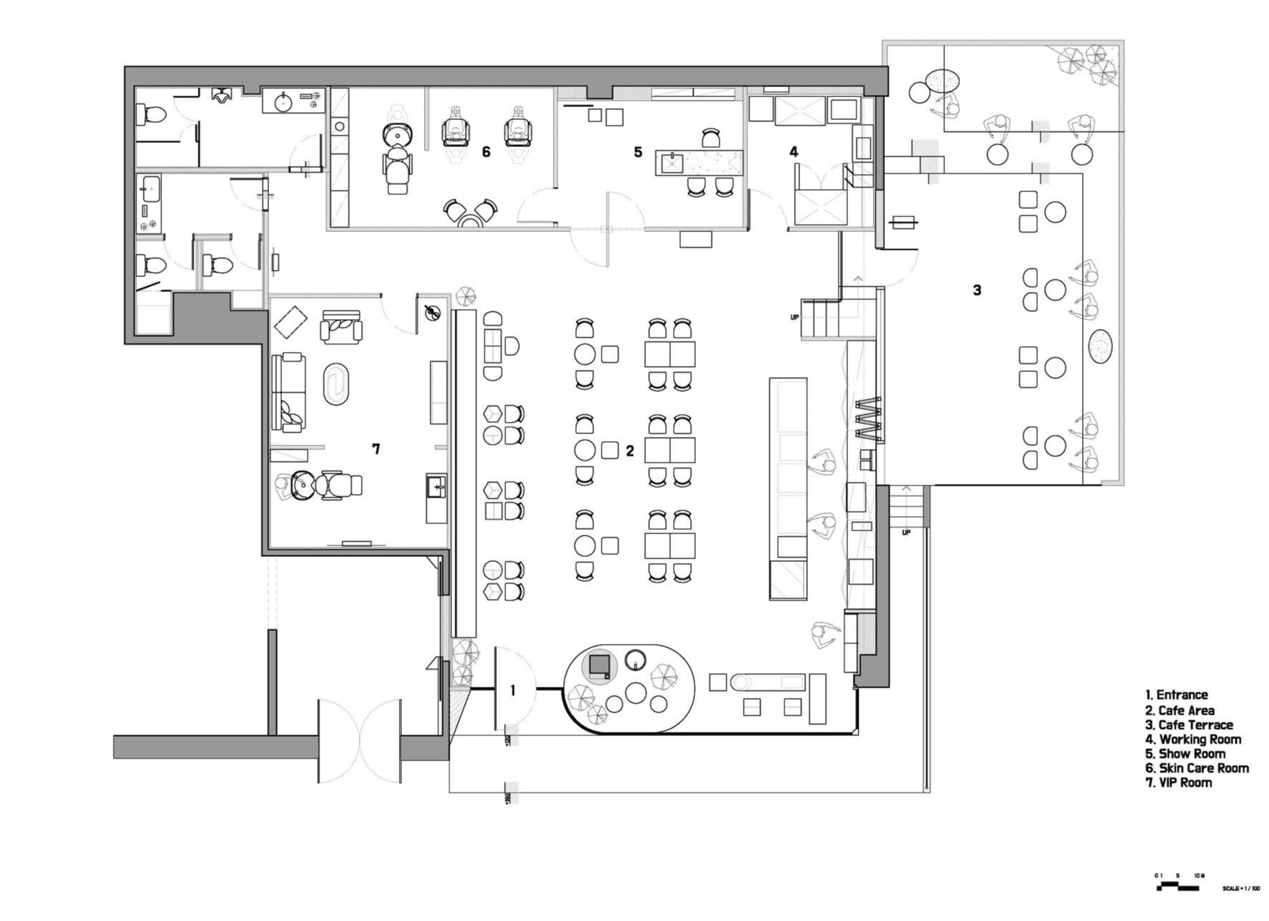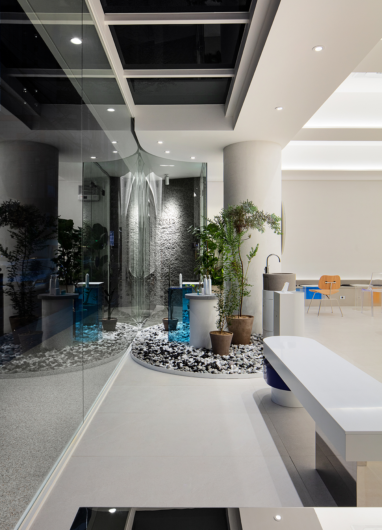 As can be seen from the design slogan, Café KUO’S was designed to touch the sentiment of women from the very beginning. It depicts a marketing strategy called Sense marketing, and refers to the experience of the value, impression, and sense of resonance of the space. The design of Café KUO’S begins with minimalism. Since various functions of a showroom-type cafe had to be established, the large space that was initially large was divided as needed, and only a square space remained in the middle. The interior space, which can be seen right from the outside, may seem simple, but we wanted visitors to naturally scan, stay, and focus on the space. While restraining from excessively expressing design, we developed a design that emphasizes a consistent repetitive rhythm by creating constant patterns with lines and surfaces to maintain order. We wanted to provide an experience where one believes that everything can be seen at once, but can feel and enjoy a new space every time they change their seat. In addition, we hoped that customers staying at the cafe could notice their mood, expression, and behavior changing in the space and feel the value of the ‘place’ they are staying in once again. Café KUO’S pursues a more realistic minimalism, and concentrates more on the areas where simple lines and surfaces that exist within the space meet. Also, it rejects spaces that are simply pretty and do not feel warm. The warmth of a space is always created in its relationship with people, and relationships are what is mainly mentioned in IMA’s projects. A space is made up of simple things, but when the movements and sounds of people that harmonize with the space exist, and as they feel the blanks and perceive the space to create a sense of composure, the space is filled. We believe that Dosan Park Café KOU’S will become a space that can adapt to the changing seasons and culture, create its own color, and greet people comfortably.