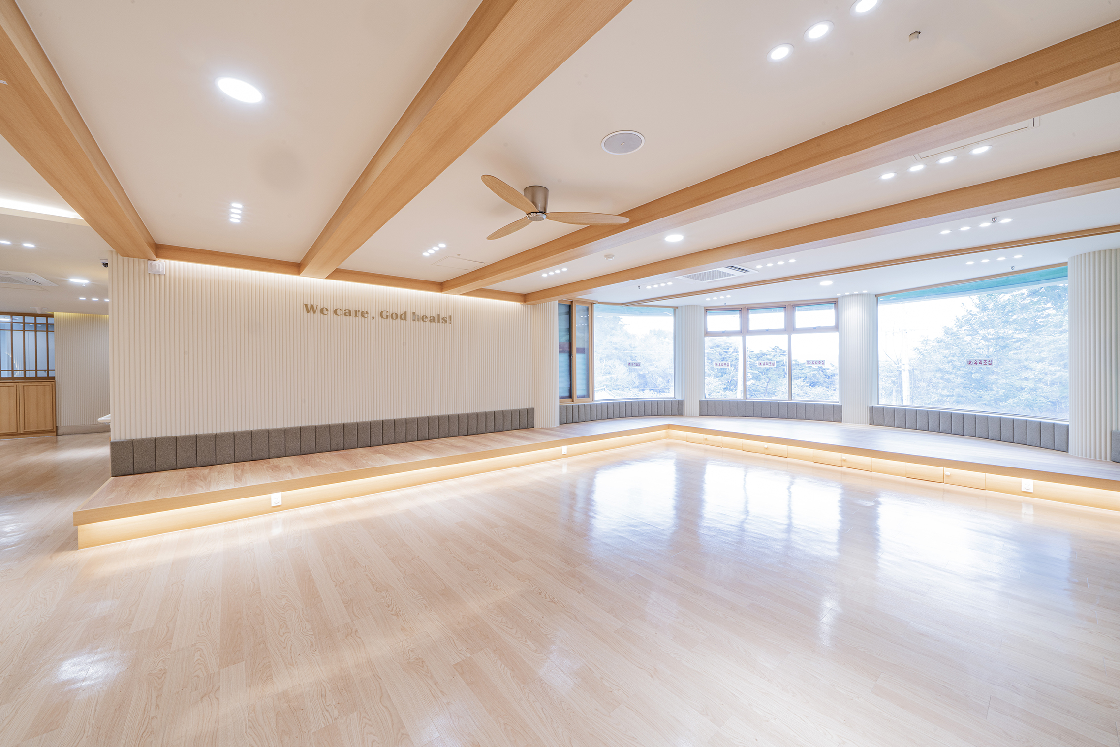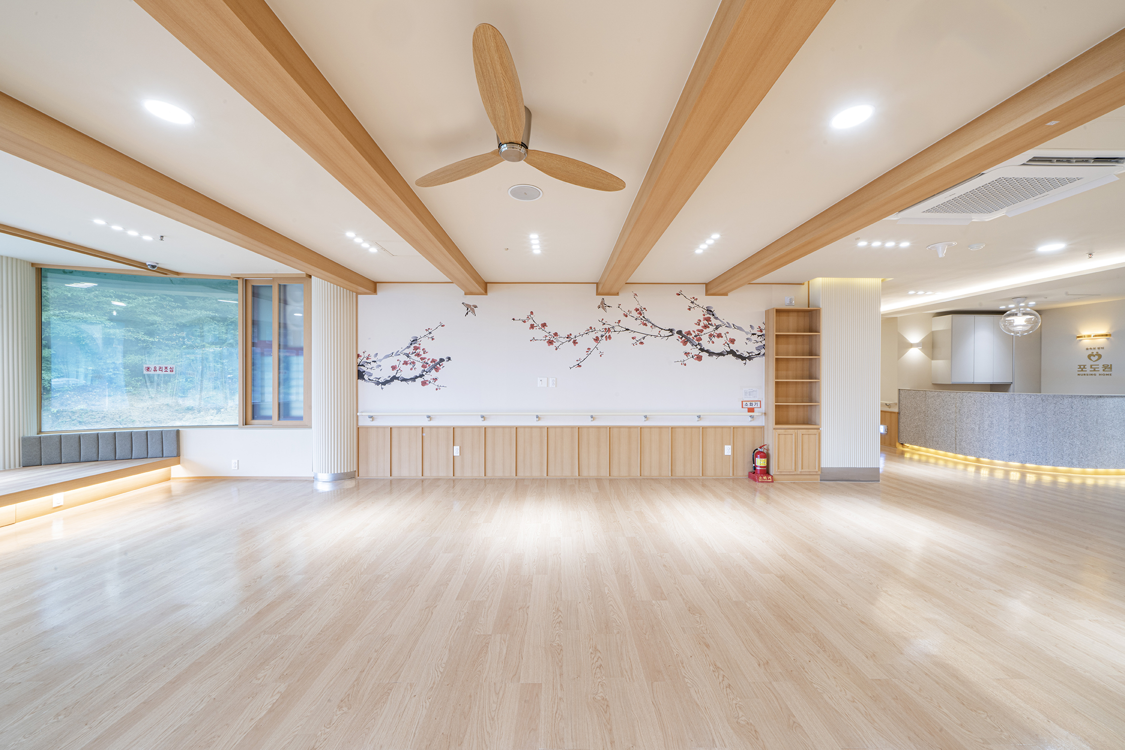 Podowon Geriatric care center, which has a vision of 'a geriatric care center that is trusted by the family and heals the indisposed body and mind of the elderly', is located at the foot of a mountain with a beautiful scenery in Namwon, Jeollabuk-do. We remodeled the second floor of the four-story geriatric care center and added openness to the existing structure to specialize in caring for the elderly with Alzheimer's disease. In consideration of the preferences of the elderly who are the ones mainly living here, the entrances to all rooms were decorated with a traditional pattern. Wood and cream were mixed for the overall color to give a fresh feeling. In particular, low wooden benches were formed along the edges of the living room to create a space for the elderly to lie down and rest, and the height of the benches was set through simulation to help caregivers care for the elderly. Between the traditional and the modern, more emphasis was placed on modernity to relieve the sense of weightiness. In most geriatric care centers, the guardians (children of the elderly) are the ones who look around and make decisions. Therefore, the starting point of he design was the thought that they should have no regrets about the facility when returning with their parents. Since they had to at least be reassured that their parents are living in a better facility than the house they were living in, we designed the software related to the operation of the geriatric care center to be able to be incorporated with the interior, which is the hardware. The corridor is divided into the lower and upper parts based on the safety handles. The upper part was finished with cream colored paint, and for the lower part, both circulation and practicality were considered by using reinforced plywood and internal wood film to prevent damage to the walls from wheelchairs for the elderly with limited mobility. Due to its nature, the geriatric care center has many supplies, so all available space below the bench and along the walls of the corridor were made to be used as storage spaces, and considering the visual aspect after they are stored, doors were made for all of these storage spaces to allow them to be covered by the design.
