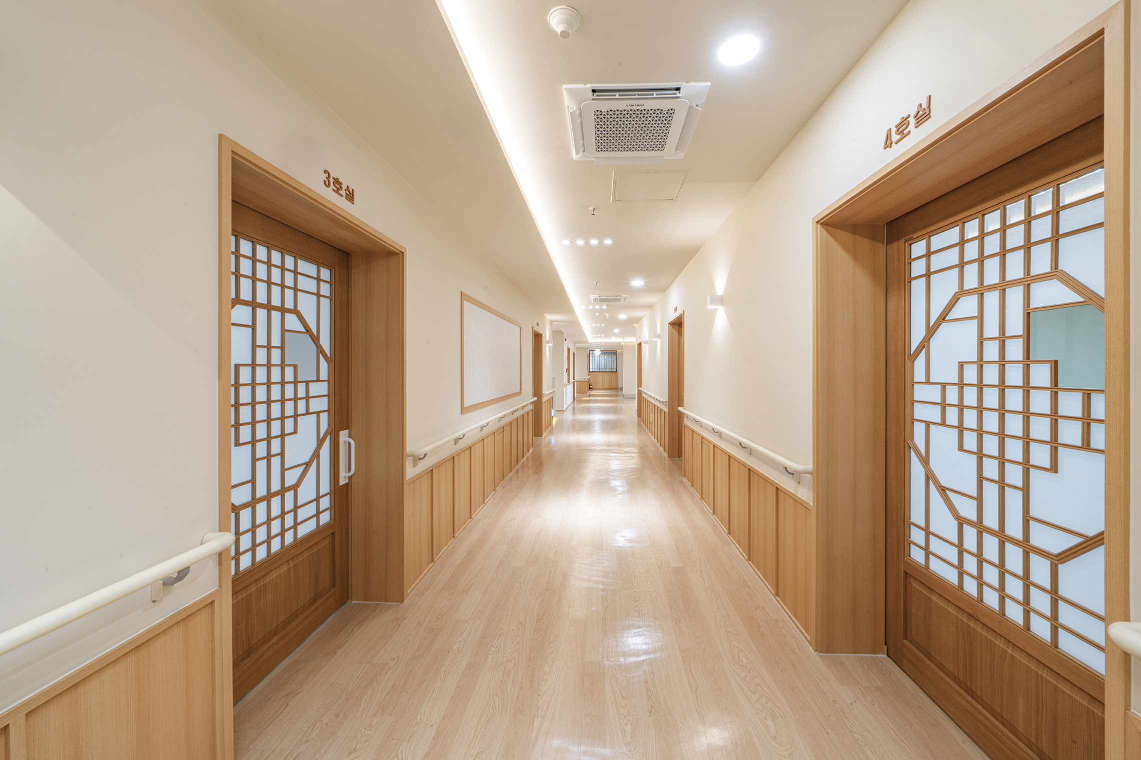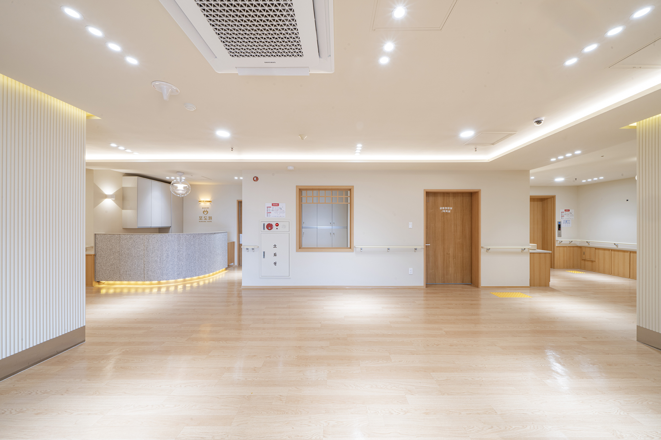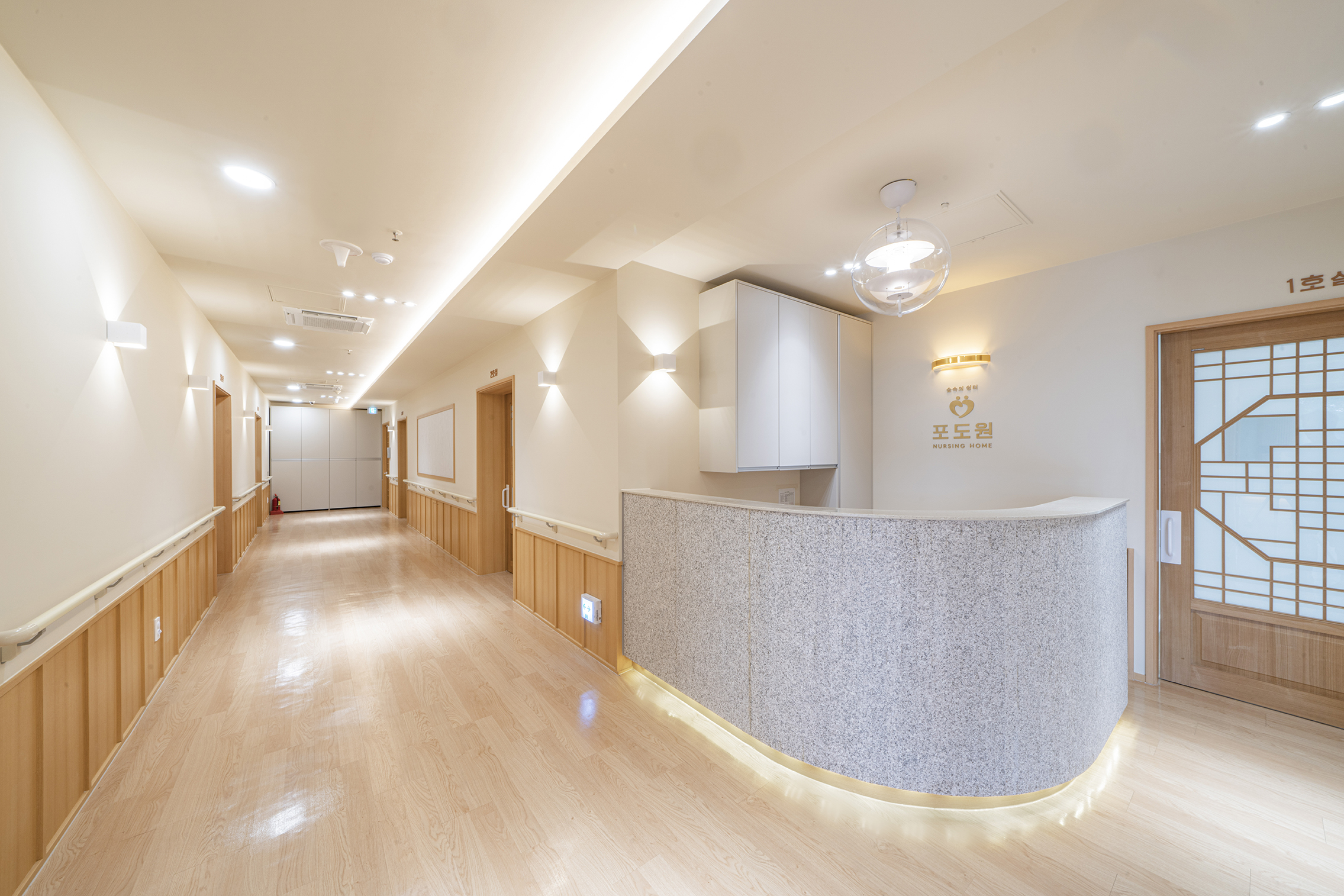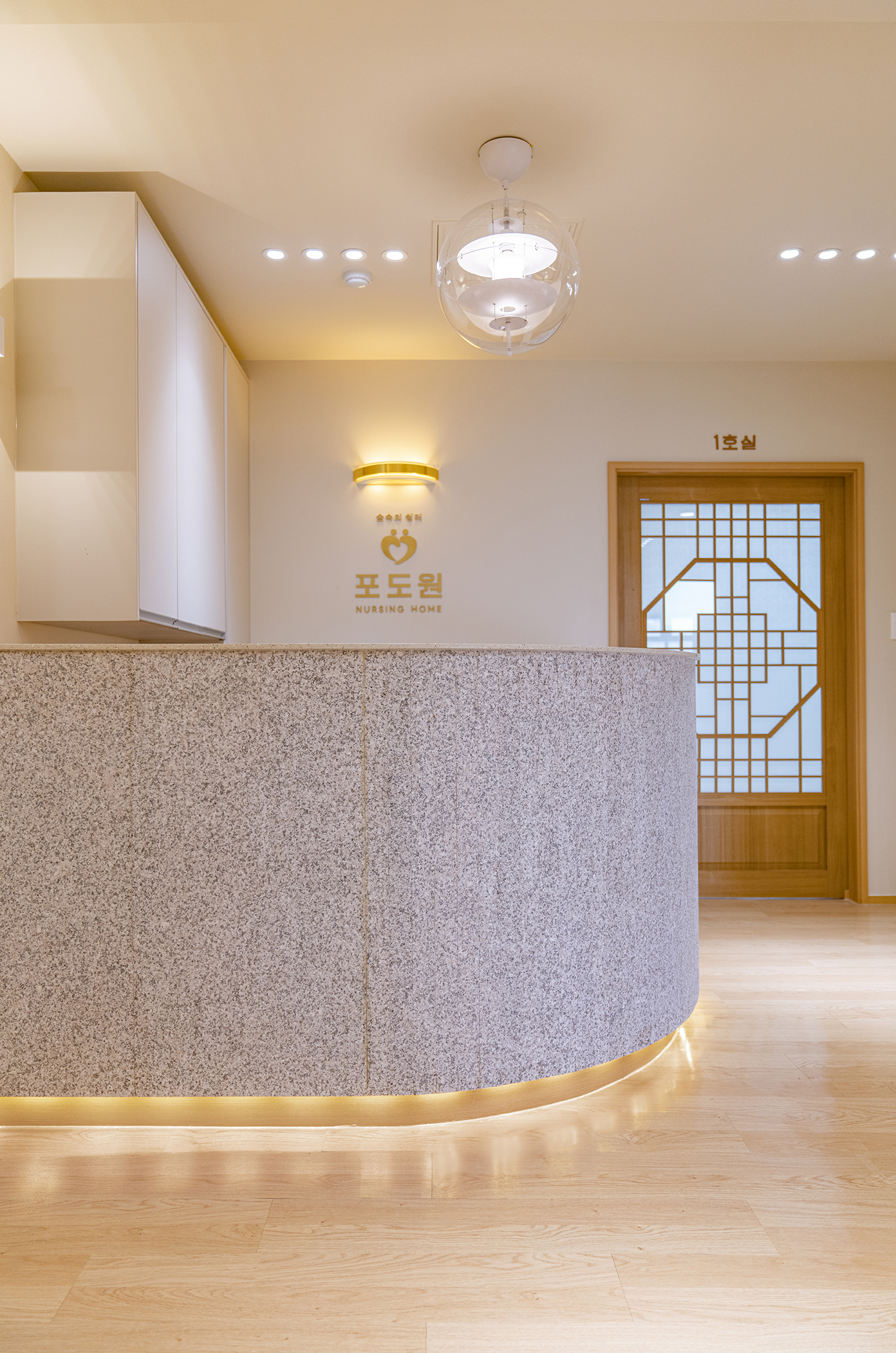 Podowon Geriatric care center, which has a vision of 'a geriatric care center that is trusted by the family and heals the indisposed body and mind of the elderly', is located at the foot of a mountain with a beautiful scenery in Namwon, Jeollabuk-do. We remodeled the second floor of the four-story geriatric care center and added openness to the existing structure to specialize in caring for the elderly with Alzheimer's disease. In consideration of the preferences of the elderly who are the ones mainly living here, the entrances to all rooms were decorated with a traditional pattern. Wood and cream were mixed for the overall color to give a fresh feeling. In particular, low wooden benches were formed along the edges of the living room to create a space for the elderly to lie down and rest, and the height of the benches was set through simulation to help caregivers care for the elderly. Between the traditional and the modern, more emphasis was placed on modernity to relieve the sense of weightiness. In most geriatric care centers, the guardians (children of the elderly) are the ones who look around and make decisions. Therefore, the starting point of he design was the thought that they should have no regrets about the facility when returning with their parents. Since they had to at least be reassured that their parents are living in a better facility than the house they were living in, we designed the software related to the operation of the geriatric care center to be able to be incorporated with the interior, which is the hardware. The corridor is divided into the lower and upper parts based on the safety handles. The upper part was finished with cream colored paint, and for the lower part, both circulation and practicality were considered by using reinforced plywood and internal wood film to prevent damage to the walls from wheelchairs for the elderly with limited mobility. Due to its nature, the geriatric care center has many supplies, so all available space below the bench and along the walls of the corridor were made to be used as storage spaces, and considering the visual aspect after they are stored, doors were made for all of these storage spaces to allow them to be covered by the design.