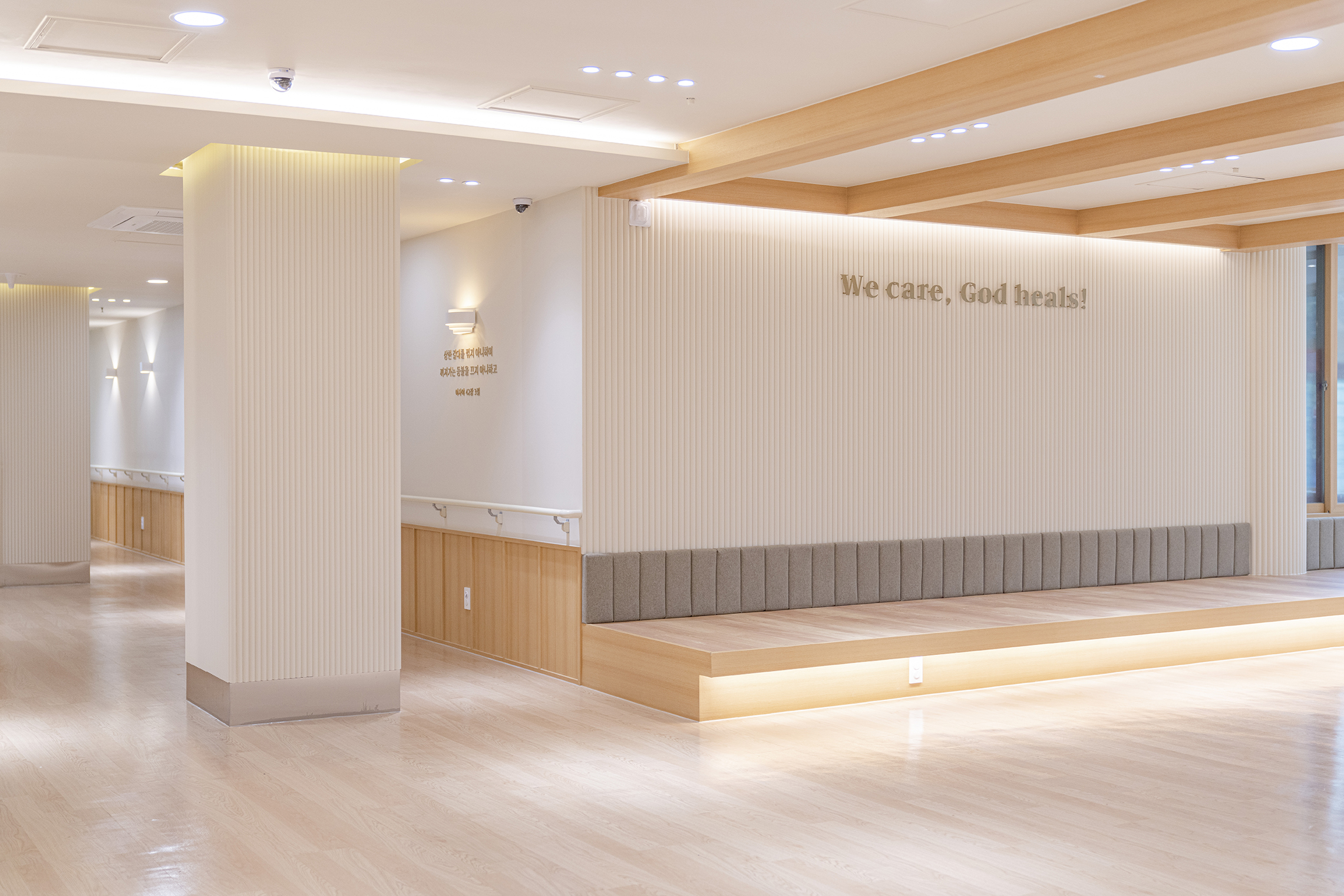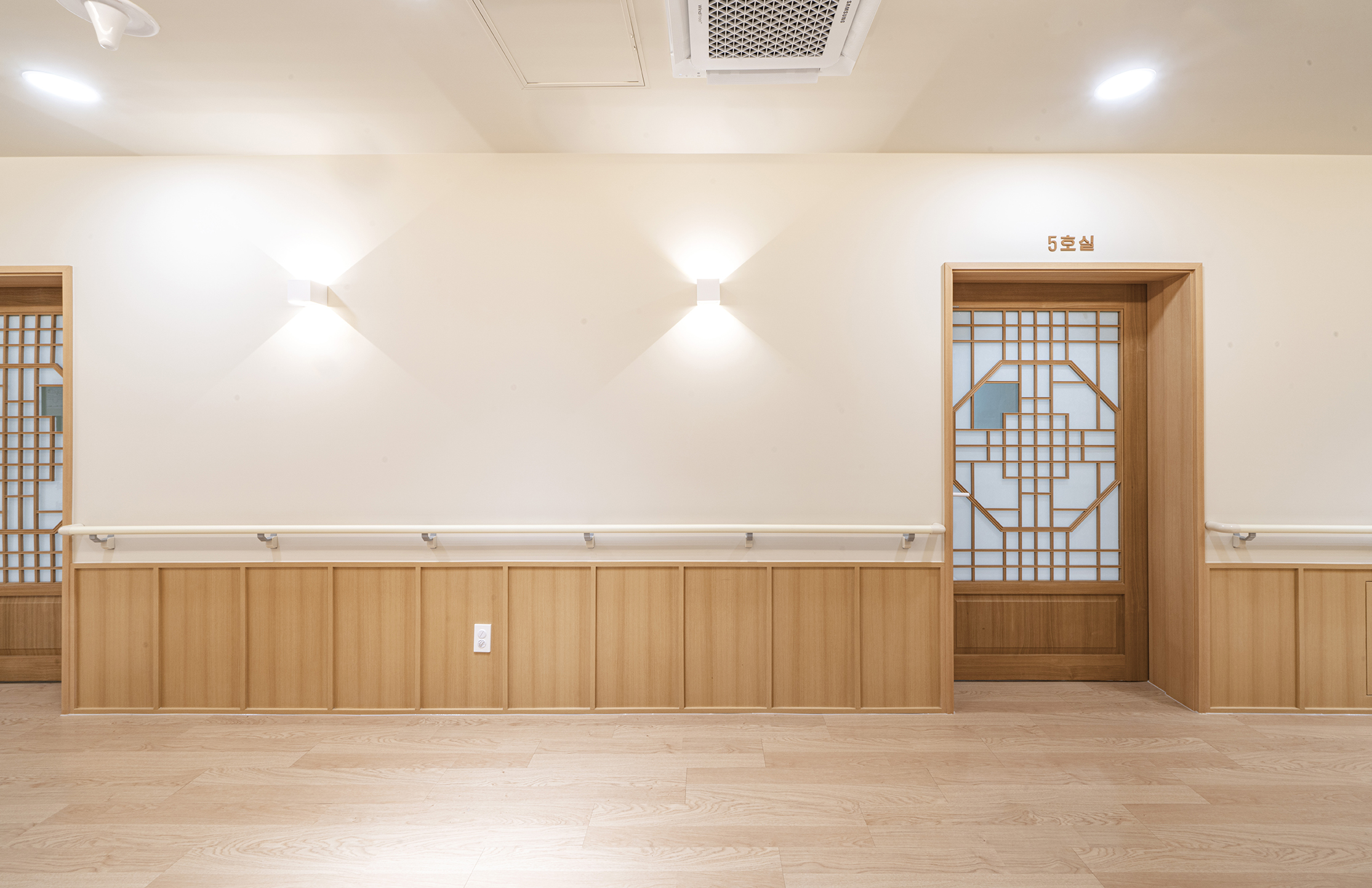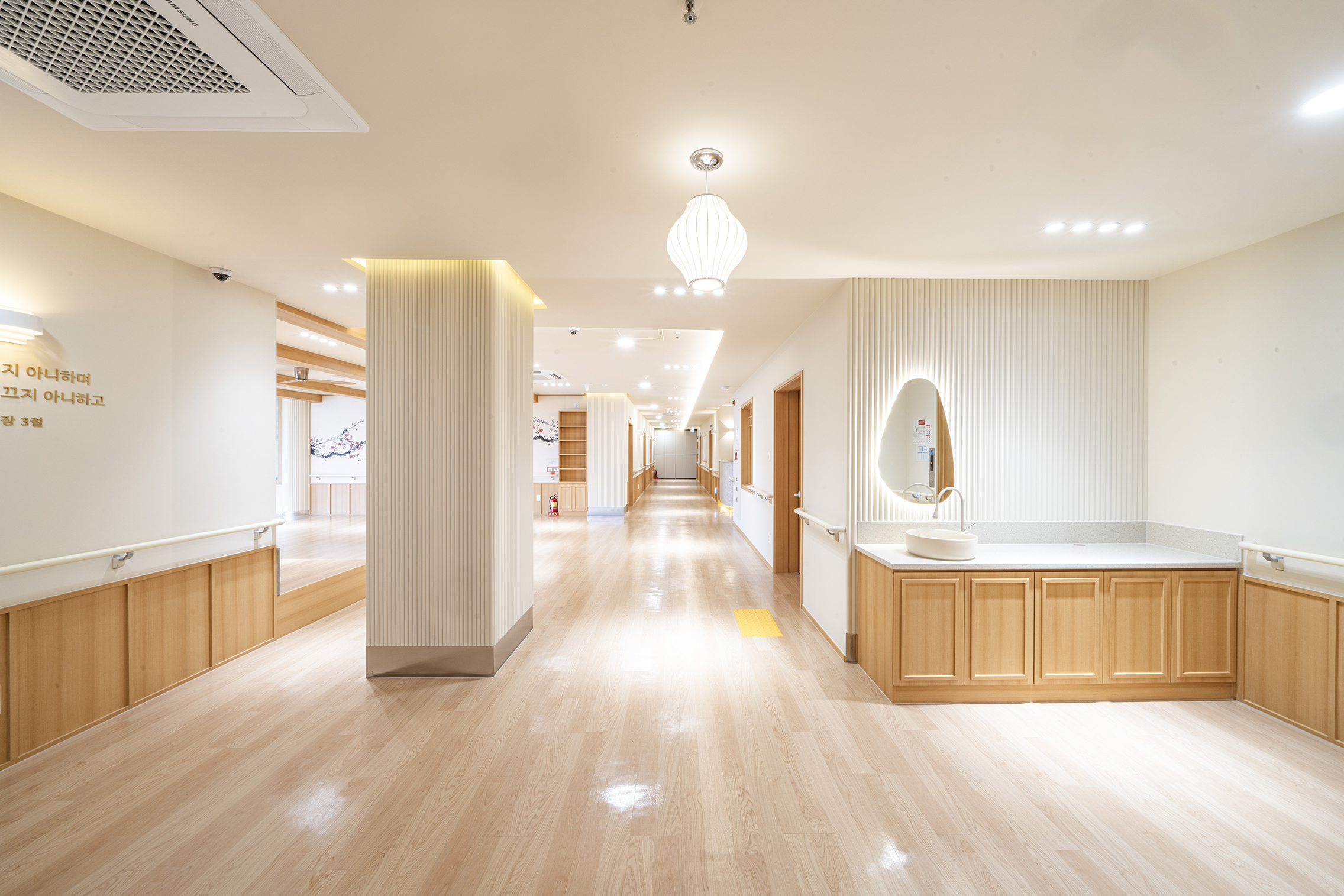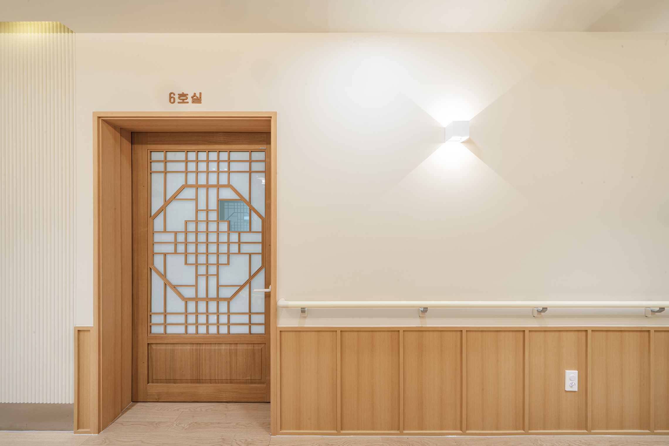 Podowon Geriatric care center, which has a vision of 'a geriatric care center that is trusted by the family and heals the indisposed body and mind of the elderly', is located at the foot of a mountain with a beautiful scenery in Namwon, Jeollabuk-do. We remodeled the second floor of the four-story geriatric care center and added openness to the existing structure to specialize in caring for the elderly with Alzheimer's disease. In consideration of the preferences of the elderly who are the ones mainly living here, the entrances to all rooms were decorated with a traditional pattern. Wood and cream were mixed for the overall color to give a fresh feeling. In particular, low wooden benches were formed along the edges of the living room to create a space for the elderly to lie down and rest, and the height of the benches was set through simulation to help caregivers care for the elderly. Between the traditional and the modern, more emphasis was placed on modernity to relieve the sense of weightiness. In most geriatric care centers, the guardians (children of the elderly) are the ones who look around and make decisions. Therefore, the starting point of he design was the thought that they should have no regrets about the facility when returning with their parents. Since they had to at least be reassured that their parents are living in a better facility than the house they were living in, we designed the software related to the operation of the geriatric care center to be able to be incorporated with the interior, which is the hardware. The corridor is divided into the lower and upper parts based on the safety handles. The upper part was finished with cream colored paint, and for the lower part, both circulation and practicality were considered by using reinforced plywood and internal wood film to prevent damage to the walls from wheelchairs for the elderly with limited mobility. Due to its nature, the geriatric care center has many supplies, so all available space below the bench and along the walls of the corridor were made to be used as storage spaces, and considering the visual aspect after they are stored, doors were made for all of these storage spaces to allow them to be covered by the design.