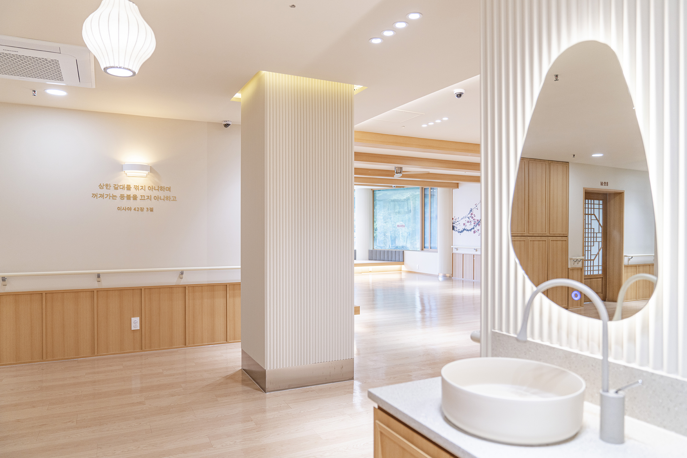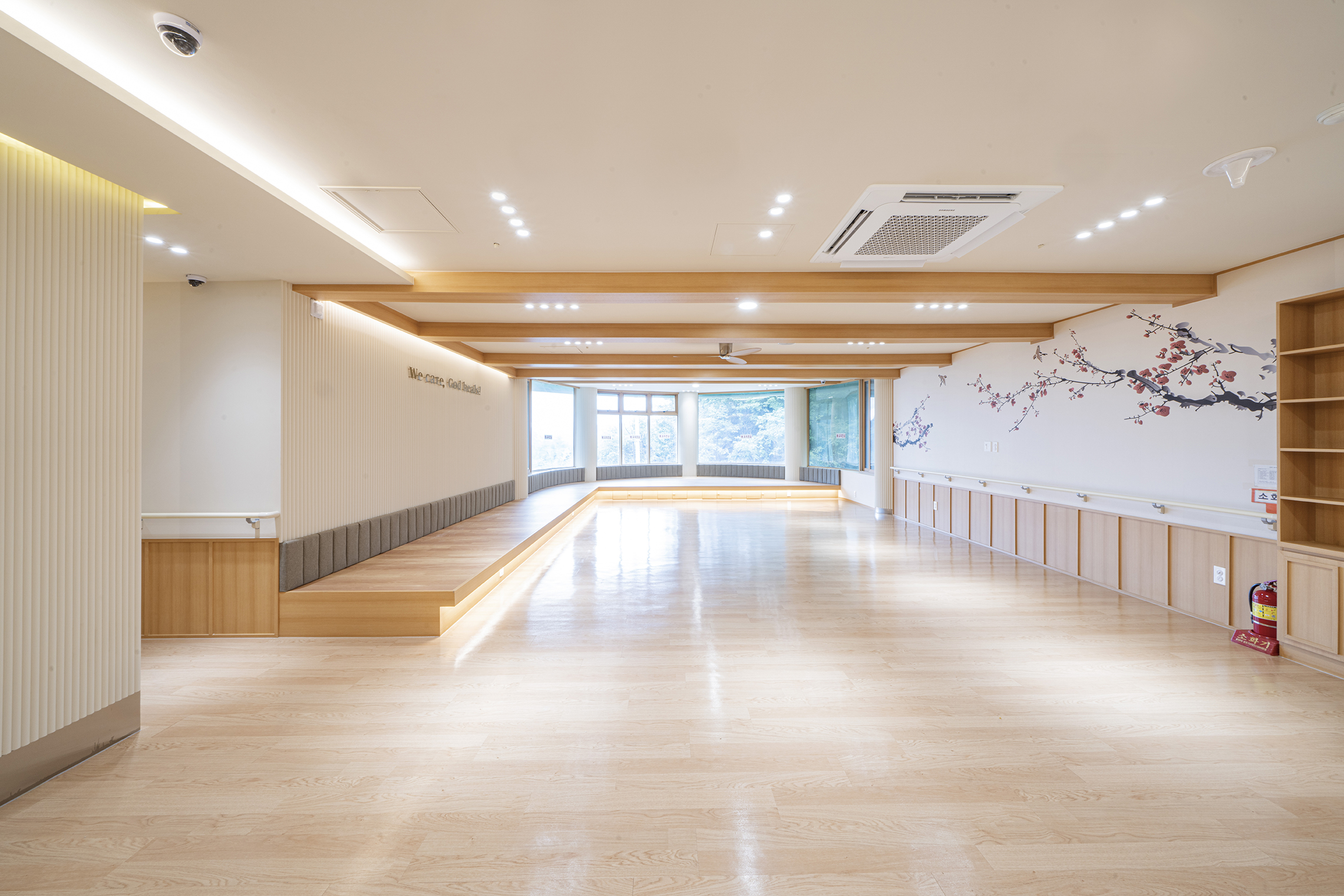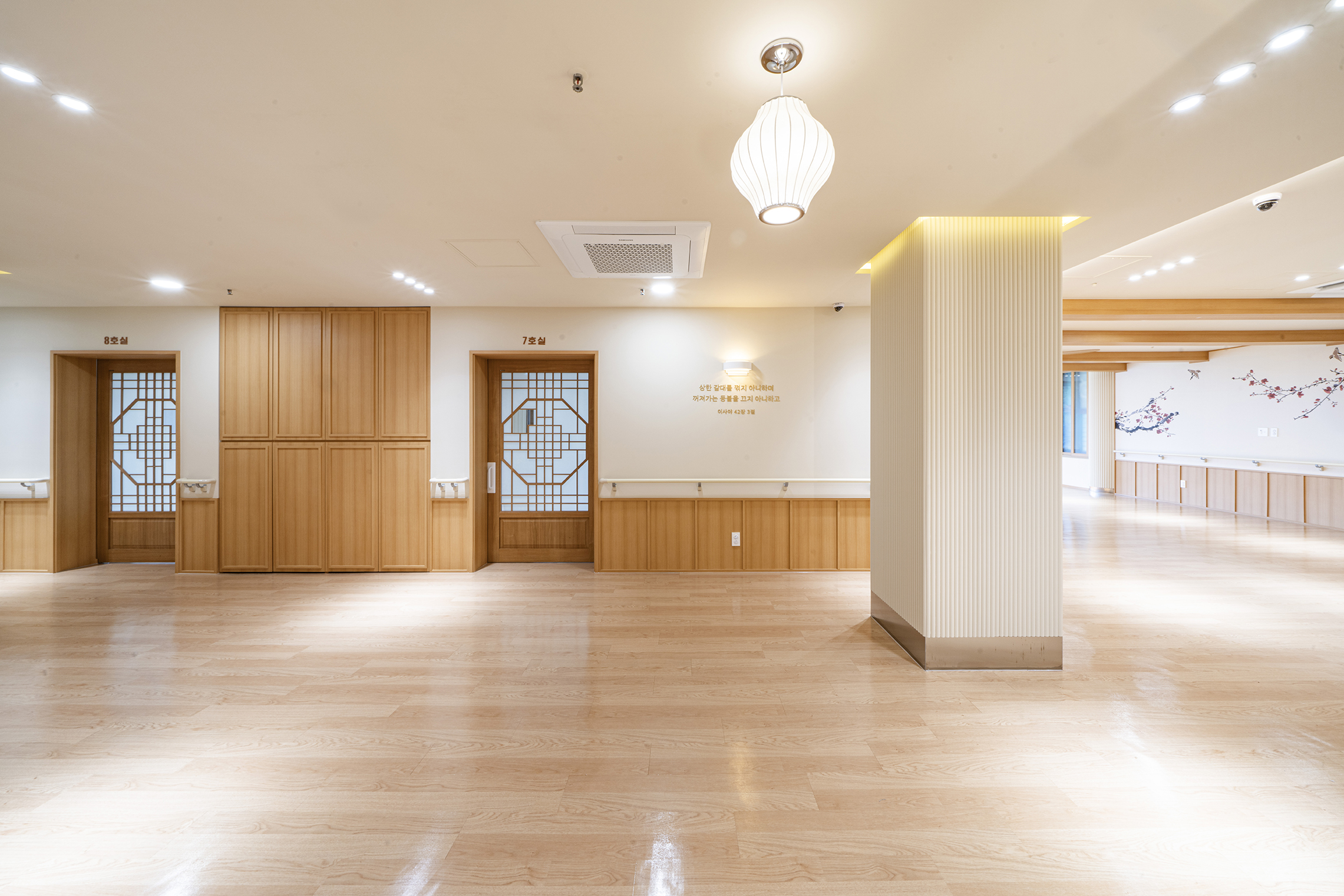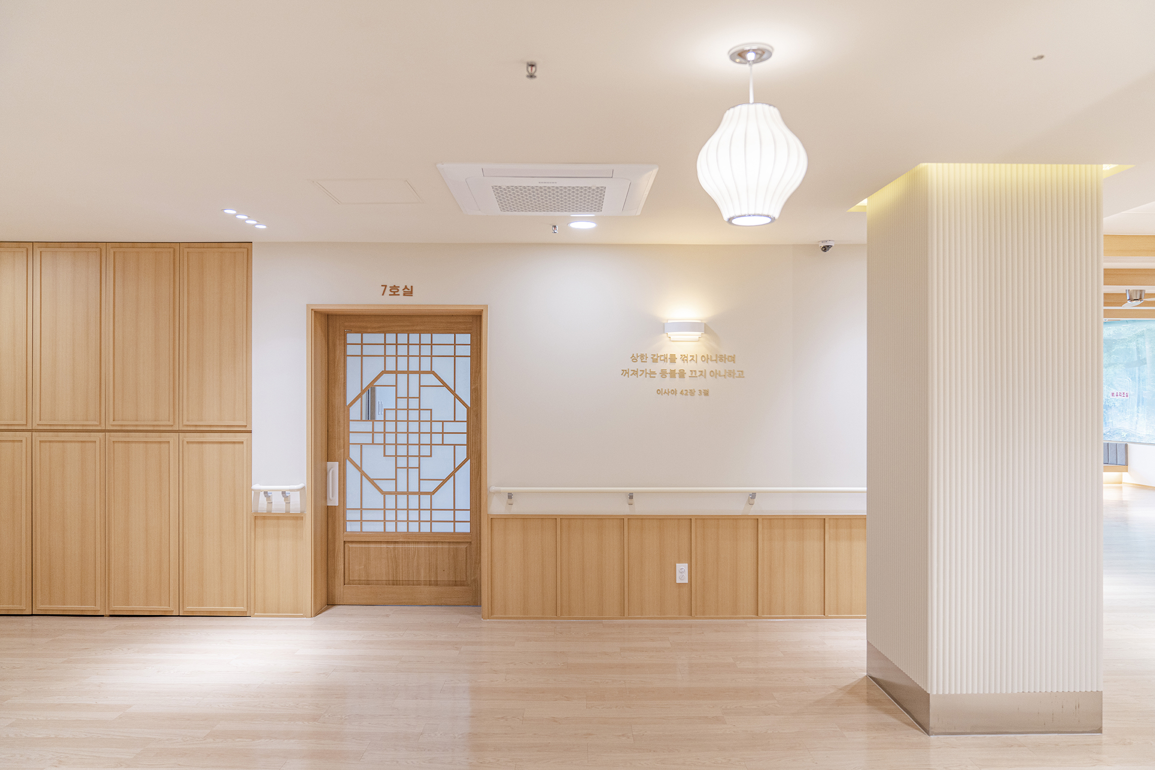 Podowon Geriatric care center, which has a vision of 'a geriatric care center that is trusted by the family and heals the indisposed body and mind of the elderly', is located at the foot of a mountain with a beautiful scenery in Namwon, Jeollabuk-do. We remodeled the second floor of the four-story geriatric care center and added openness to the existing structure to specialize in caring for the elderly with Alzheimer's disease. In consideration of the preferences of the elderly who are the ones mainly living here, the entrances to all rooms were decorated with a traditional pattern. Wood and cream were mixed for the overall color to give a fresh feeling. In particular, low wooden benches were formed along the edges of the living room to create a space for the elderly to lie down and rest, and the height of the benches was set through simulation to help caregivers care for the elderly. Between the traditional and the modern, more emphasis was placed on modernity to relieve the sense of weightiness. In most geriatric care centers, the guardians (children of the elderly) are the ones who look around and make decisions. Therefore, the starting point of he design was the thought that they should have no regrets about the facility when returning with their parents. Since they had to at least be reassured that their parents are living in a better facility than the house they were living in, we designed the software related to the operation of the geriatric care center to be able to be incorporated with the interior, which is the hardware. The corridor is divided into the lower and upper parts based on the safety handles. The upper part was finished with cream colored paint, and for the lower part, both circulation and practicality were considered by using reinforced plywood and internal wood film to prevent damage to the walls from wheelchairs for the elderly with limited mobility. Due to its nature, the geriatric care center has many supplies, so all available space below the bench and along the walls of the corridor were made to be used as storage spaces, and considering the visual aspect after they are stored, doors were made for all of these storage spaces to allow them to be covered by the design.