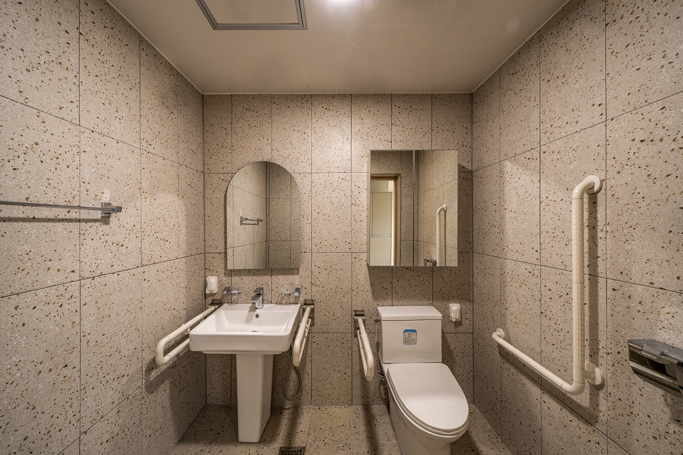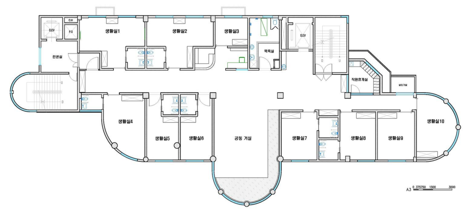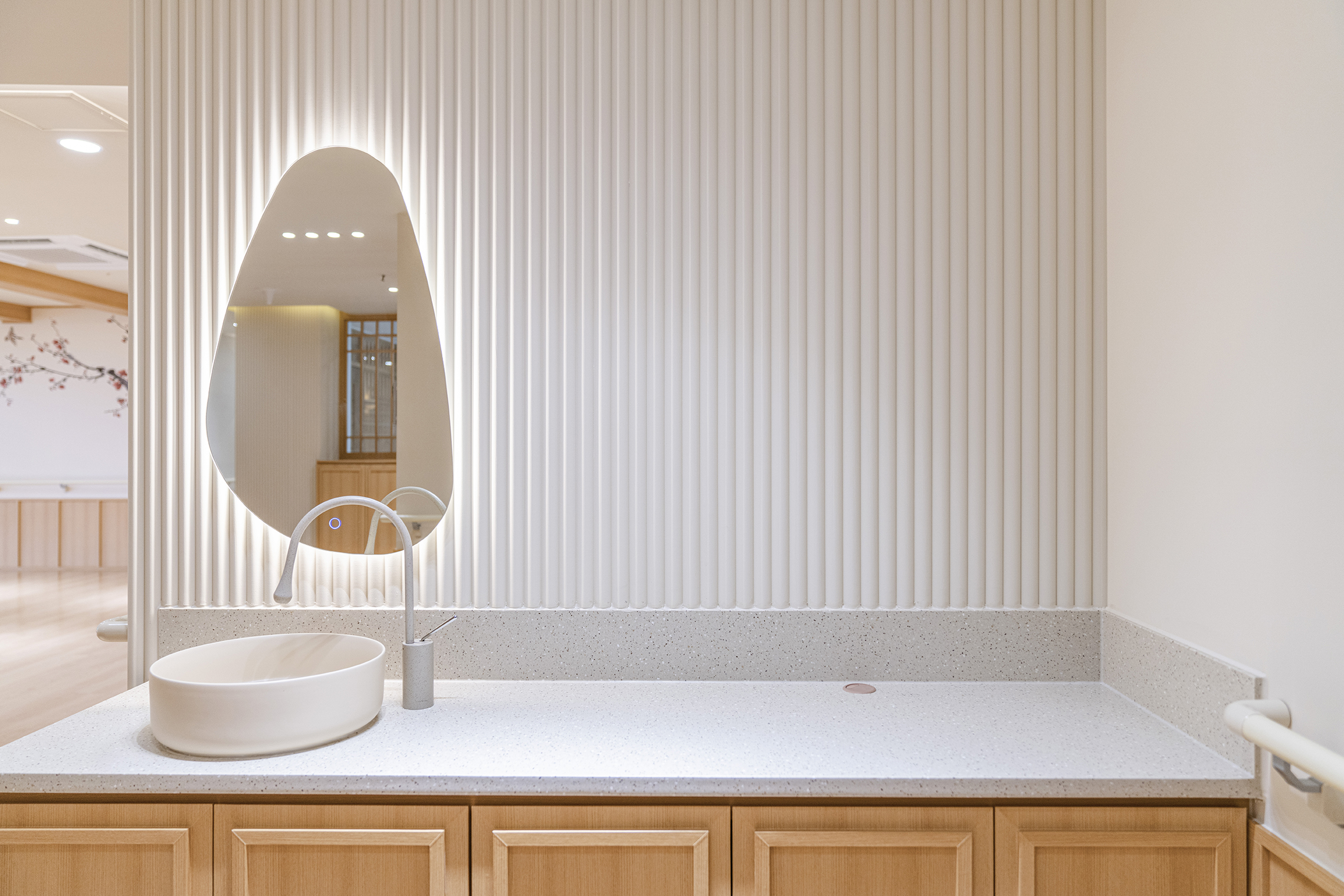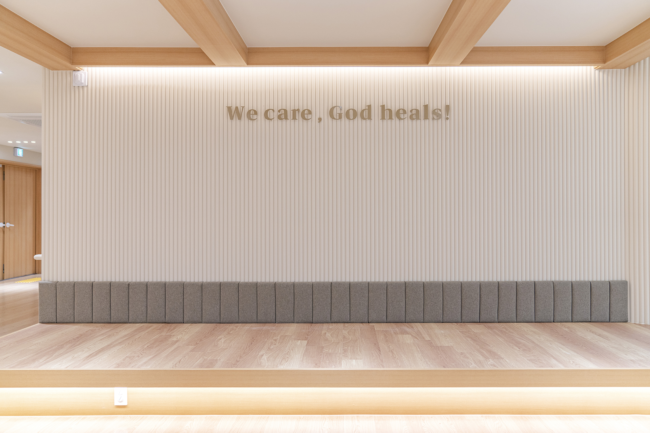 Podowon Geriatric care center, which has a vision of 'a geriatric care center that is trusted by the family and heals the indisposed body and mind of the elderly', is located at the foot of a mountain with a beautiful scenery in Namwon, Jeollabuk-do. We remodeled the second floor of the four-story geriatric care center and added openness to the existing structure to specialize in caring for the elderly with Alzheimer's disease. In consideration of the preferences of the elderly who are the ones mainly living here, the entrances to all rooms were decorated with a traditional pattern. Wood and cream were mixed for the overall color to give a fresh feeling. In particular, low wooden benches were formed along the edges of the living room to create a space for the elderly to lie down and rest, and the height of the benches was set through simulation to help caregivers care for the elderly. Between the traditional and the modern, more emphasis was placed on modernity to relieve the sense of weightiness. In most geriatric care centers, the guardians (children of the elderly) are the ones who look around and make decisions. Therefore, the starting point of he design was the thought that they should have no regrets about the facility when returning with their parents. Since they had to at least be reassured that their parents are living in a better facility than the house they were living in, we designed the software related to the operation of the geriatric care center to be able to be incorporated with the interior, which is the hardware. The corridor is divided into the lower and upper parts based on the safety handles. The upper part was finished with cream colored paint, and for the lower part, both circulation and practicality were considered by using reinforced plywood and internal wood film to prevent damage to the walls from wheelchairs for the elderly with limited mobility. Due to its nature, the geriatric care center has many supplies, so all available space below the bench and along the walls of the corridor were made to be used as storage spaces, and considering the visual aspect after they are stored, doors were made for all of these storage spaces to allow them to be covered by the design.