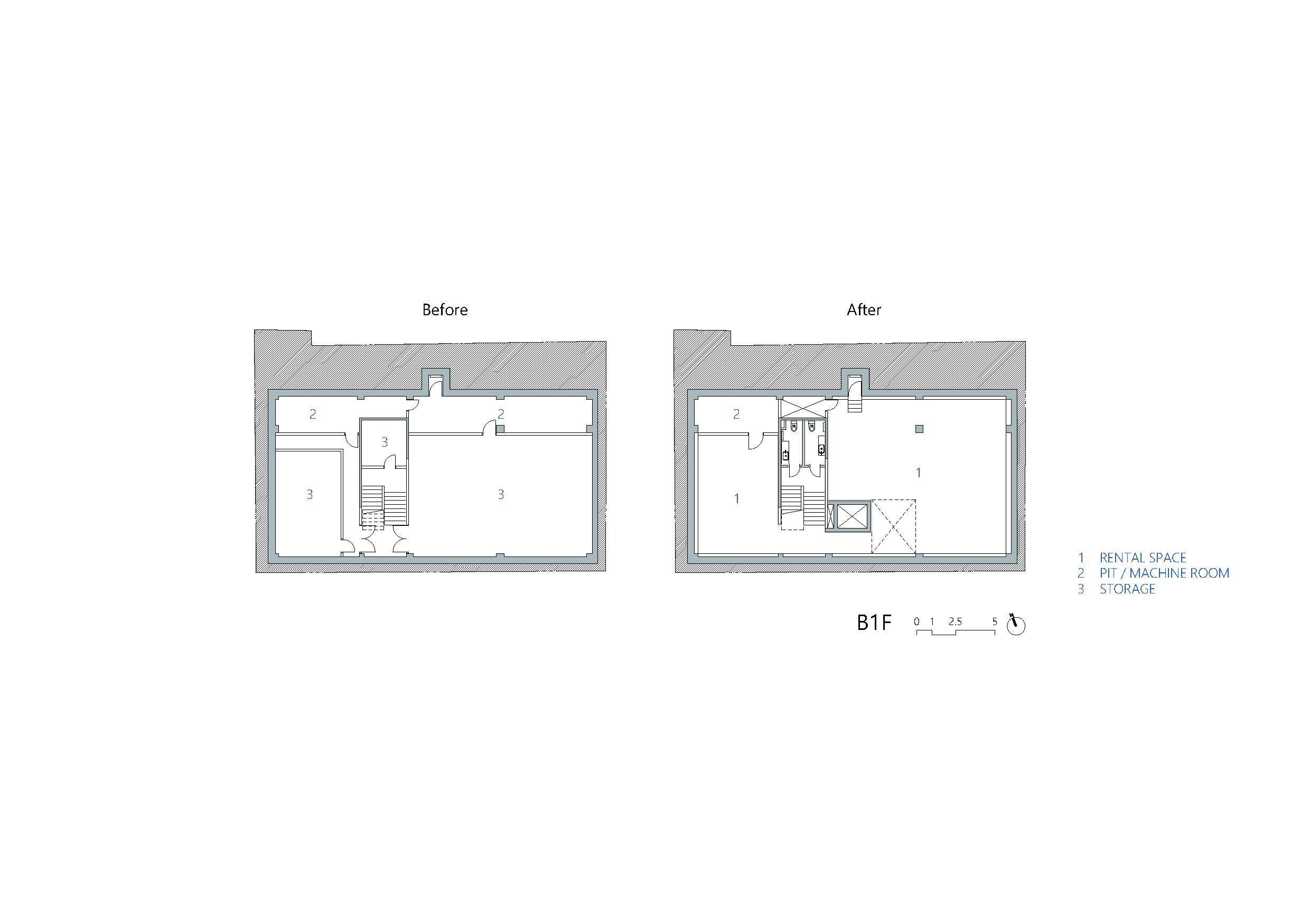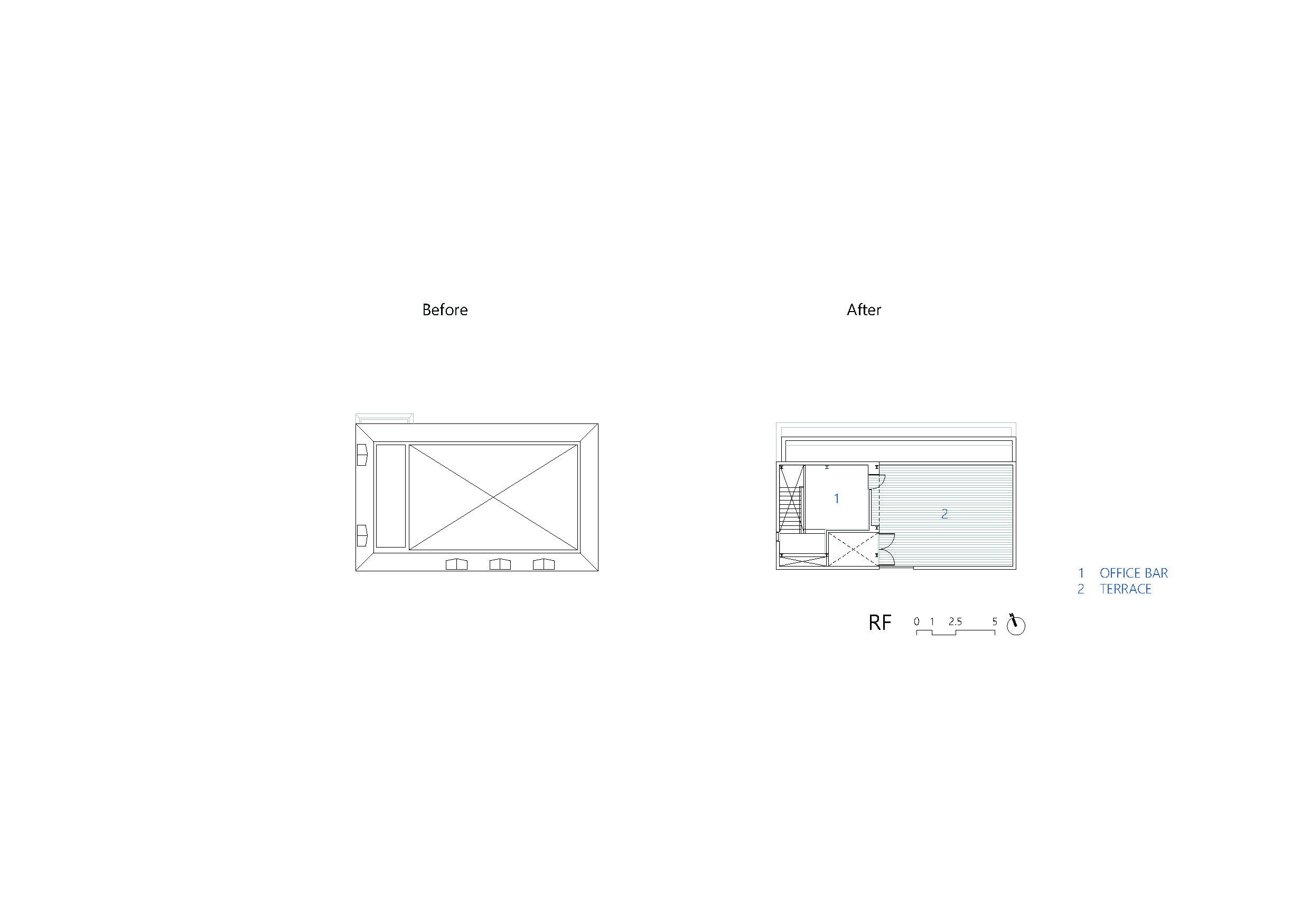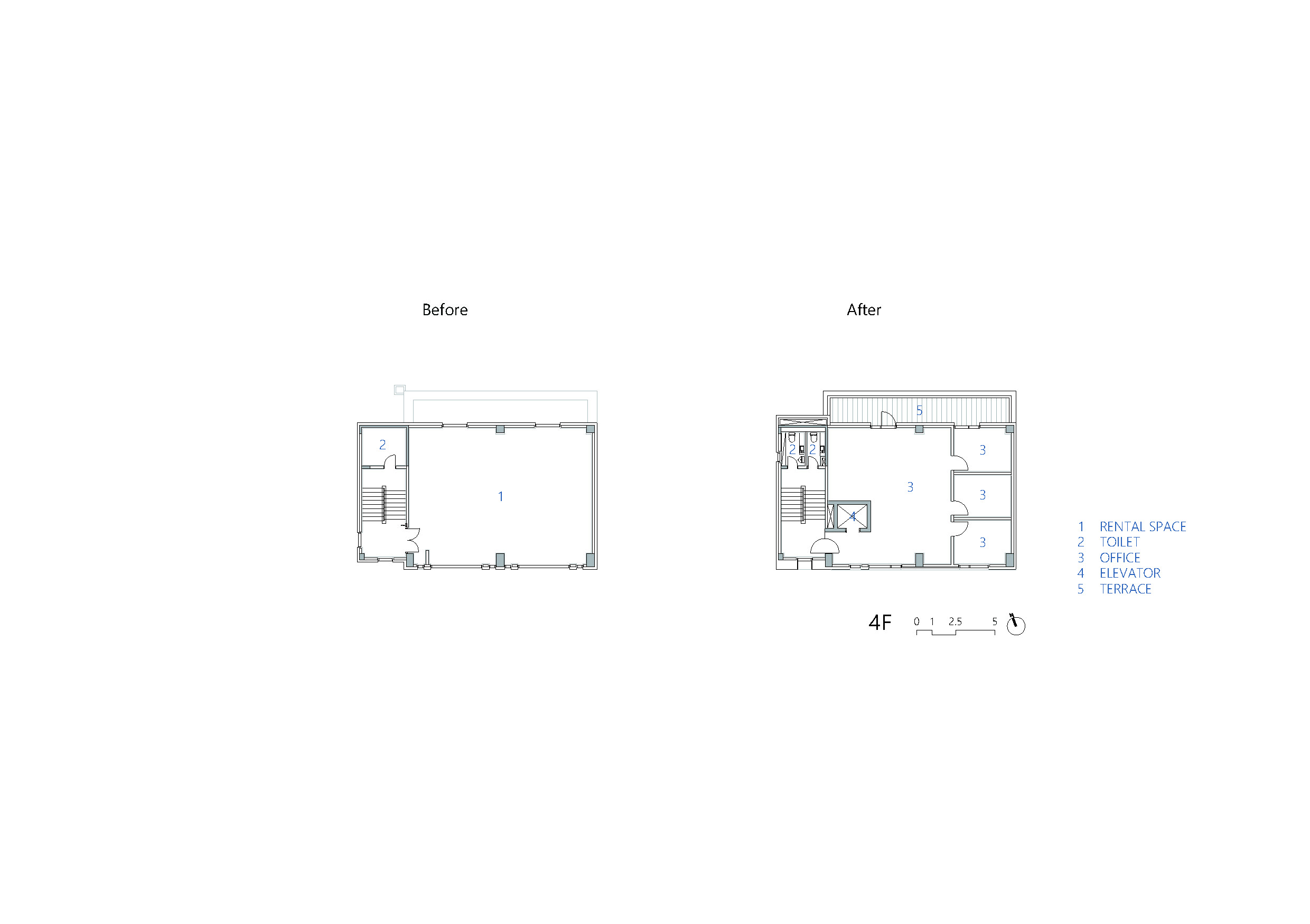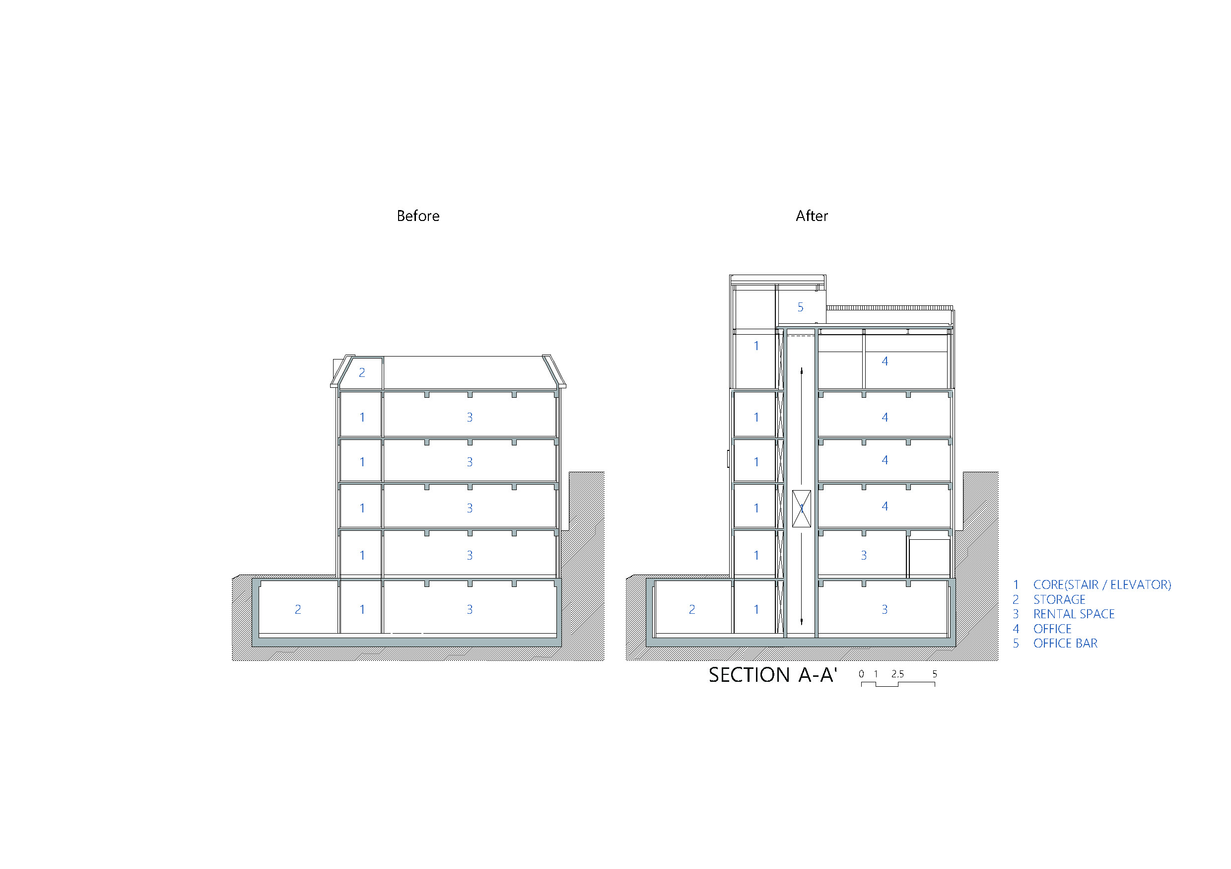 먼저, 기존 건물을 디자인사무소의 사옥으로 변경하는 과정에서 각 공간을 재구성, 재배치하는 것이 필요했다. 전면 경사도로의 레벨 차이를 이용하여 기존 1층과 2층 사이 계단참의 화장실 공간을 메인 로비로 변경하고, 기존 출입구를 1층과 지하층만의 전용 입구로 계획하여 사옥 이용자와 임차인을 사전 구분했다. 2층부터 시작되는 사옥은 각 층의 넓은 계단참을 이용하여 풍요로운 휴게공간을 곳곳에 배치했고, 각 부서 및 실별 프로그램의 특징에 맞는 공간을 구성했다. 특히, 기존 4층을 5층으로 수직 증축하며 얻어낸 층고가 높은 회의실과 옥상정원에 연계된 옥탑의 오피스 바는 아현동의 경관을 파노라믹 뷰로 볼 수 있어 좋은 인상을 줄 수 있도록 했다.