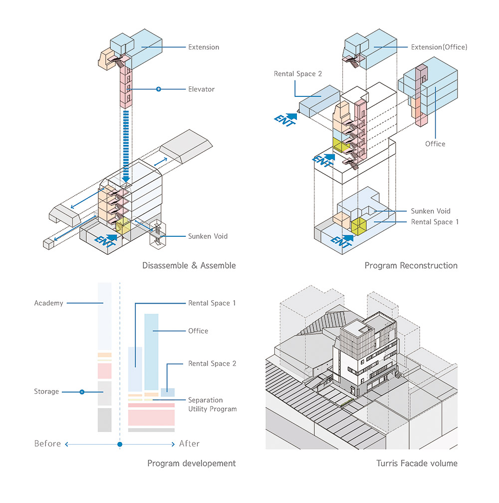 The residents of this redevelopment area have been left without change for a long time due to various conflicts and political reasons. This neighborhood that has not even tried a small change for a bigger change is ailing deeper for such a reason. At the desperate time when a new owner is eagerly awaited to appear after the building had been abandoned empty for so long, the client full of the adventurous mind bought it, and lively wind started blowing. From before Christ, Turis had the function of a fairly difficult building that accompanied the extreme human labor displaying the power of the ruler, but its role of sacredness and a local landmark with a unique message was prioritized. The façade of the concise design language, erected carefully and neatly as if building up heavy stones one by one, contrasts with the old and chaotic alleys to revitalize the neighborhood.