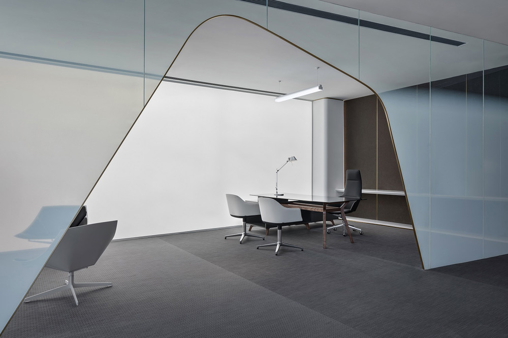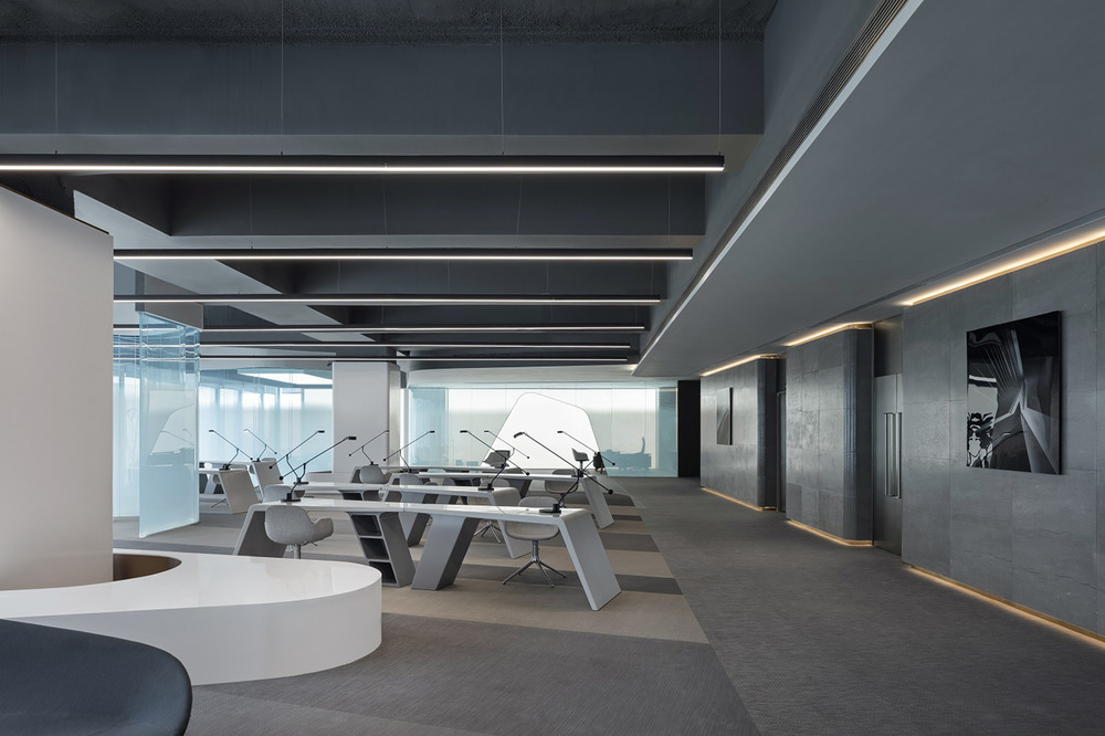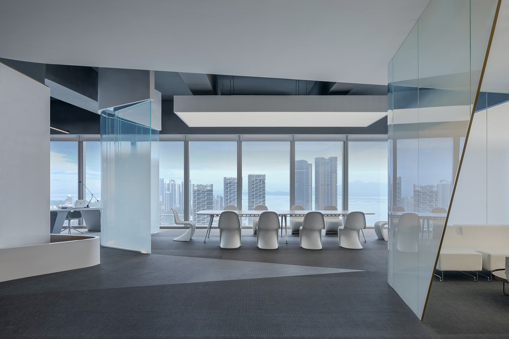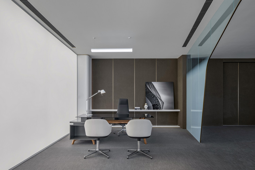 The glass wall, with a strong sense of flow, is integrated harmoniously with the city view, unifying the overall composition and integrating the spatial composition, so that the office space explodes with dimensional field energy. Viewers standing here are also in the invisible artistic energy field.