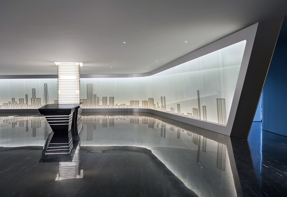 Composed of a series of horizontal commercial buildings, another of vertical office buildings and facing the bay with Nanshan park in the background, Prince Square is richly endowed with a unique mountain and sea landscape. The external architecture was designed by the Office for Metropolitan Architecture (OMA). In this office tower, shaped like an art gallery, YuQiang & Partners created a modern commercial office exhibition space for China Merchants Shekou Holdings with a theme of energy.