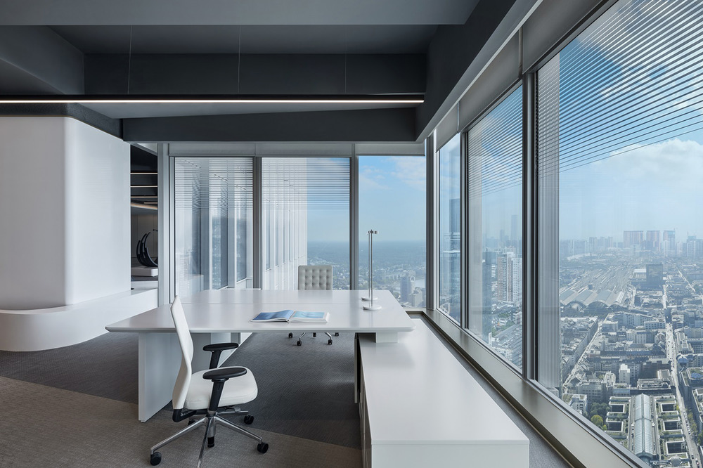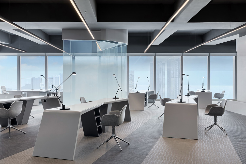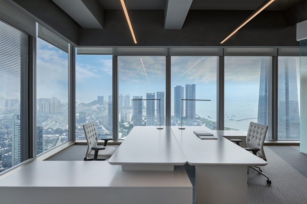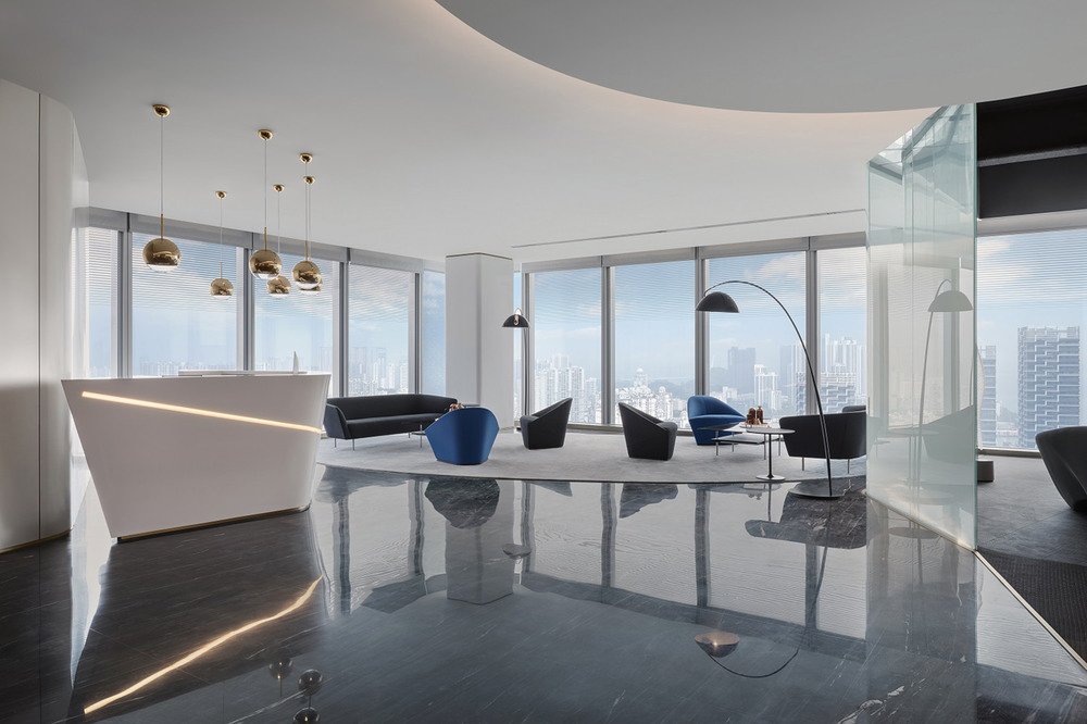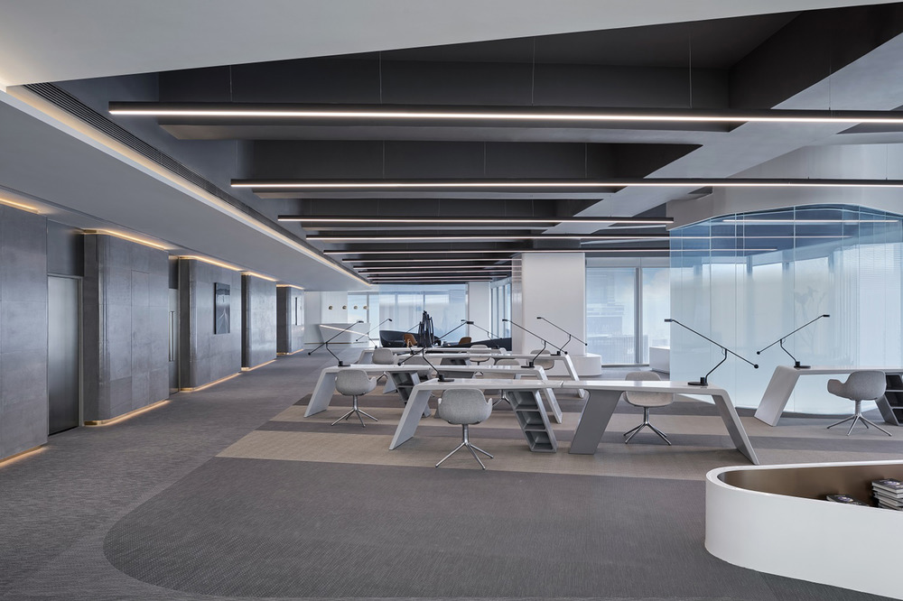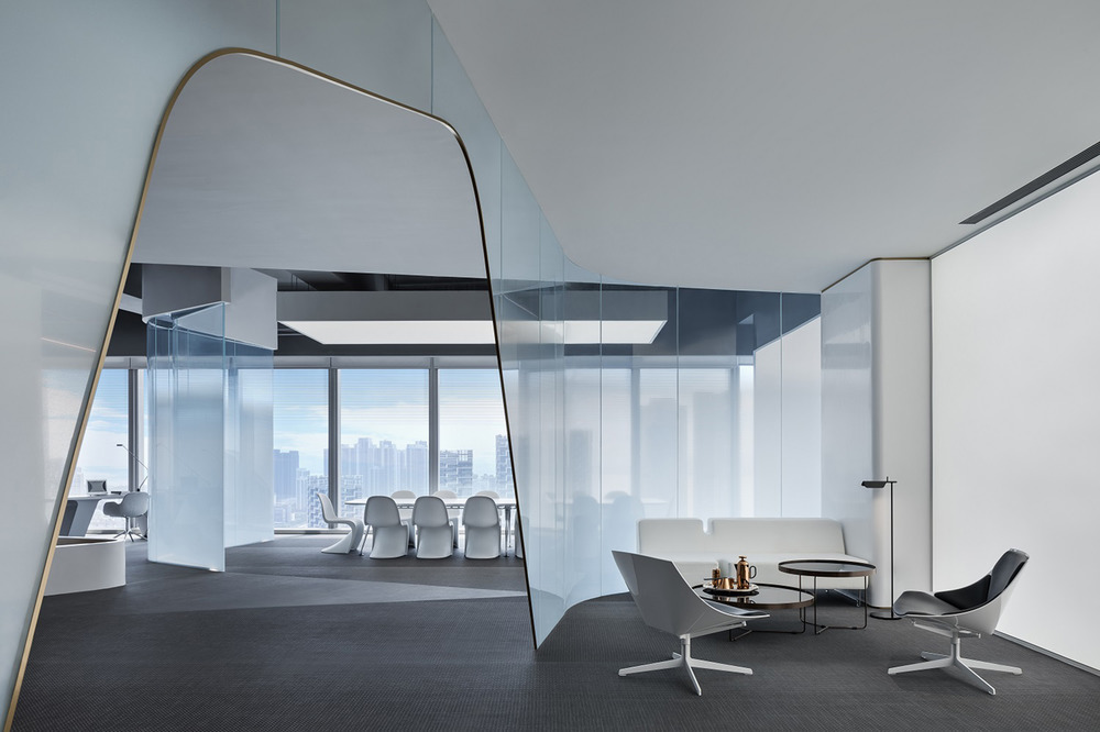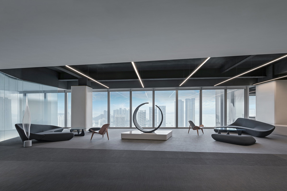 The glass wall, with a strong sense of flow, is integrated harmoniously with the city view, unifying the overall composition and integrating the spatial composition, so that the office space explodes with dimensional field energy. Viewers standing here are also in the invisible artistic energy field.