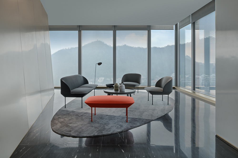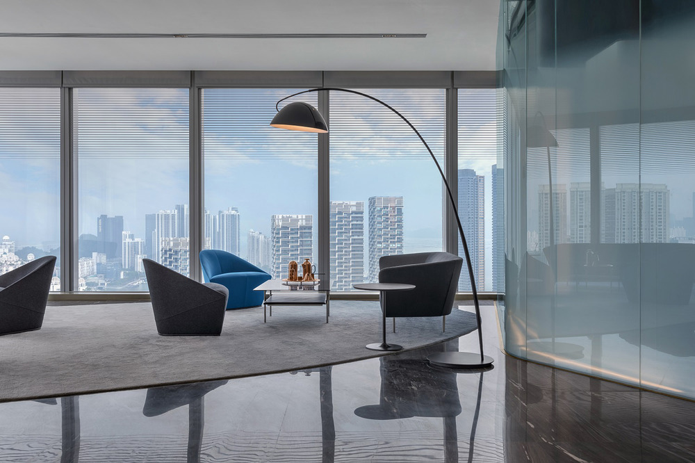 Palissandro blue 대리석과 아크릴은 Prince Plaza의 기초를 형성하고 사무실 초고층 건물은 시선을 끌기 위해 우뚝 솟아 있다. 밀폐된 공간의 범위 내에서 Shekou 건물은 조직적으로 두드러진다. 디자이너들은 다양한 현대적 형태를 추출하고 금속 세공물을 형성하여 광둥-홍콩-마카오 그레이터 베이 지역의 눈부신 스카이라인의 윤곽을 그렸다. 디자인은 조명과 상호 작용하여 공간을 밝게 한다. 단색 회색 톤의 전망대에서 Mutto의 Oslo 시리즈 소파는 편안하고 조용한 코너를 연출한다.