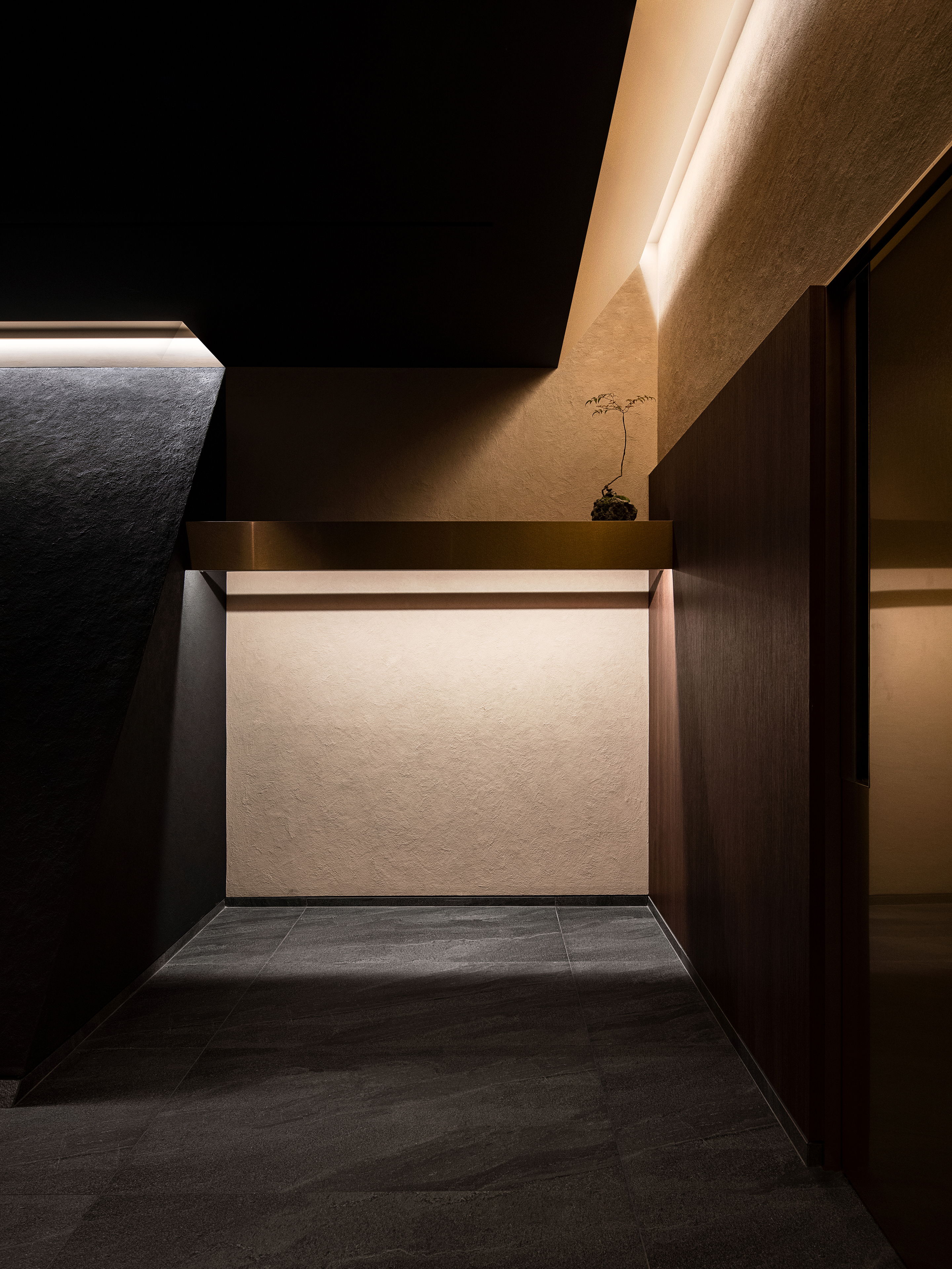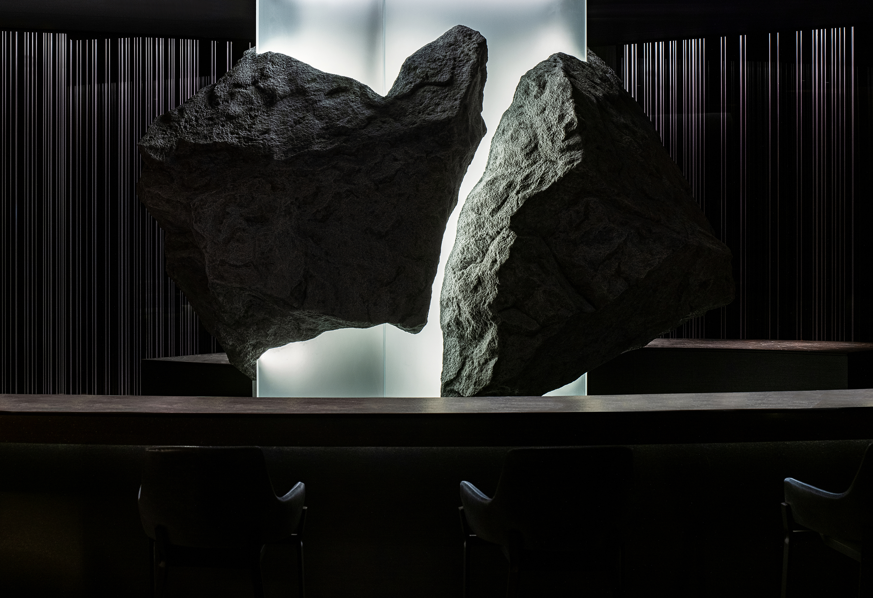 게이트를 통과해서 나오는 좁고 긴 복도는 바닥 패턴과 3 면에서 나오는 반복적인 라인 라이팅으로 인해 홀에 들어가기 위한 전이공간으로 몰입감을 가져다준다. 홀에 들어서면 라운드로 디자인된 바와 라이팅 기둥에 박혀있는 바위를 보고 임팩트를 받는다. 바에서는 셰프들의 움직임으로 공간이 채워지고 활력이 업그레이드된다. 그리고 사선의 벽체와 띄워져 있는 가운데 메스 등에 박혀있는 원형의 벵큇 좌석들이 공간의 풍요로움을 제공한다.
