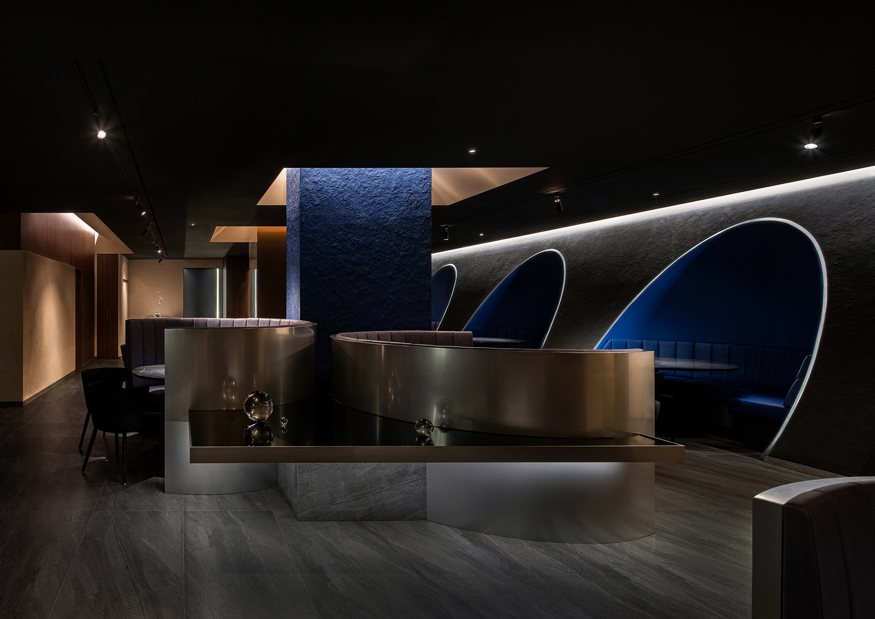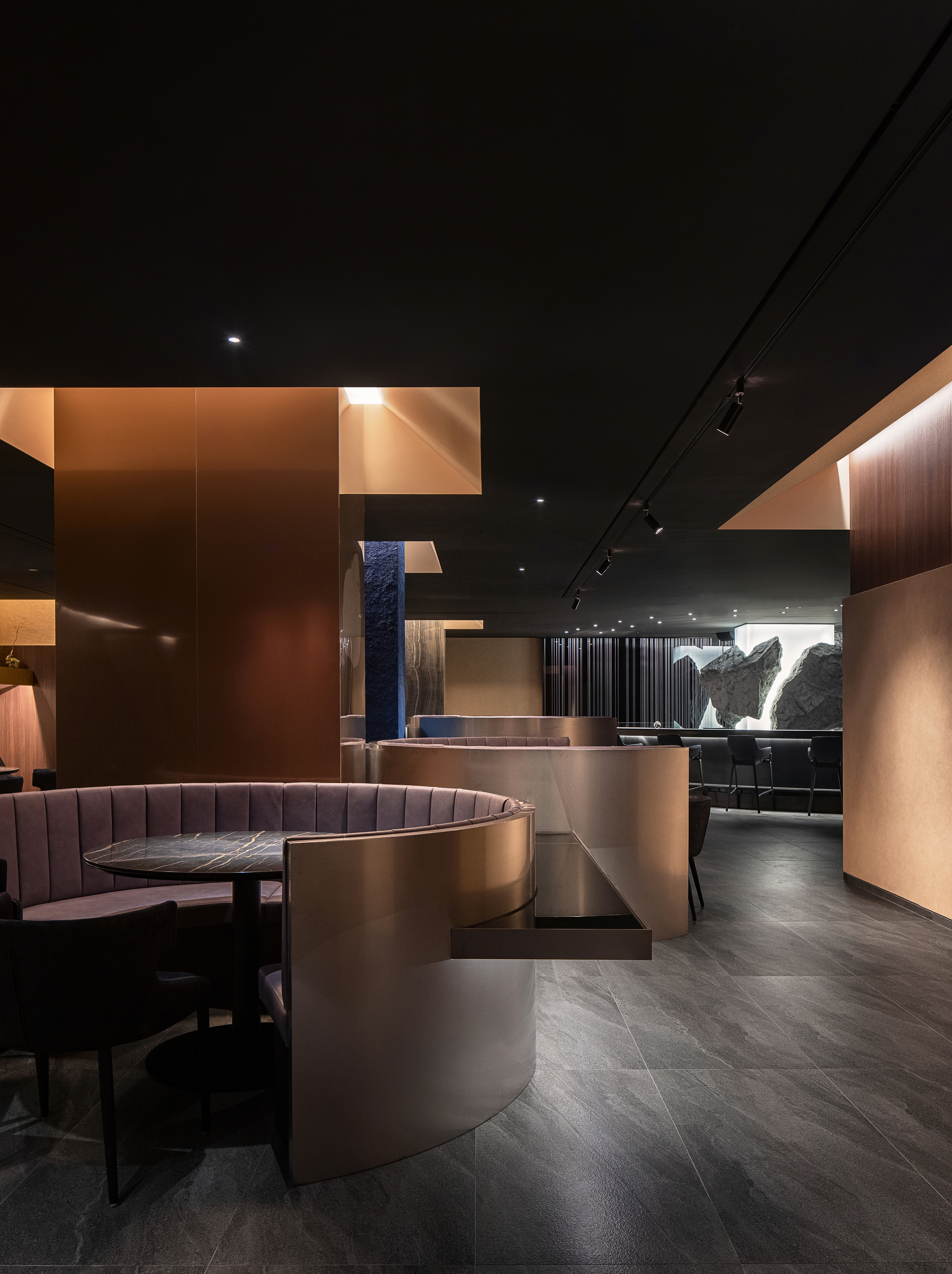 The narrow and long corridor that is found through the gate brings a sense of immersion as a transition space for entering the hall due to the floor pattern and repeated line lighting from the three sides. Upon entering the hall, visitors are impressed by the round-designed bar and the rocks embedded in the light pillars. In the bar, the space is filled with the movement of the chefs and its vitality is enhanced. In addition, the diagonal wall and the circular banquet seats embedded in the floating middle mass provide a richness to the space.