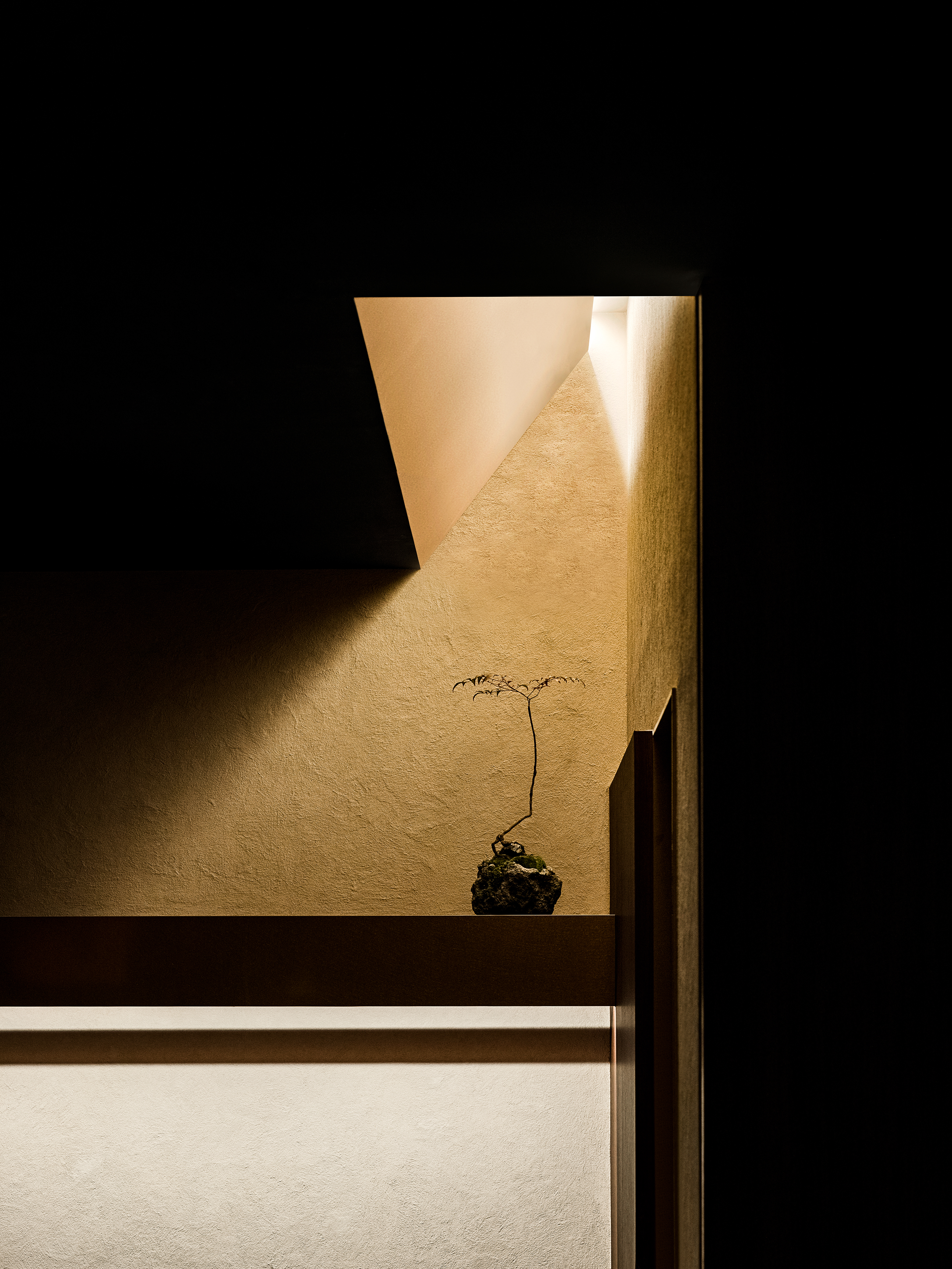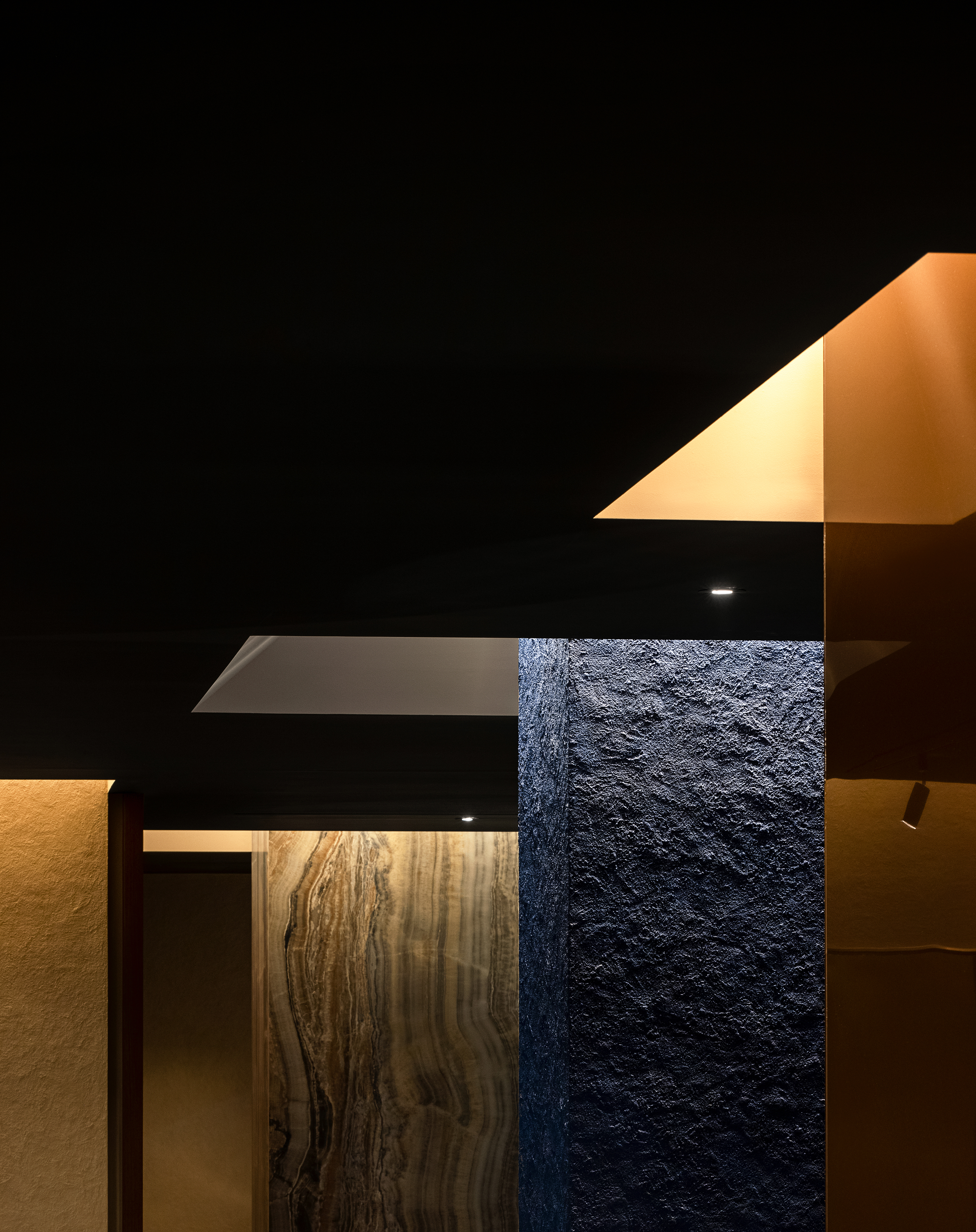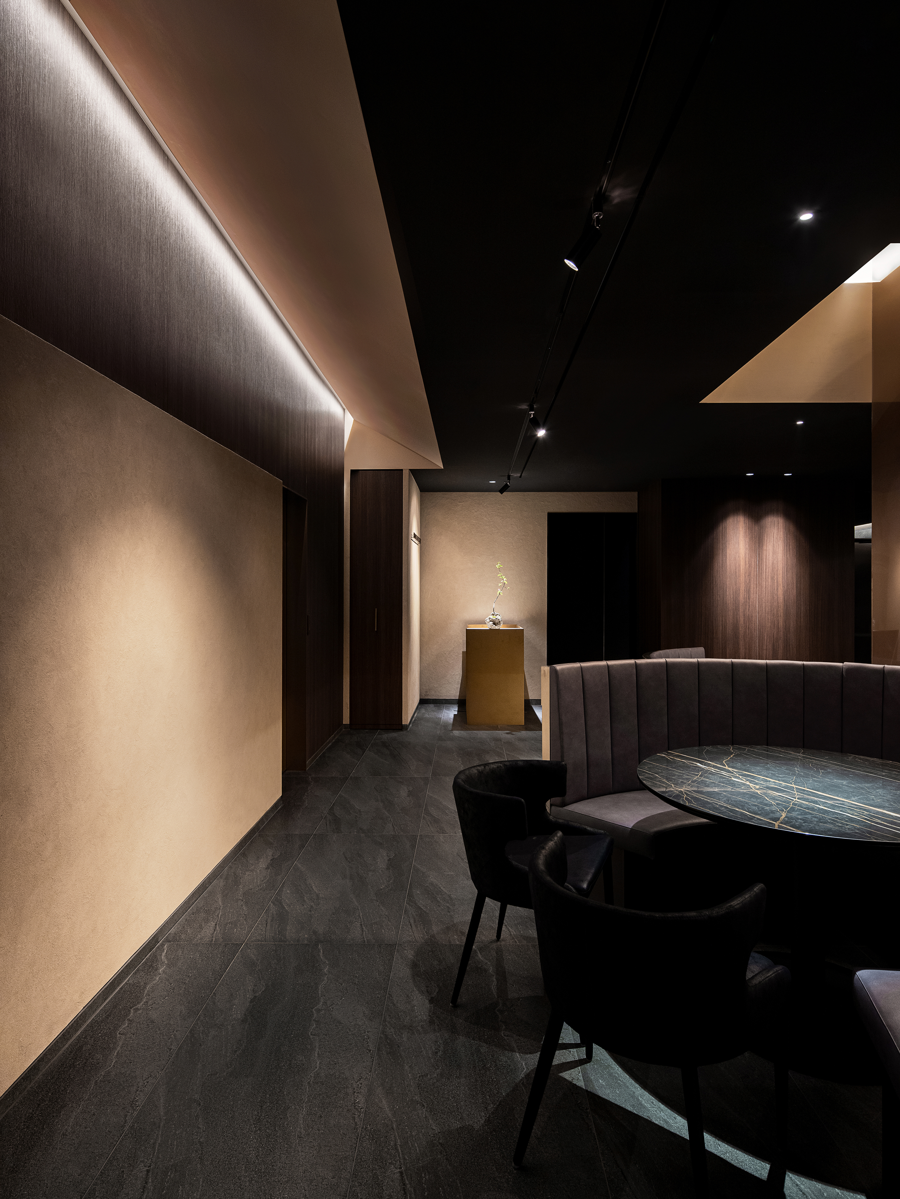 천정은 다크한 한 톤으로 마감했지만 기둥들과 사선의 벽체, 룸, 서비스 공간 메스가 맞닿은 천정은 사선으로 파여서 따듯한 빛을 쏟아내어 각기 다른 장면을 보였던 공간을 융합하는 역할과 동시에 신선함을 제공한다. 룸은 총 2가지가 있고 각각 다른 콘셉트로 디자인하여 고객이 룸을 여러 번 이용하더라도 각기 다른 경험을 제공하고 싶었다. 첫 번째 룸은 패턴 유리를 이용해 빛의 산란을 유도하여 내부에서 식사하지만 유리 바깥의 공간은 외부의 느낌으로 디자인했다. 두 번째 룸은 자연의 상, 하를 뒤집어 꽃과 식물들을 천정에 거꾸로 심어서 사람들에게 식사하는 동시에 공간에서의 색다른 재미를 주었다.
