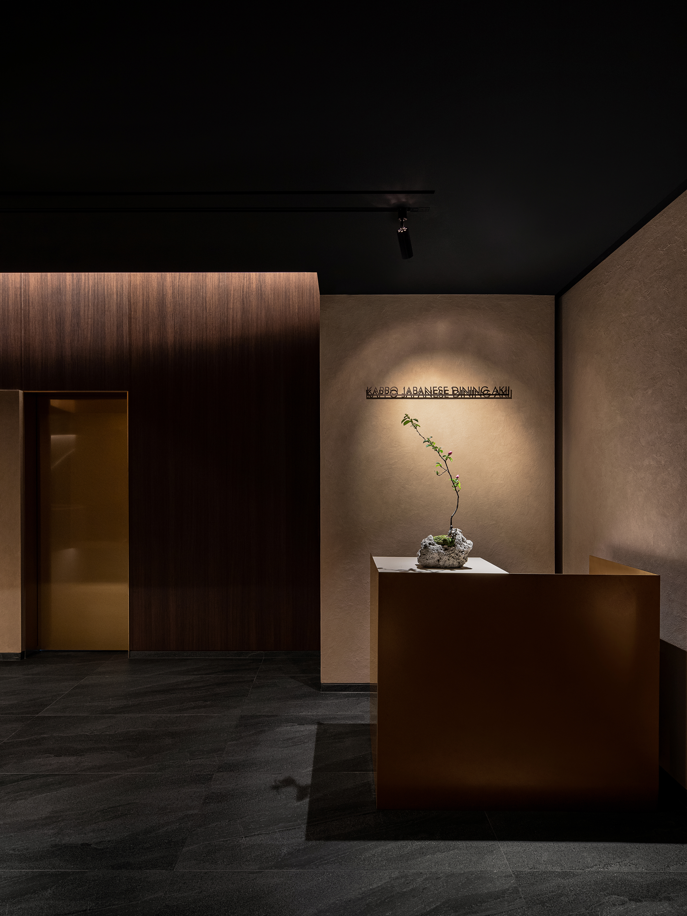 380m²의 갓포아키는 게이트, 복도, 홀, BAR, 룸, 주방 그리고 서비스 AREA로 이루어져 있다. 공간 구성마다 그리고 한 공간 안에서도 다양한 공간감을 주기 위해 각각 새로운 scene을 연출했다. 호텔에서 엘리베이터를 타고 내렸음에도 이 공간의 게이트는 엘리베이터 문으로 디자인되어서 사람들에게 위트 있는 혼동을 주는 동시에 공간을 통과하는 엘리베이터를 탔음에도 변하지 않는 축을 이용해 새로운 경험을 제공한다.