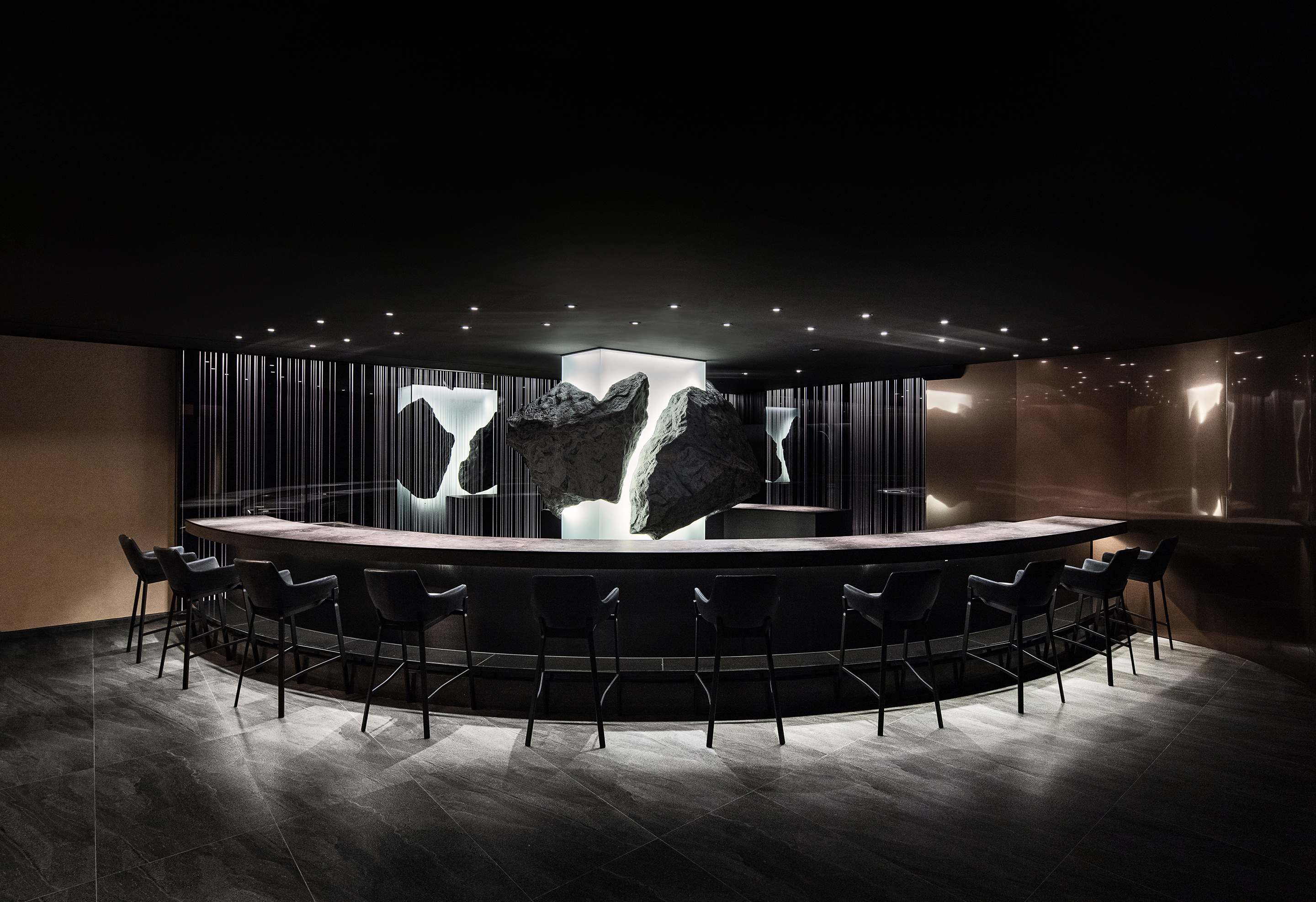 게이트를 통과해서 나오는 좁고 긴 복도는 바닥 패턴과 3 면에서 나오는 반복적인 라인 라이팅으로 인해 홀에 들어가기 위한 전이공간으로 몰입감을 가져다준다. 홀에 들어서면 라운드로 디자인된 바와 라이팅 기둥에 박혀있는 바위를 보고 임팩트를 받는다. 바에서는 셰프들의 움직임으로 공간이 채워지고 활력이 업그레이드된다. 그리고 사선의 벽체와 띄워져 있는 가운데 메스 등에 박혀있는 원형의 벵큇 좌석들이 공간의 풍요로움을 제공한다.