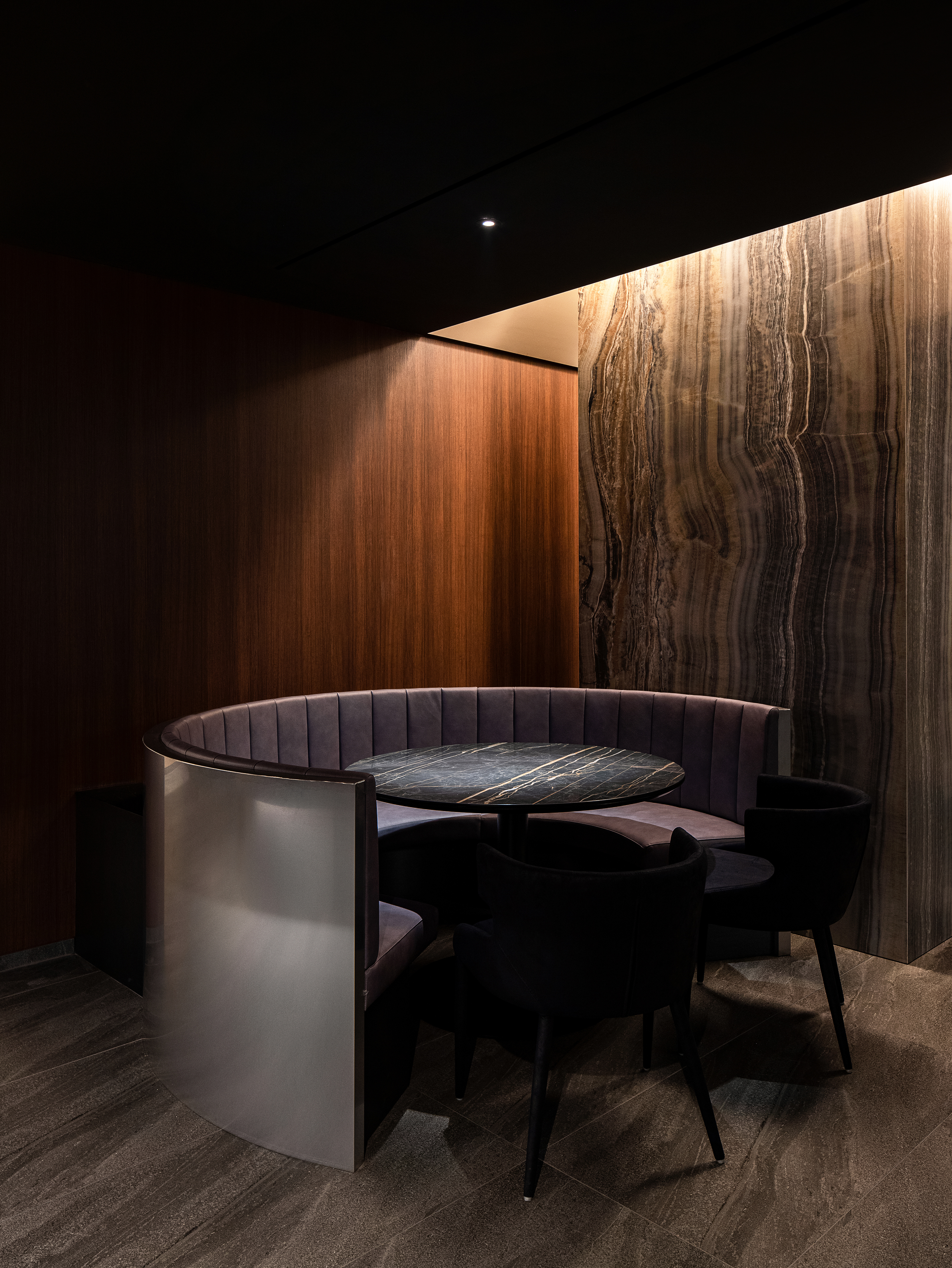 거대한 세개의 기둥은 우드, 네이비 텍스처 페인팅, 대리석 모양의 빅 슬래브(Big slab) 타일로 각기 다른 재질로 마감하여 공간에 대한 다양성을 제공하고 두 개의 기둥을 받치고 있는 메스의 상판은 그레이 경으로 뱅큇 메스와 기둥의 재질을 반사하여 공간의 깊이를 준다. 사선 벽체는 블랙 텍스처 페인팅으로 마감하였지만 좌석이 박힌 공간은 부드러운 네이비 페인트로 재질의 대비를 줘서 식사를 하는 사람에게 안락함을 느끼게 한다. 서비스 공간과 룸은 우드와 베이지 텍스처 페인팅을 믹스 & 매치하여 소재가 가져다주는 따듯함을 표현했고, 공간 전체의 밸런스를 잡아줬다.