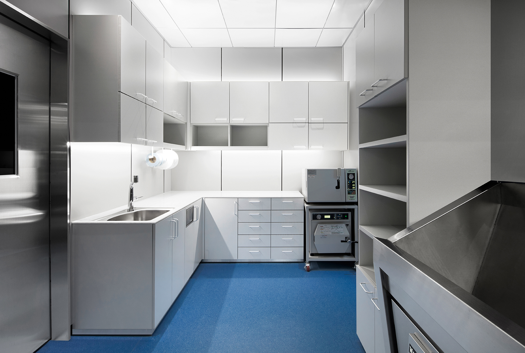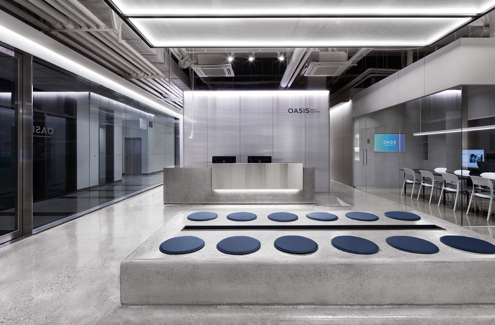 Reinforced concrete was used for the floor of the hospital to solve maintenance and sanitation problems. The rounding of the corners was planned from a management approach to the behavior of dogs peeing. As for the composition of the hospital rooms, the arrangement and spatial composition were planned while considering the characteristics of small dogs, large dogs, and cats. Since the barking of large dogs could interfere with the operation of the treatment rooms, the large dog wards were completed as double rooms with a front room and a water system for efficient excretion management was applied. We believe that filling a space in the most concise way is the way to contain the most. We concentrated on setting a tone that gives off the same energy as a research facility or a laboratory while organizing the floor plan in the most systematic way and reasonably arranging the size and location of each functional room. Although the physical behavior of the patients is taken into account, the guardian’s sense of trust and assurance were prioritized, the entire treatment process (examination>treatment>hospitalization>surgery>rehabilitation treatment>research) was configured to be naturally exposed so that the guardians could visually experience the entire process. After zoning the rooms by each function, each room was formed into a rhythmic mass through a volume study process, and through this, the abundance of the space was aimed to be kept even though the same finishing materials have been used.