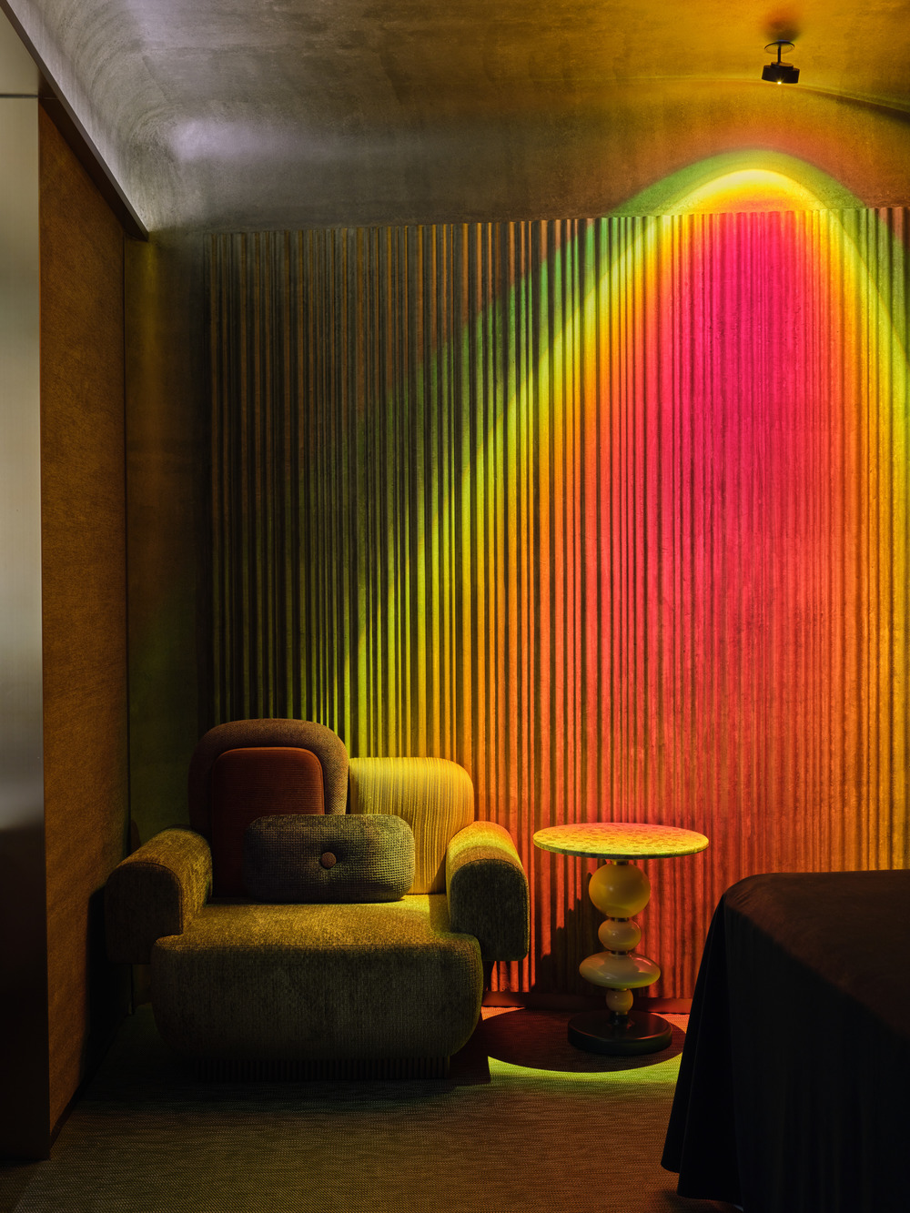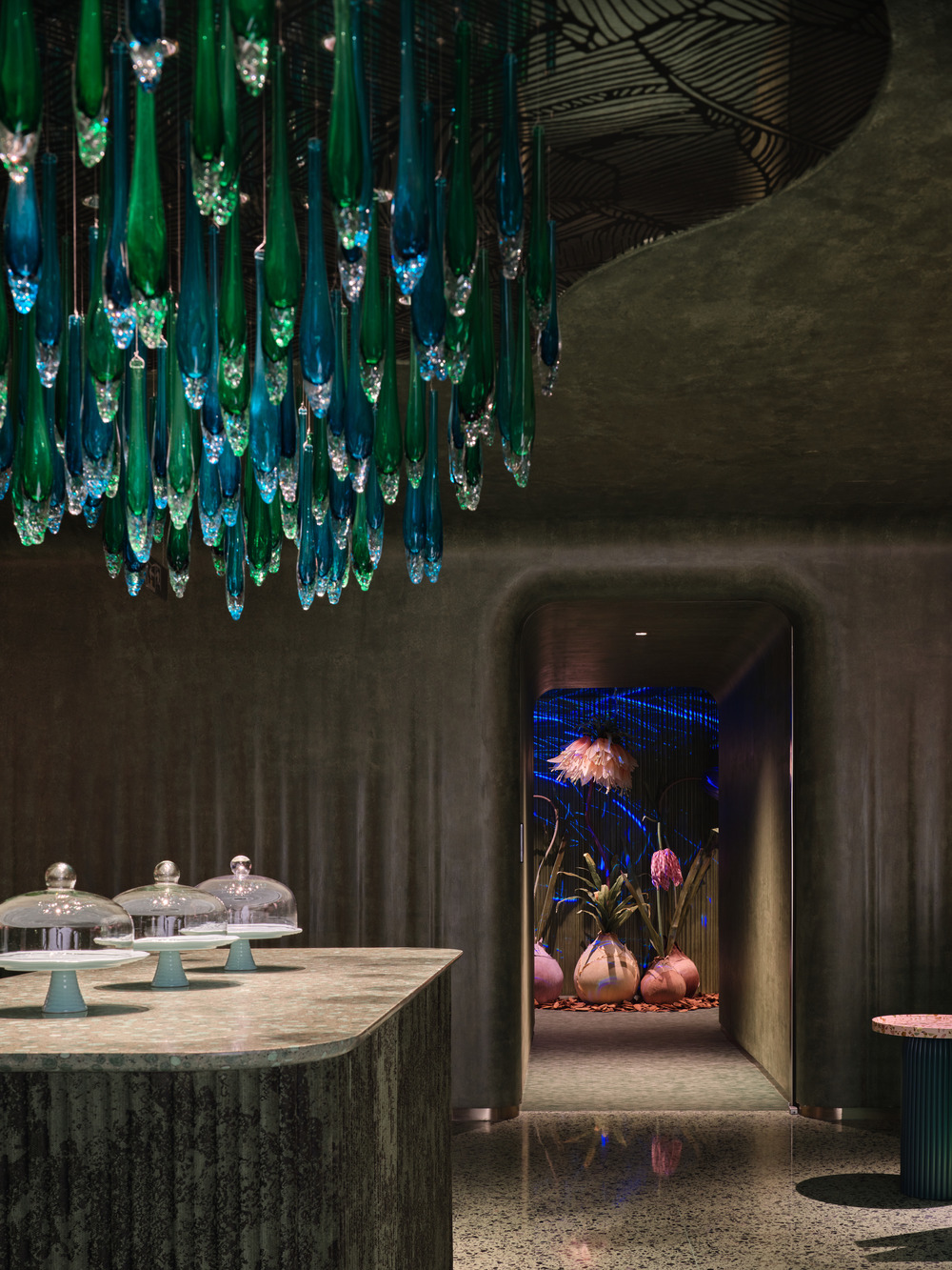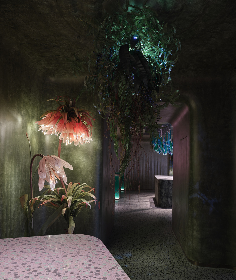 '이상한 나라의 앨리스'라는 이야기에서는 모자장수와 손님들이 정원에서 애프터눈 티를 마시고 있는 모습이 대기 공간이라는 개념에 힘을 실어준다. 손님의 감각은 이미 연극에 몰입되어 있다. 마사지 공간의 흔들리는 반딧불은 매혹적인 꽃들의 더 깊은 미로로 안내한다. 그라데이션 조명은 동굴의 무대 스포트라이트가 된다. 불규칙한 거울은 다시 한번 꿈같은 세계의 환상적인 느낌을 반영한다.