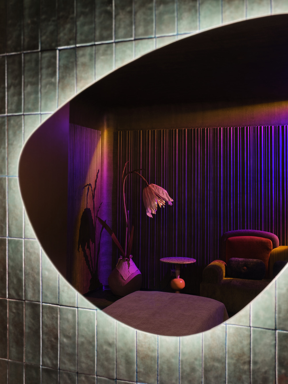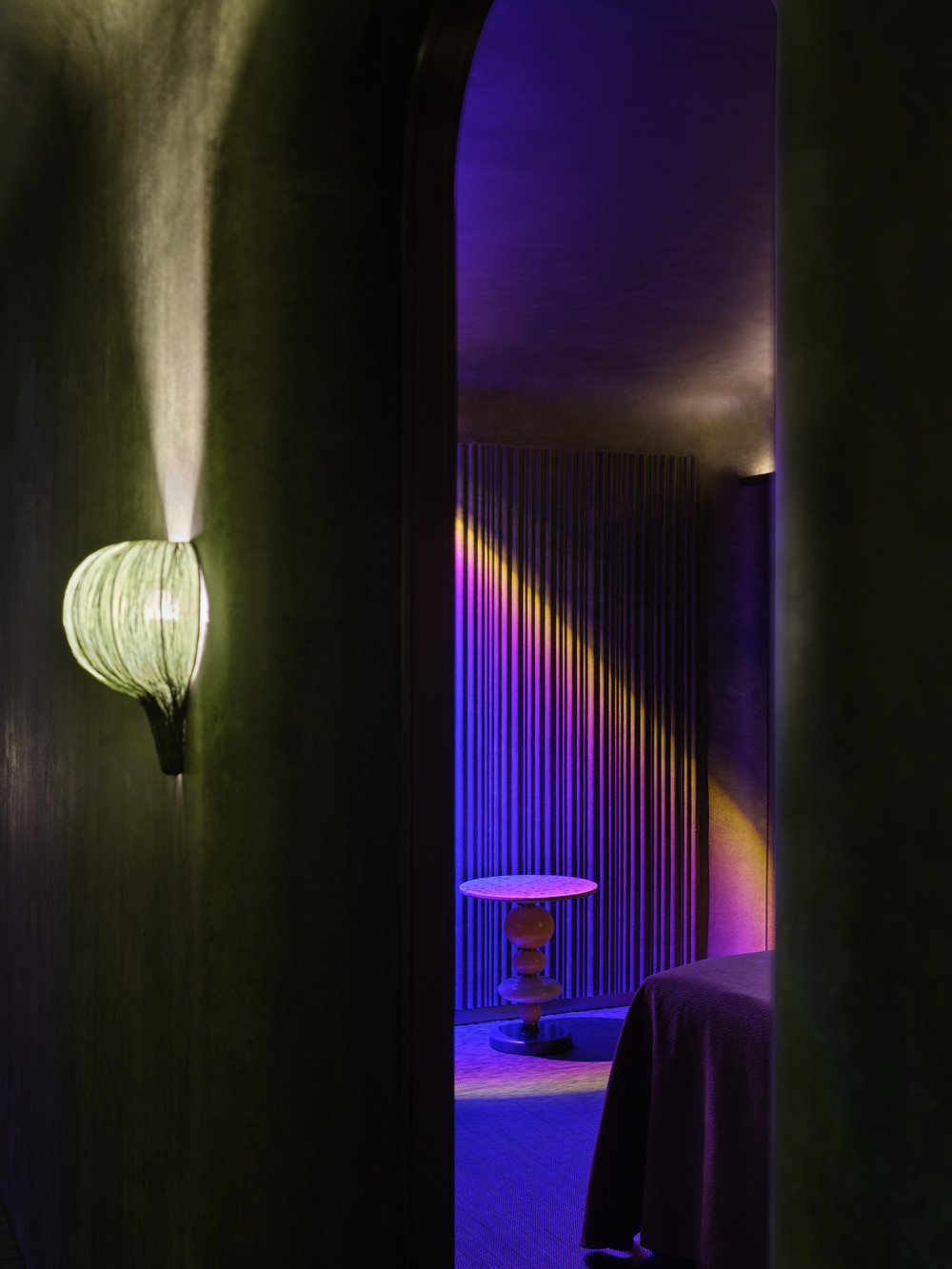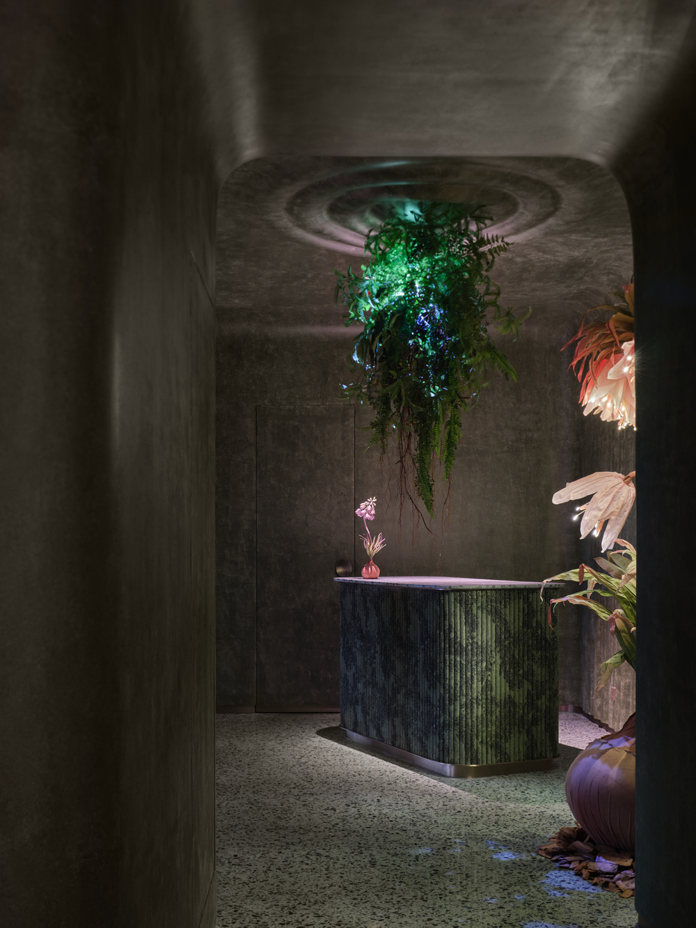 ‘Green massage’ Madang Road, is in the comprehensive commercial property of a prominent big red building in the center of Shanghai, designed by Jean Nouvel. When you enter the building from the street, you are instantly immersed in this special environment. But the massage space is devoid of the type of bright lights or large open windows of surrounding restaurants. A quiet and relaxing atmosphere is the basic tone of the massage space. The store is not in a particularly conspicuous place, located on the open second basement floor, so we turned the defect into an advantage, creating the entrance just as the “rabbit hole". We covered the entrance with large green plants, lit by glowworm lights. Upon entering the cave, dim lights and oversized fantasy flowers lead you into the garden area.