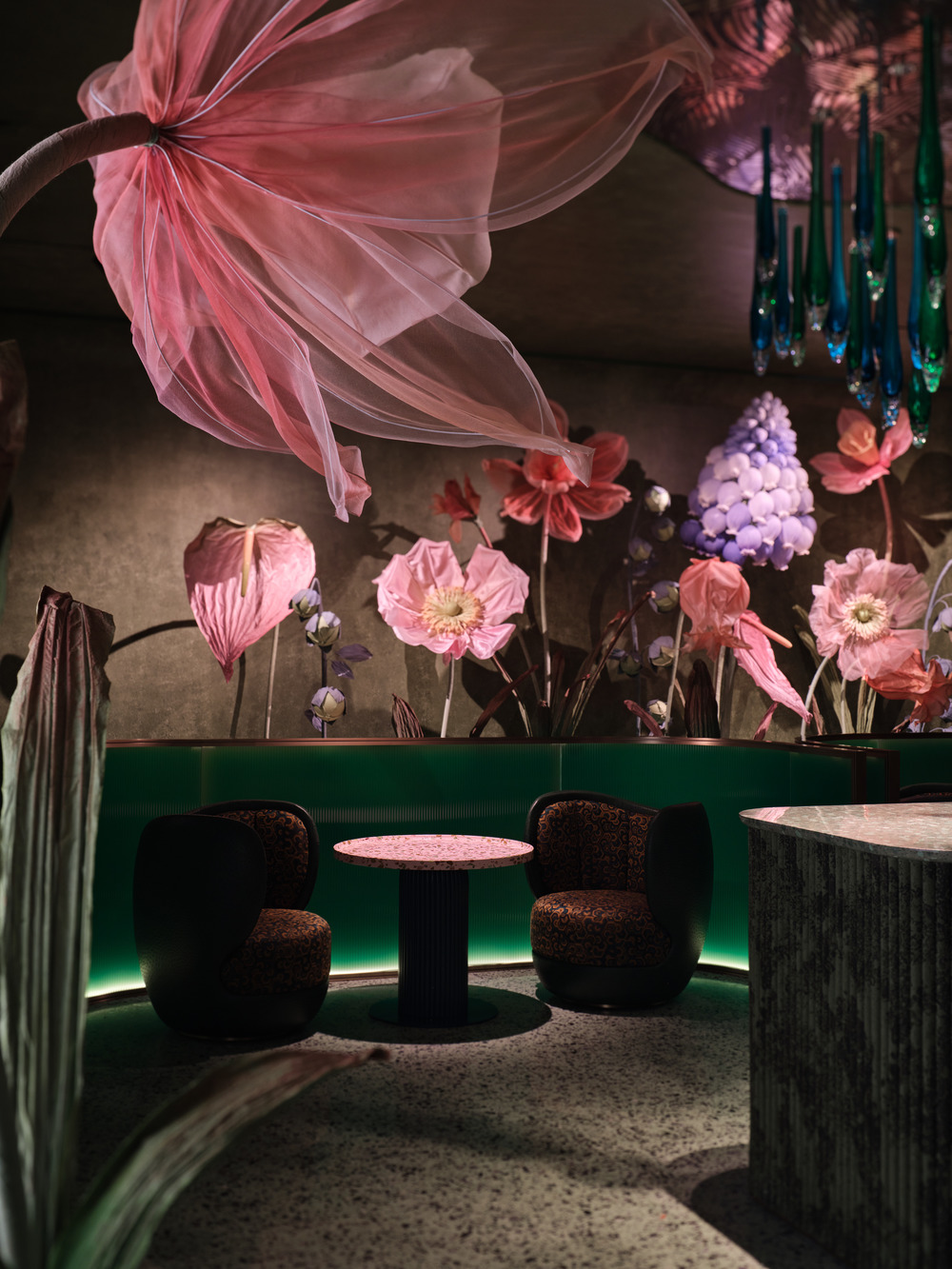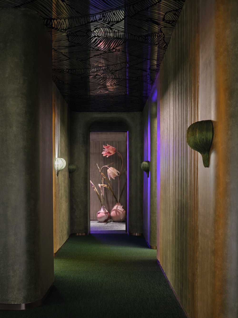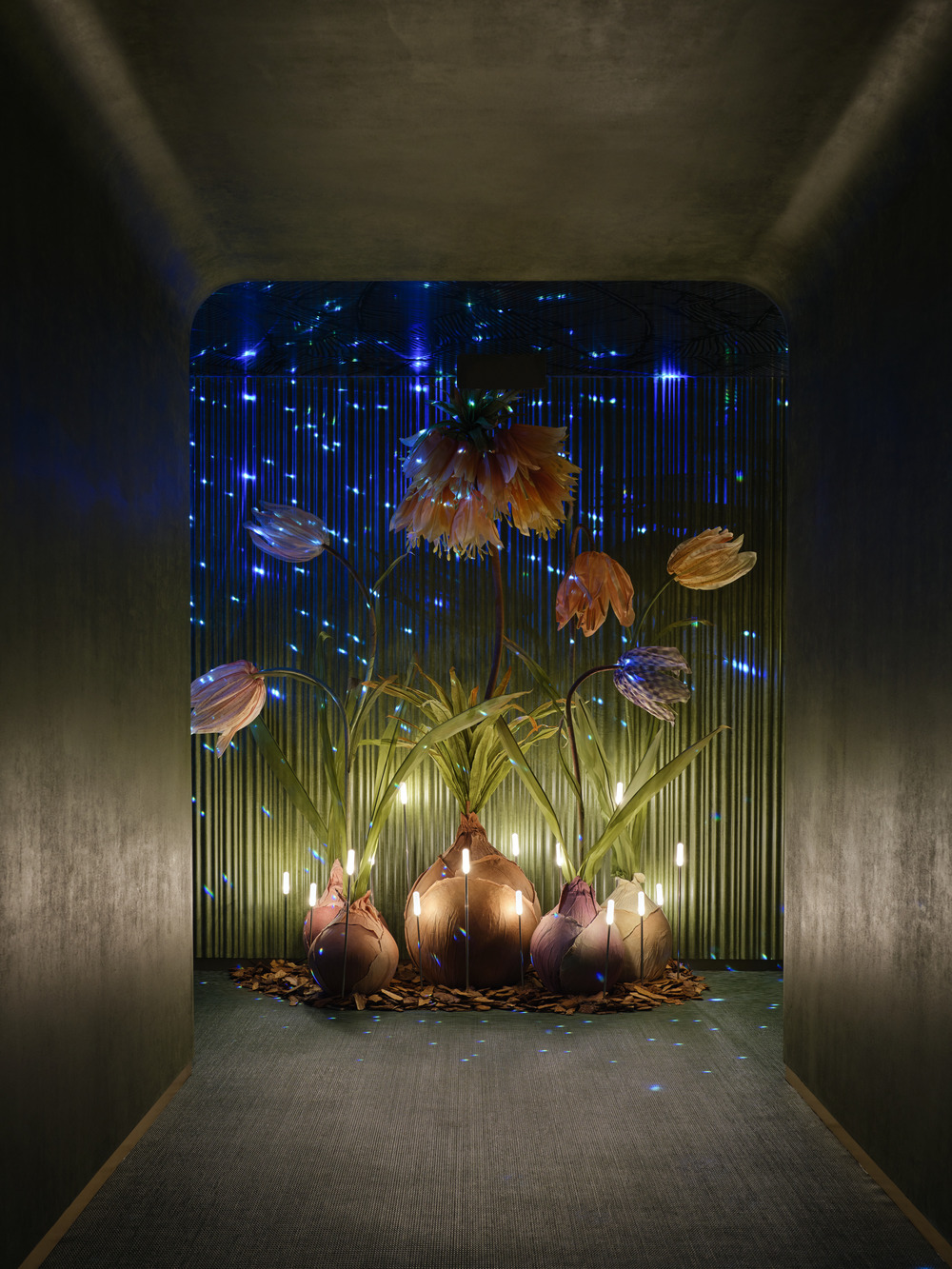 '이상한 나라의 앨리스'라는 이야기에서는 모자장수와 손님들이 정원에서 애프터눈 티를 마시고 있는 모습이 대기 공간이라는 개념에 힘을 실어준다. 손님의 감각은 이미 연극에 몰입되어 있다. 마사지 공간의 흔들리는 반딧불은 매혹적인 꽃들의 더 깊은 미로로 안내한다. 그라데이션 조명은 동굴의 무대 스포트라이트가 된다. 불규칙한 거울은 다시 한번 꿈같은 세계의 환상적인 느낌을 반영한다.