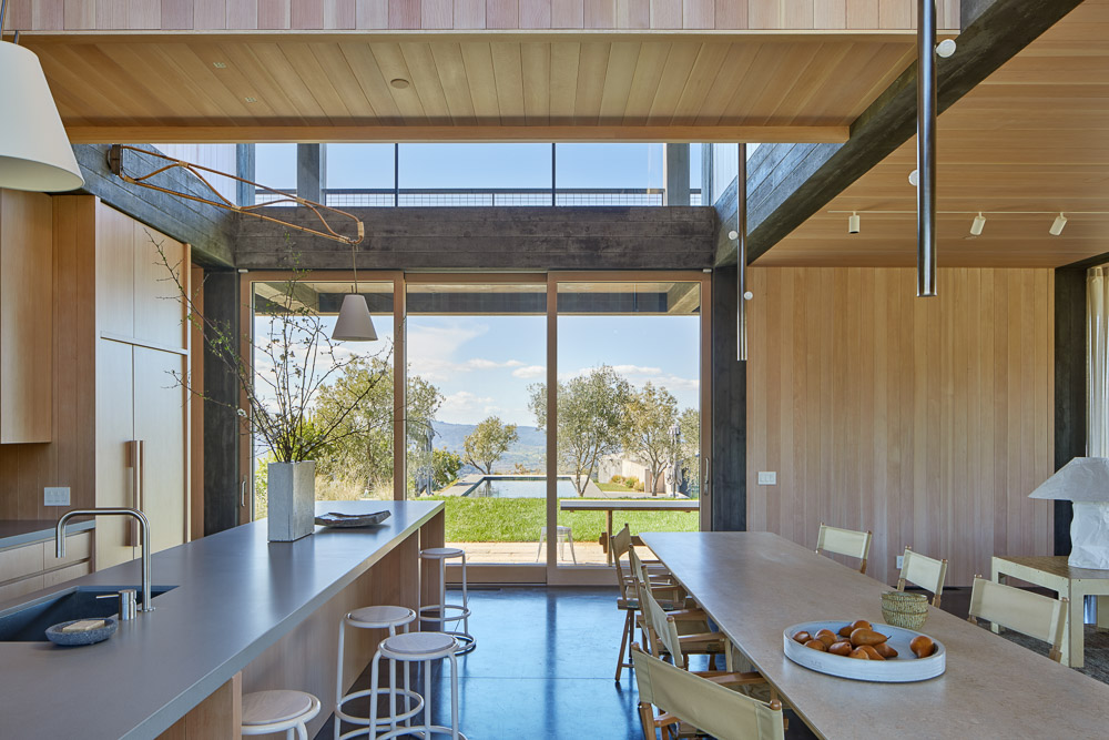 A concrete framework establishes the structure and rhythm of Frame House, a residence atop a hill in the Sonoma countryside. Rooted on a plateau above a forested canyon and vineyards, this structural grid maximizes the connection between the inside and out, allowing for natural light and direct access to the exterior from almost every room in the house. The loggia, which wraps three sides of the house’s perimeter, shades the living spaces below, and provides access to expansive views from the second level decks. The materials of the house are organic and rustic in their appearance and tactility, while providing resilience against the threat of the wildfires which have become prevalent in the Sonoma valley and damaged the previous residence on the site. To protect the new home, concrete shear walls are clad in a sacrificial layer of greying wood siding between the columns, which also organize the interior spaces. This rigorous concrete framework creates a perch from which to take in the vistas of the property and beyond. In contrast to the exterior of the house, clad in a fire-proof armor, the warm interiors are lined in Douglas Fir. The house has an extroverted relationship to the surrounding landscape, connecting the interior in almost every room to the California climate. On the inside, the home is organized around a double height space over the kitchen that connects the two levels and is punctuated by a floating catwalk leading to the two bedroom wings upstairs. The program of the house contains 4 bedrooms, 4.5 baths, media room, and great room with interior furnishings curated by The Office of Charles de Lisle. The 18 acre property includes a 3 bedroom, 3 bath all concrete guesthouse also designed by Mork-Ulnes Architects and with interior by Charles de Lisle. The garden, vegetable beds, and pool were designed by Surface Design.
