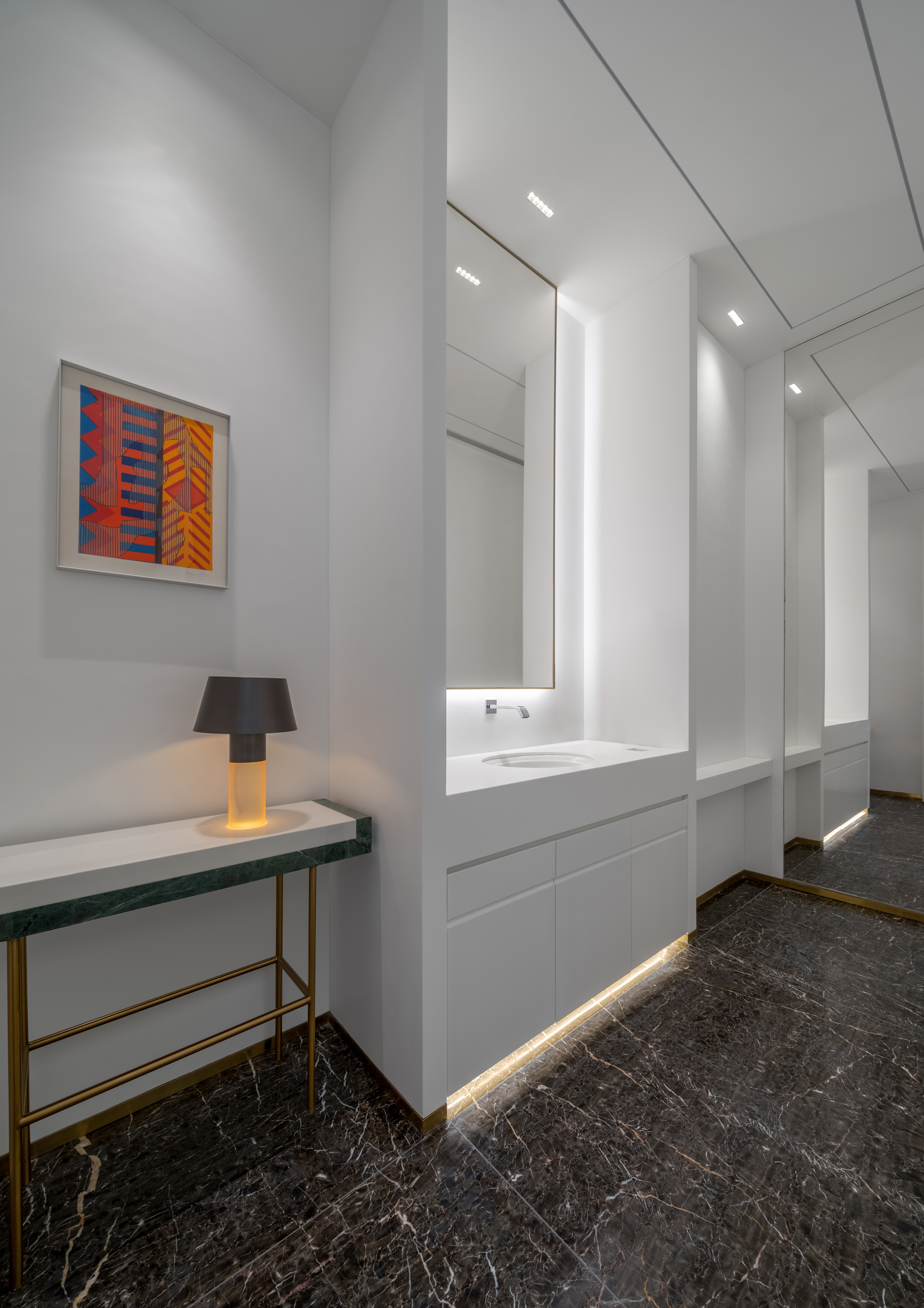디자인은 사용자의 경험을 충분히 고려했다. 전체적인 공간은 미니멀한 미학을 드러낸다. 흰색 표면, 선, 빛과 그림자의 조합은 평화롭고 편안한 분위기를 만들어 기존 치과 진료소에서 가져오는 우울과 불안을 없애준다. 로비와 리셉션 공간에는 기하학적 미학을 적용해 엄격한 기하학적 질서가 감성적인 공간을 연출한다. 흰색 대리석과 베이지색 석재가 심플하고 깔끔한 공간을 연출한다. 벽 중앙의 조각된 개구부는 마치 입체파 회화를 연상케 하며 사람들은 자연스럽게 '프레임'의 주인공이 된다. 또한, 따뜻한 조명이 편안한 분위기를 더해준다. 약간 구부러진 스크린 월은 파티션 역할을 하여 개방성과 프라이버시의 균형을 섬세하게 조절한다. 뿐만 아니라 아치형 천장은 수평적 깊이감을 강조하고 기존의 기둥과 소방 파이프를 숨겨준다. 2개의 기둥이 천장과 연결되는 부분에 라이트 스트립을 매립하여 견고함과 가벼움의 대비를 이루며 현대 조각 예술의 미학을 보여준다.