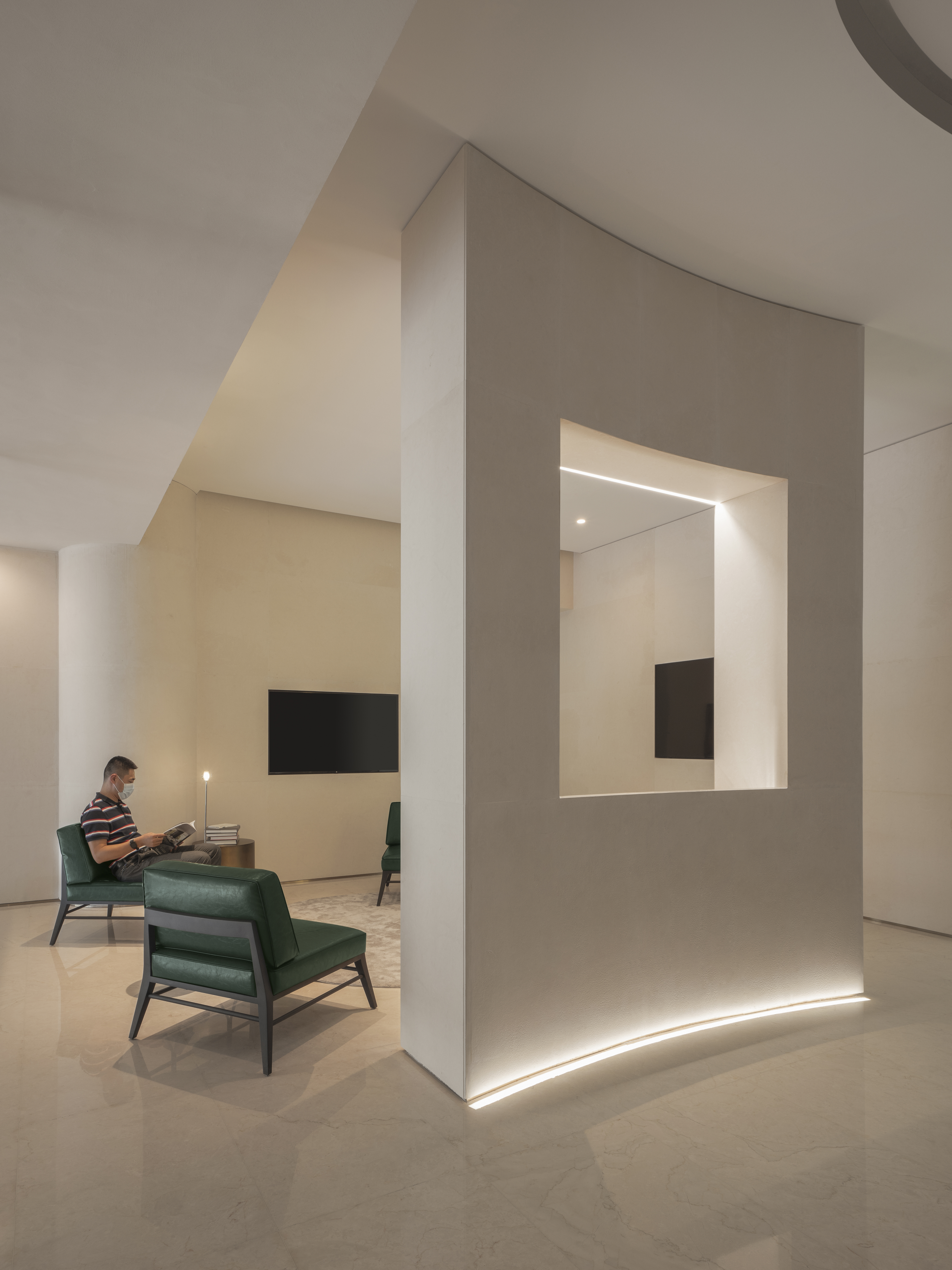 The design fully considers users' experience. The overall space reveals a minimalist aesthetic. The combination of white surfaces, lines and play of light and shadows produces a peaceful, relaxing ambience, thus dispelling the depression and anxiety brought by conventional dental clinics. Geometric aesthetics are applied to the foyer and reception area, with the rigorous geometric order producing an emotional spatial field. The white marbles and beige stone materials set a simple, clean tone in the space. The carved-out opening at the center of the wall is like a cubist painting, and people naturally become the protagonist of the “enframed view”. Moreover, the warm lighting adds to a relaxing atmosphere. The slightly curved screen wall functions as a partition, delicately balancing openness and privacy. Besides, it echoes the arc-shaped ceiling, strengthening a sense of depth for the horizontal setting and meanwhile weakening the existing columns and fire-fighting pipes. Light strip is embedded in the area where the two columns connect with the ceiling, hence creating a contrast of solidness and lightness and showing aesthetics of contemporary sculptural art.
