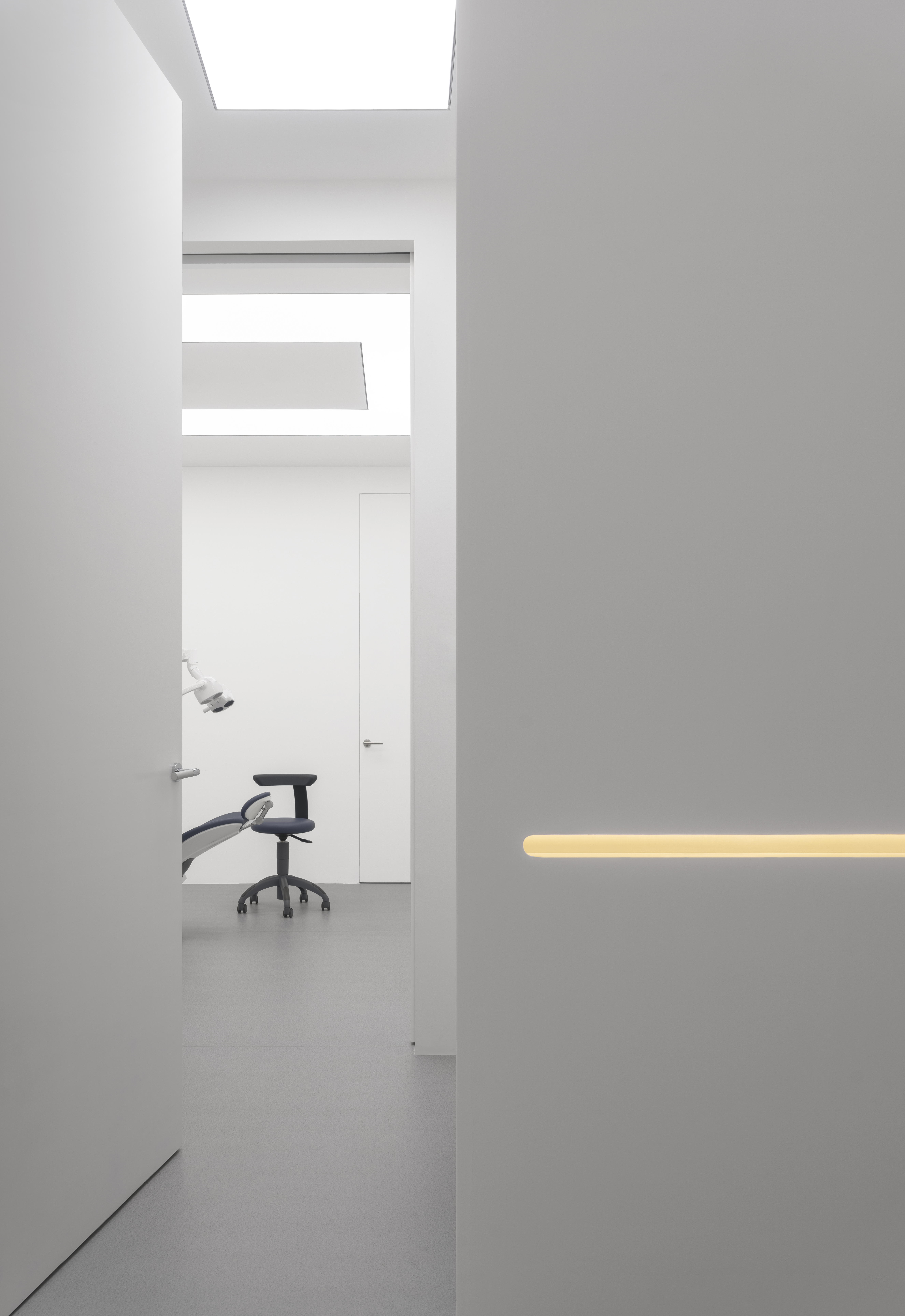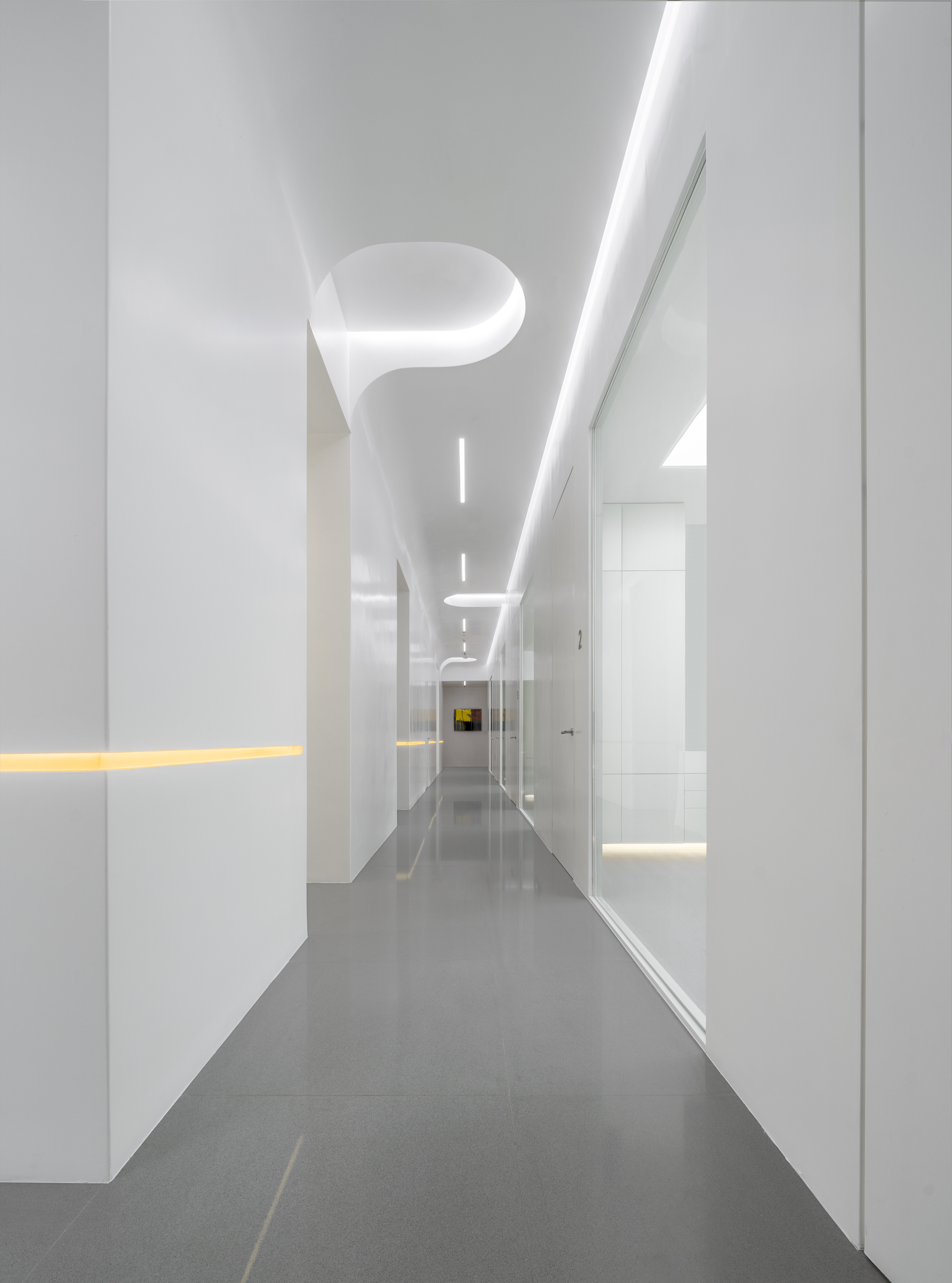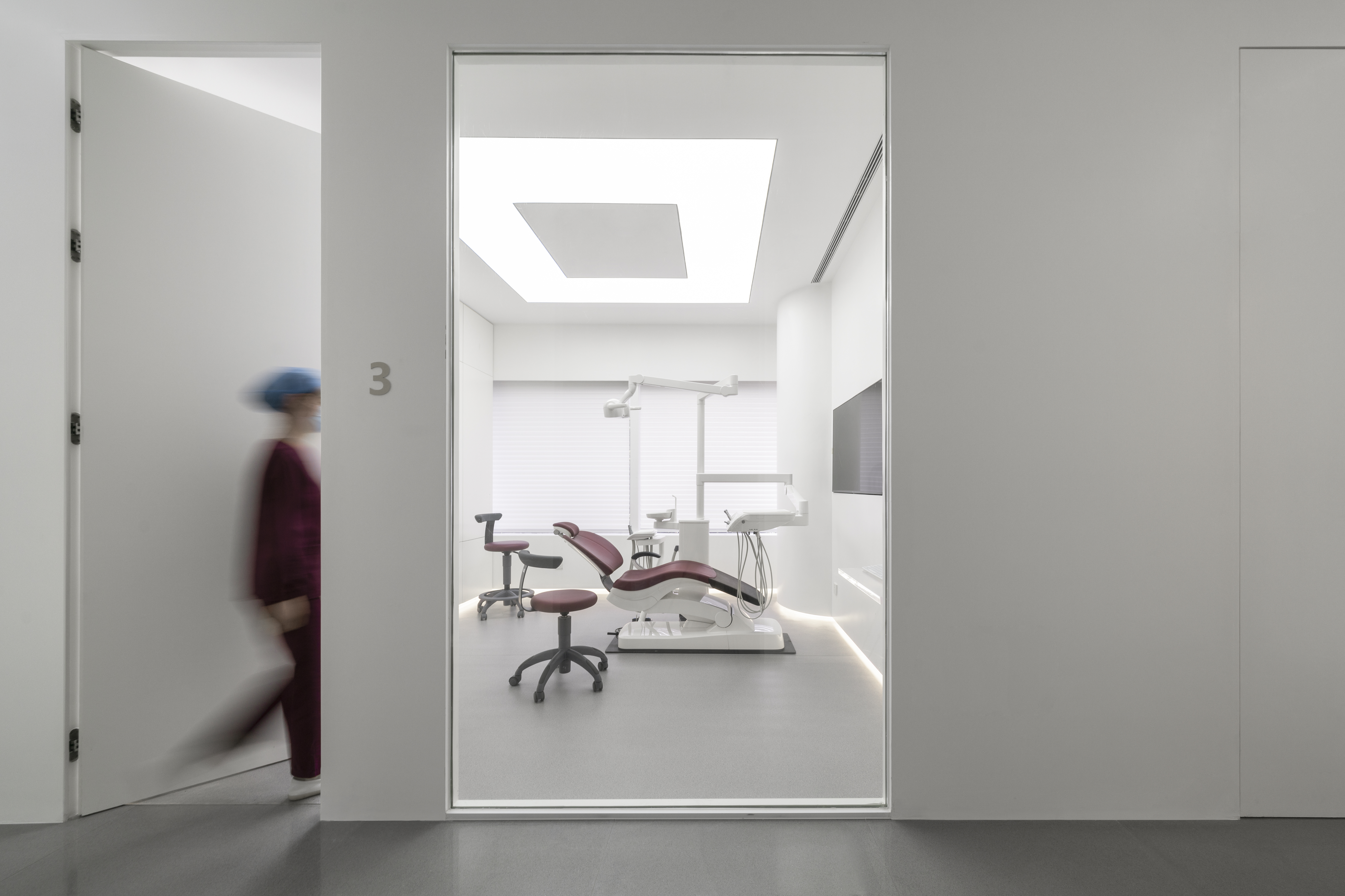 The design balances aesthetic simplicity with functional complexity. Starting from the medical attribute of this project, the main space is organized and cut in an orderly and precise manner, which efficiently accommodates professional and systematic medical functions. The design meets all the complicated specifications with a simplistic setting. By absorbing the “pure white” expressions of contemporary art gallery, the consulting & operating rooms feature a rectangular plane, and adopt flat, seamlessly connected composition to ensure an integrated, smooth circulation. The glass curtain walls bring in adequate daylight and outdoor landscapes, so as to brighten the space and remove patients’ nervousness during treatment. The professional functional area is set in an aseptic environment, with the pure “cleanness” of space complements the “complexity” of machinery and working state. Straight lines and squares from an integrated, simplistic spatial background, while dentists’ professional concentrated working status is like a piece of “artwork” in the space.