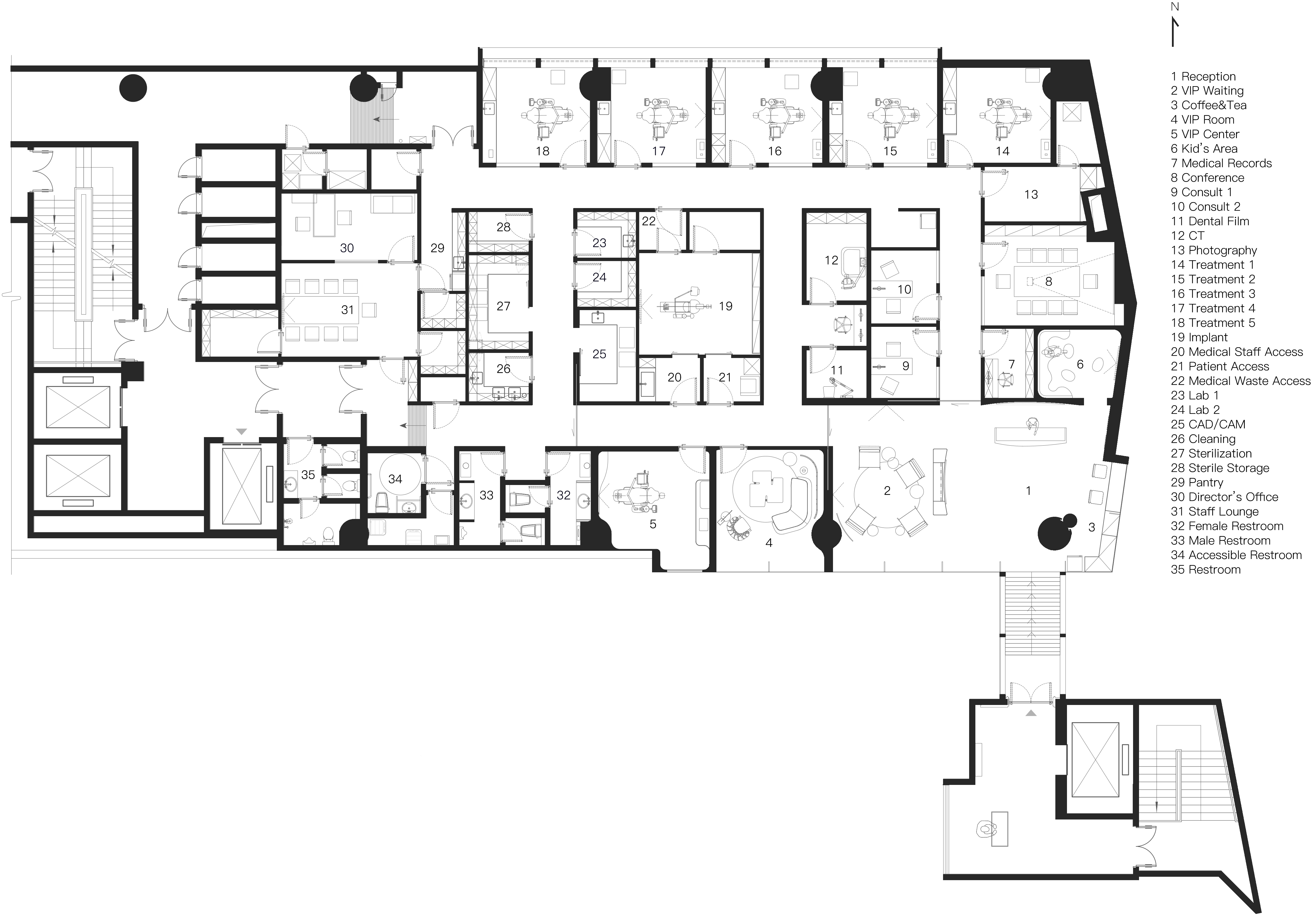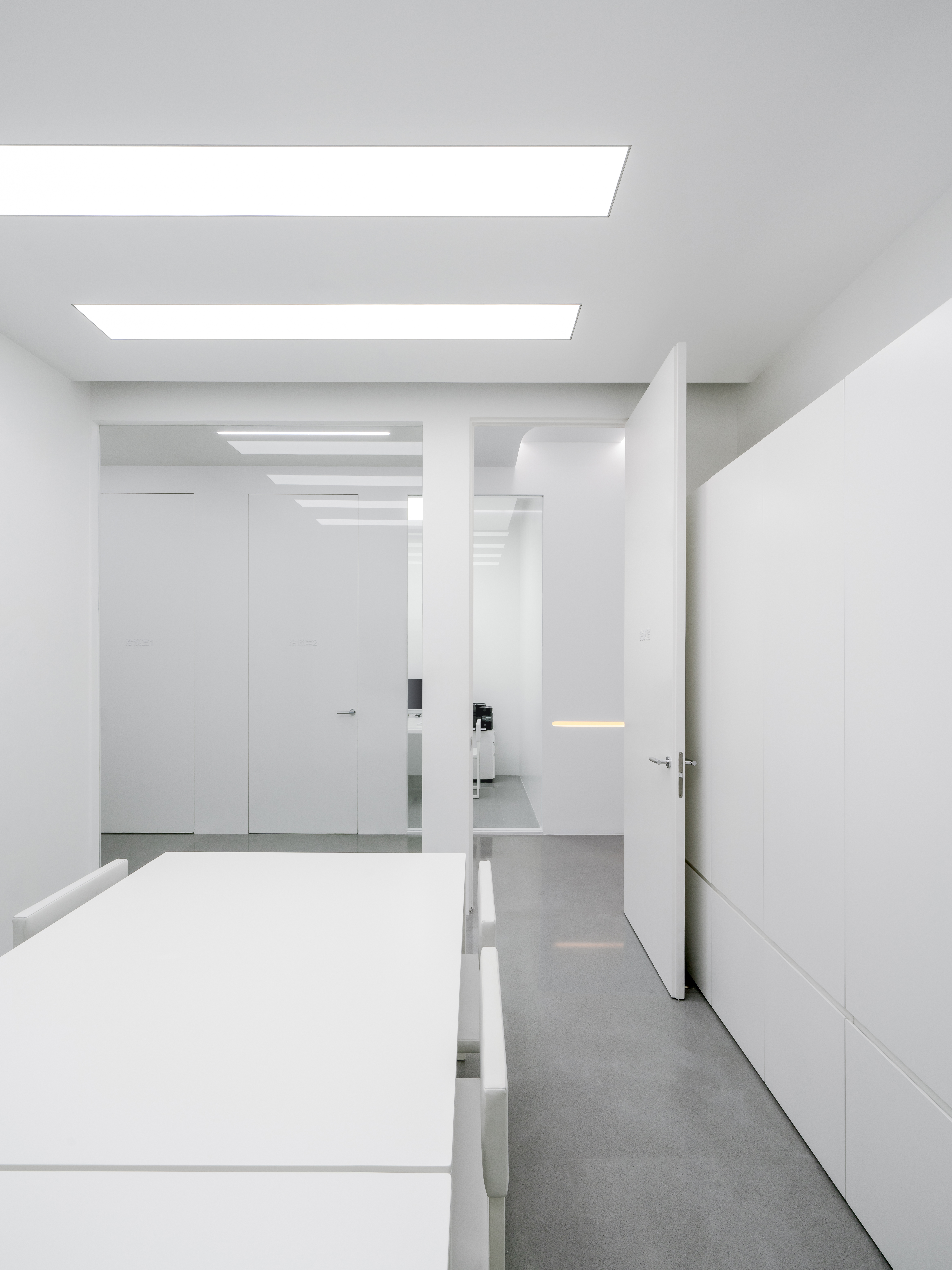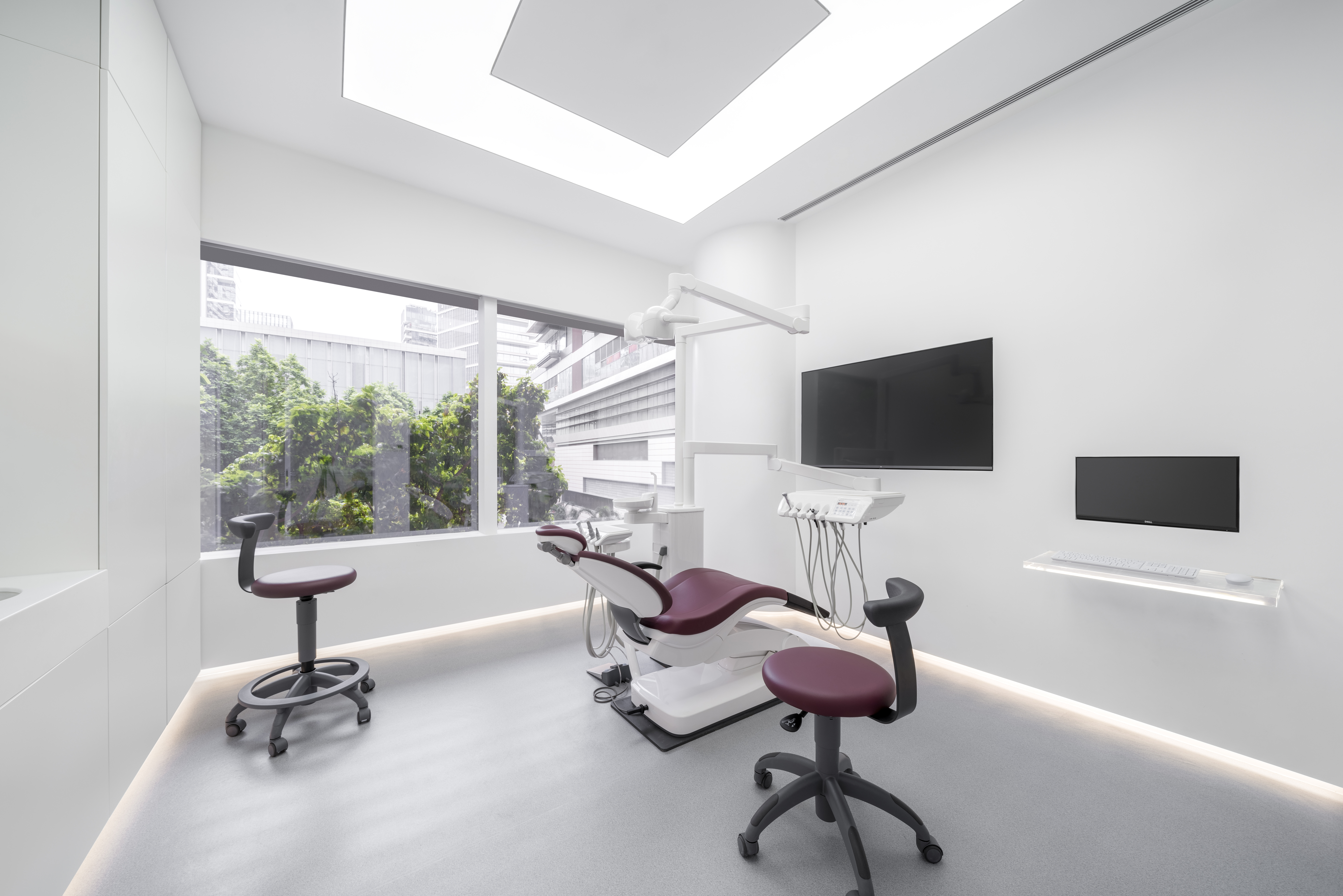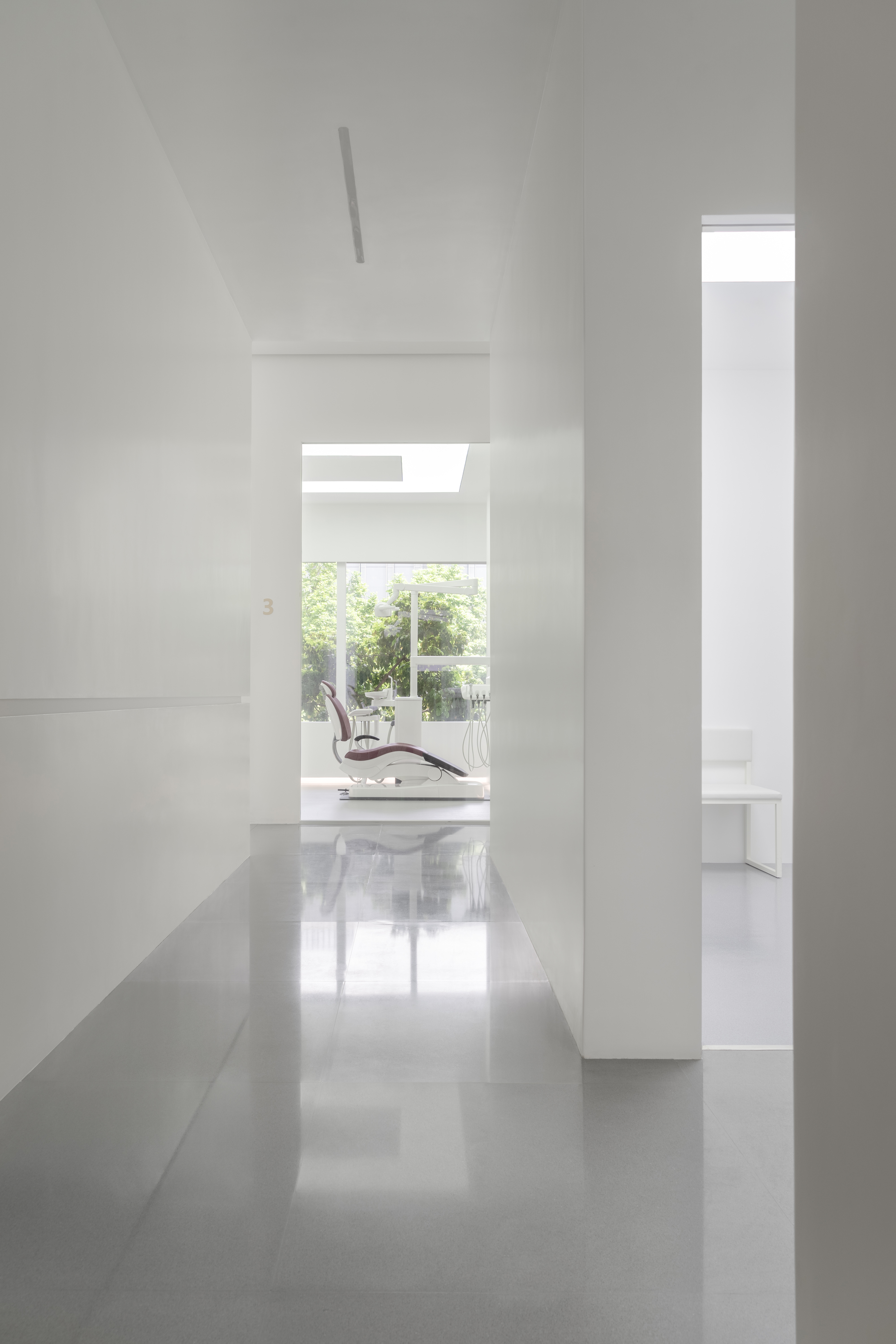 The design balances aesthetic simplicity with functional complexity. Starting from the medical attribute of this project, the main space is organized and cut in an orderly and precise manner, which efficiently accommodates professional and systematic medical functions. The design meets all the complicated specifications with a simplistic setting. By absorbing the “pure white” expressions of contemporary art gallery, the consulting & operating rooms feature a rectangular plane, and adopt flat, seamlessly connected composition to ensure an integrated, smooth circulation. The glass curtain walls bring in adequate daylight and outdoor landscapes, so as to brighten the space and remove patients’ nervousness during treatment. The professional functional area is set in an aseptic environment, with the pure “cleanness” of space complements the “complexity” of machinery and working state. Straight lines and squares from an integrated, simplistic spatial background, while dentists’ professional concentrated working status is like a piece of “artwork” in the space.