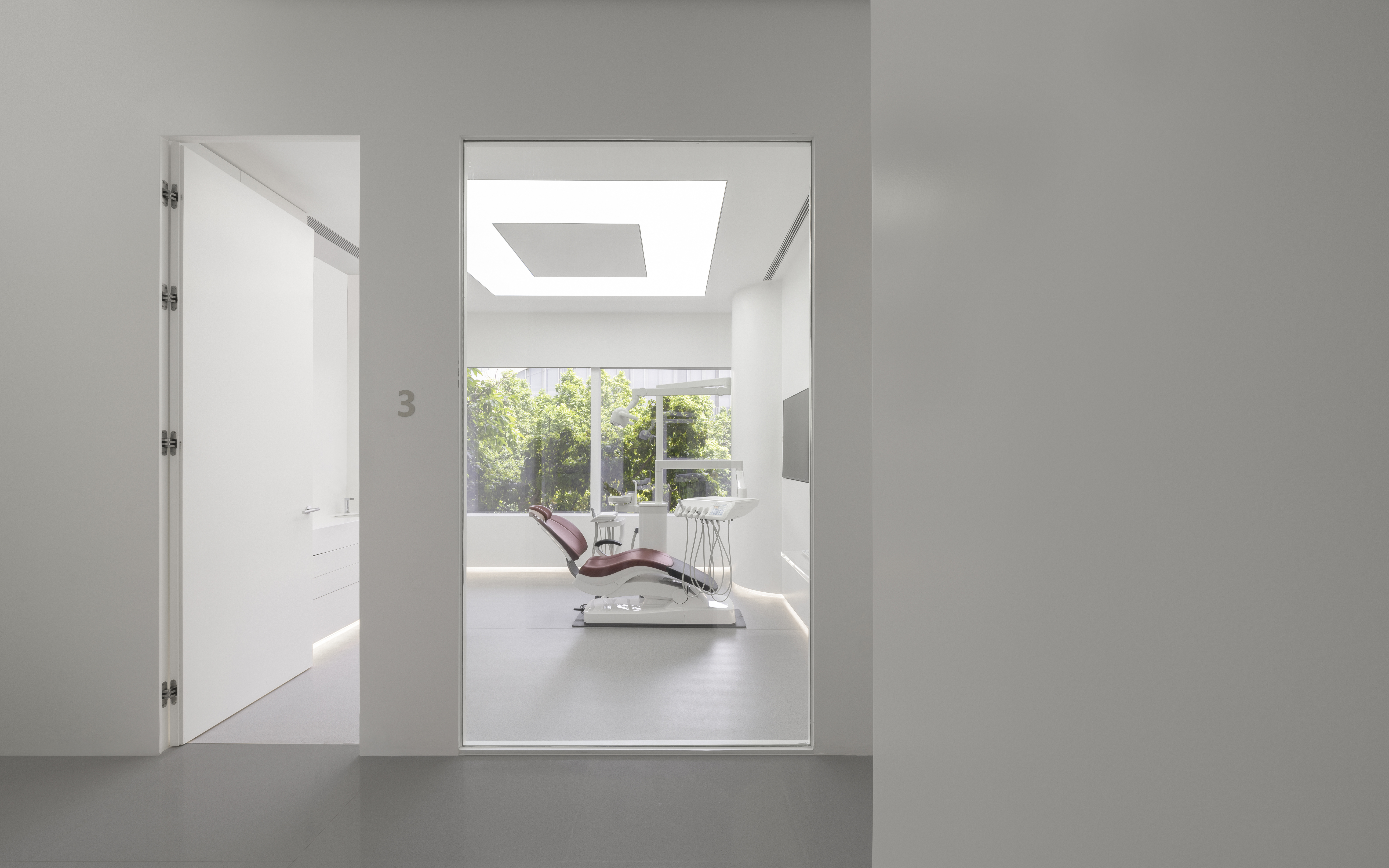 The design balances aesthetic simplicity with functional complexity. Starting from the medical attribute of this project, the main space is organized and cut in an orderly and precise manner, which efficiently accommodates professional and systematic medical functions. The design meets all the complicated specifications with a simplistic setting. By absorbing the “pure white” expressions of contemporary art gallery, the consulting & operating rooms feature a rectangular plane, and adopt flat, seamlessly connected composition to ensure an integrated, smooth circulation. The glass curtain walls bring in adequate daylight and outdoor landscapes, so as to brighten the space and remove patients’ nervousness during treatment. The professional functional area is set in an aseptic environment, with the pure “cleanness” of space complements the “complexity” of machinery and working state. Straight lines and squares from an integrated, simplistic spatial background, while dentists’ professional concentrated working status is like a piece of “artwork” in the space.