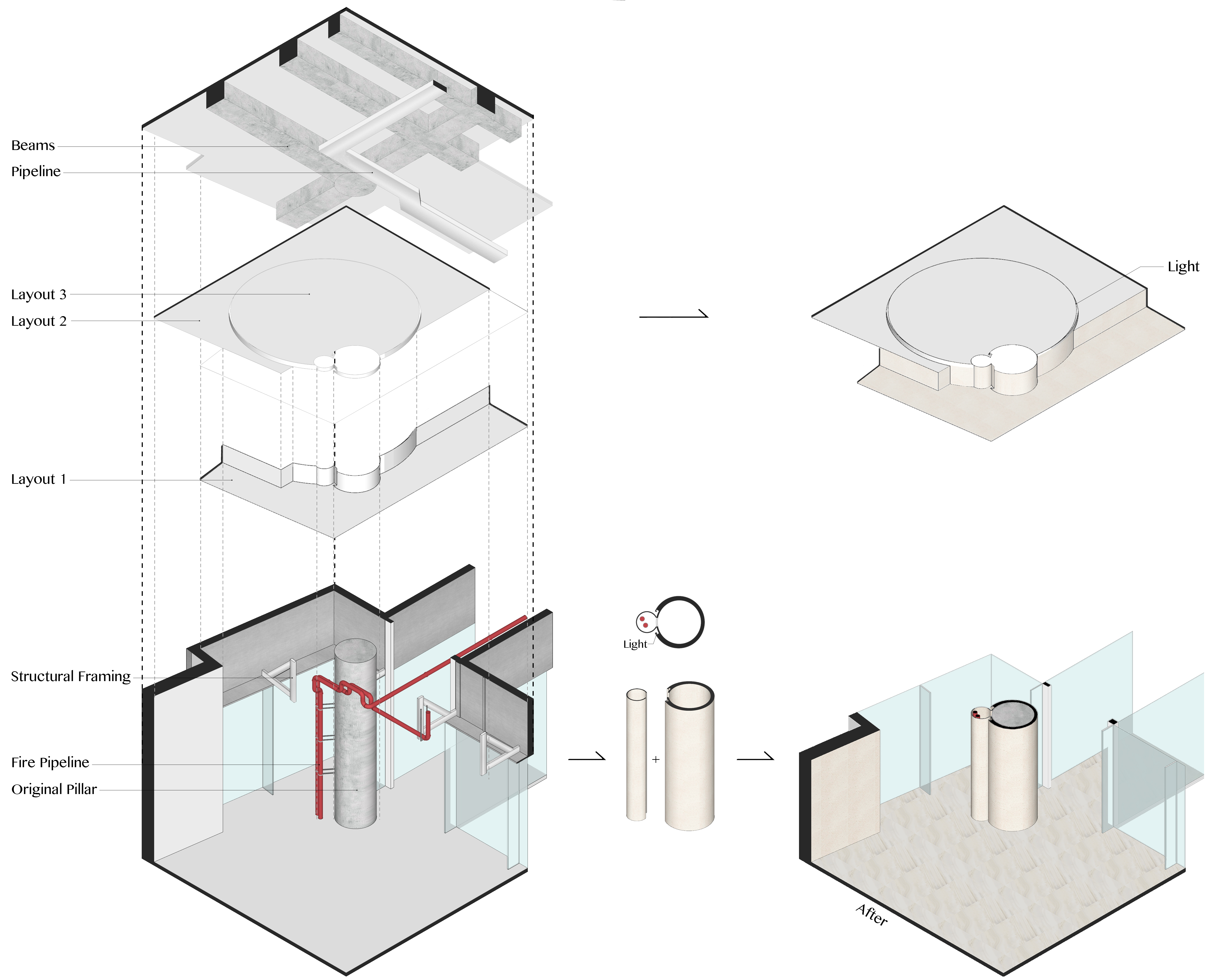 공간에는 예술적이고 인간 친화적인 디자인 뿐만 아니라 은은한 조명 표현들이 녹아있다. 전문 공간과 비전문 공간은 흰색과 따뜻한 조명으로 구분된다. 소재와 질감이 어우러진 조명의 반사는 차별화된 시각적 효과를 낸다. 벽면에 떠 있는 따뜻한 노란색 선형 조명은 기술 감각을 보여주고 순환 경로를 안내하며 독특한 감각적 경험을 제공한다.