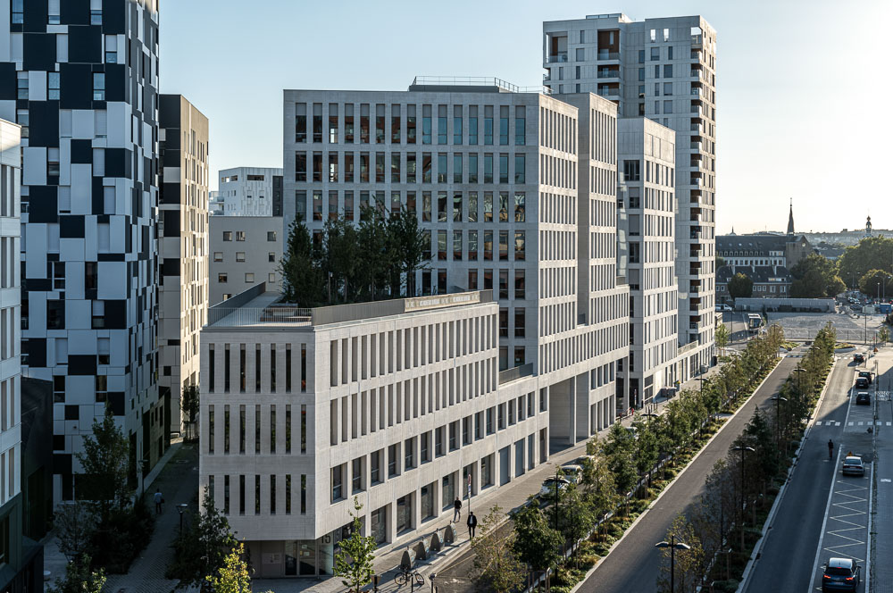 입면은 밝은 색상의 다이캐스트 콘크리트로 만들어졌으며 미네랄 성분은 이 건물에 강력한 정체성을 부여하고 건물의 수명을 보장한다. 지진대에 위치한 이 건물은 프리캐스트 콘크리트로 하중을 지지하는 구조로 되어 있다. 모든 사무실에는 햇빛을 차단하고 반사에 의해 빛을 굴절시키는 깊은 패널이 있으며, 스팬드럴로 전체를 열 수 있는 층고 높이의 유리창이 있어 작업 공간에 진정한 빛을 발하는 편안함을 보장한다. 건물은 에너지, 열 및 음향 성능뿐만 아니라 거주자의 편안함을 고려했다. 주차장은 지하 1층에 제한되며, 24면의 기계식 주차장(Bi-park)이 설치되어 두 대의 차량을 위아래로 독립적으로 주차할 수 있게 했다. 모든 사무실에는 팬드럴에 열 수 있는 완전 높이의 유리창이 설치돼 있어 햇빛으로부터 보호하고 반사되어 빛을 회수하는 깊이 있는 패널로 작업공간에서 진정한 발광 쾌적함을 보장한다.