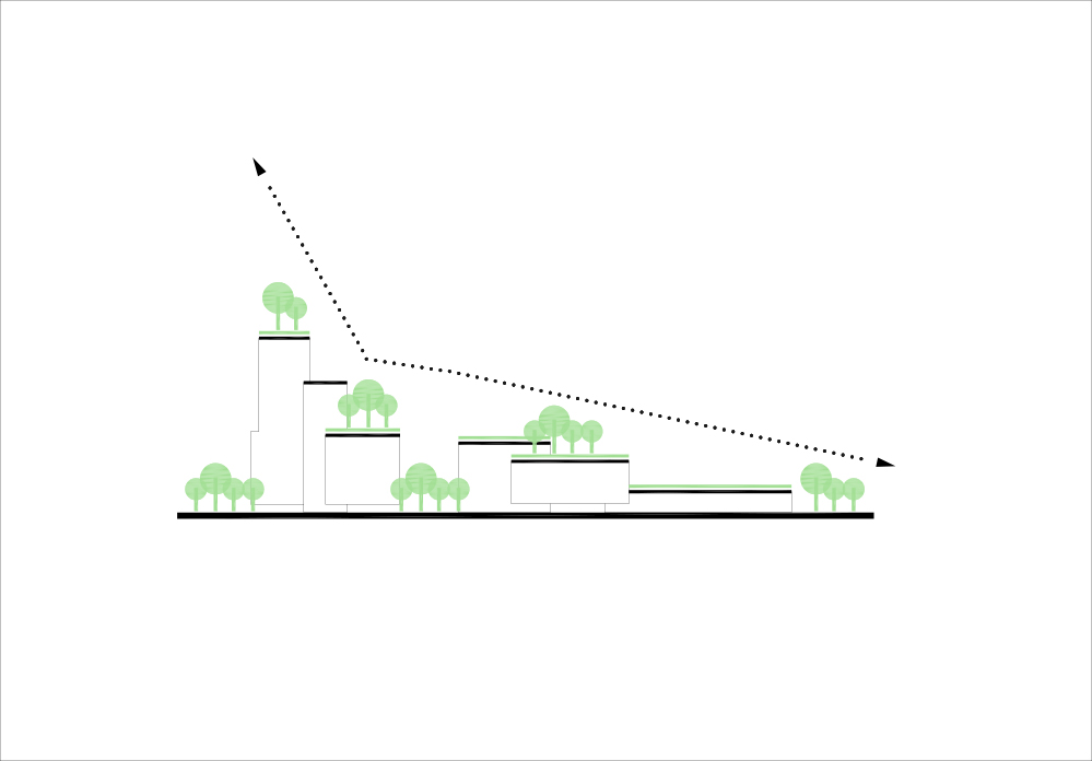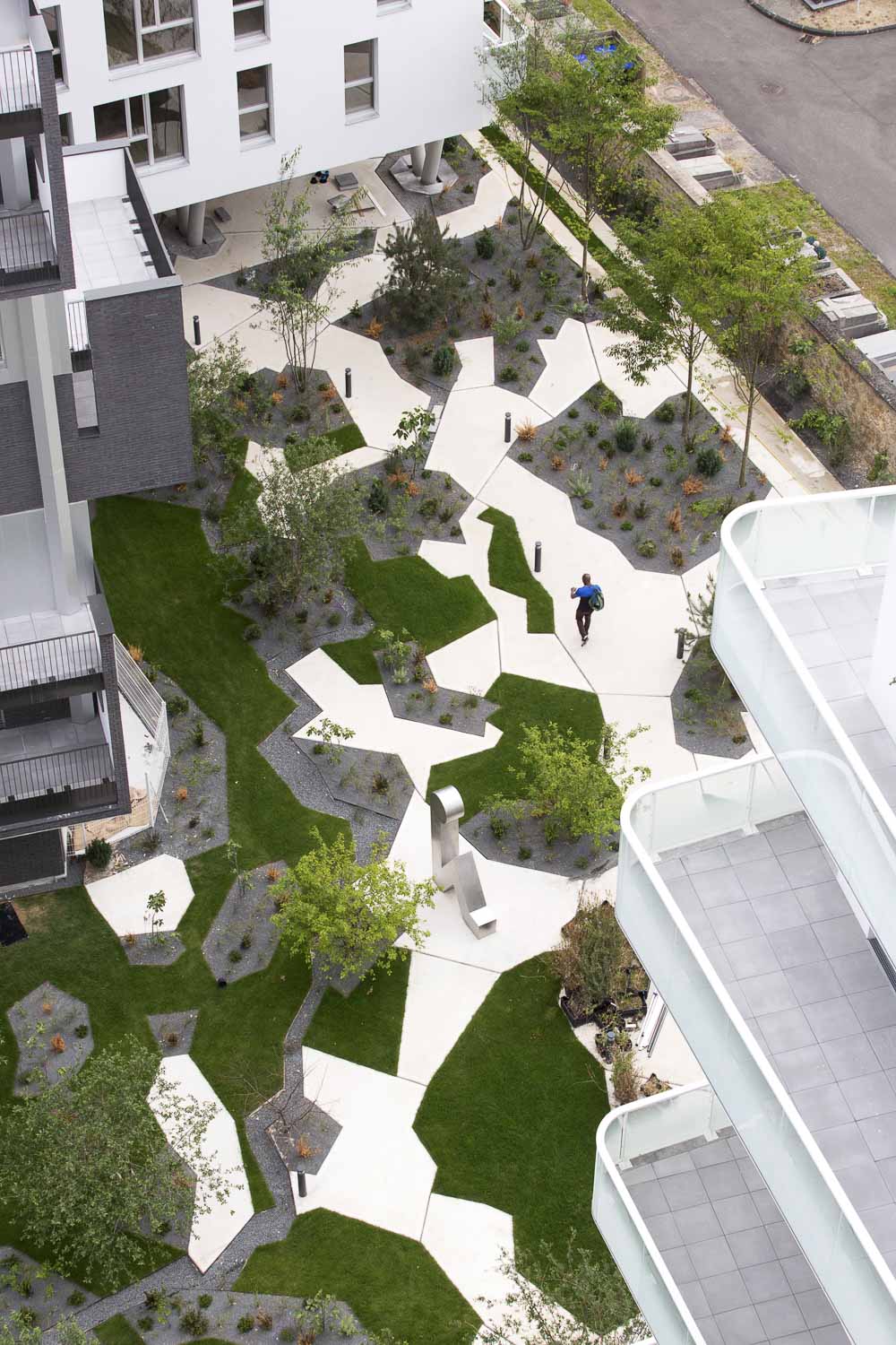 The architectural design, like a hill and its cantilevers on stilts, offers interesting technical opportunities for the vegetation of the block. This approach is an obvious factor of coherence. It allows for a close relationship between the buildings and the plantations. The whole parcel can be perceived as a very vegetal entity. The question facing the landscape designer is how to give the greatest possible presence to the vegetation while encouraging the circulation of light, views, users and water. This park is ideally exposed and offers the possibility of a welcoming collective space for the neighbors in the center of the parcel. The green roofs are places for small-scale pleasure farming.
